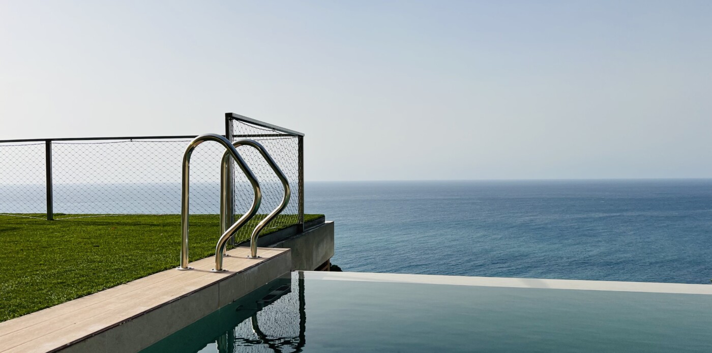 A notable feature is the elevated pool area, comprising a 100-square-meter terrace and a 30-square-meter infinity pool. This space is designed to offer views of the coastline and sunsets, while set against a backdrop of the surrounding hillside.