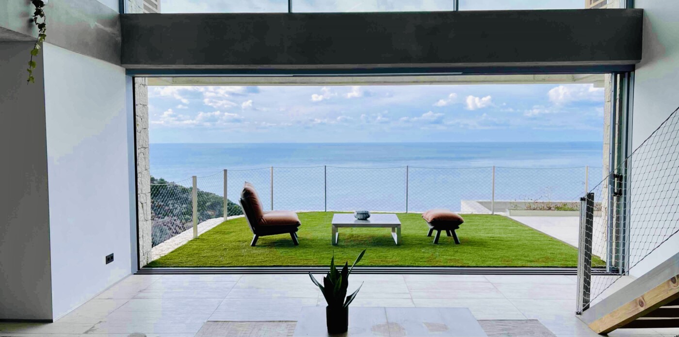 Floor-to-ceiling windows in the open-plan living area visually extend the villa’s space to incorporate expansive views of the Ionian Sea and the setting sun, creating a unified living experience.