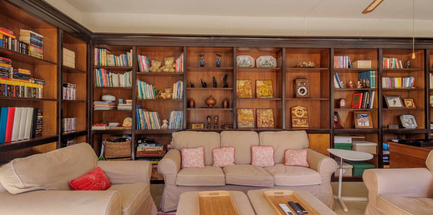 Beautifully appointed reception areas—a welcoming sitting room with a fireplace, an elegant dining room, and a quiet library—create a warm and inviting atmosphere. Large garden-facing windows frame the greenery and allow abundant natural light to flow through each space.
