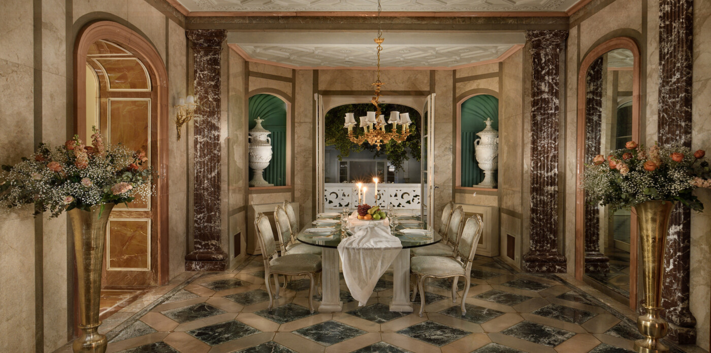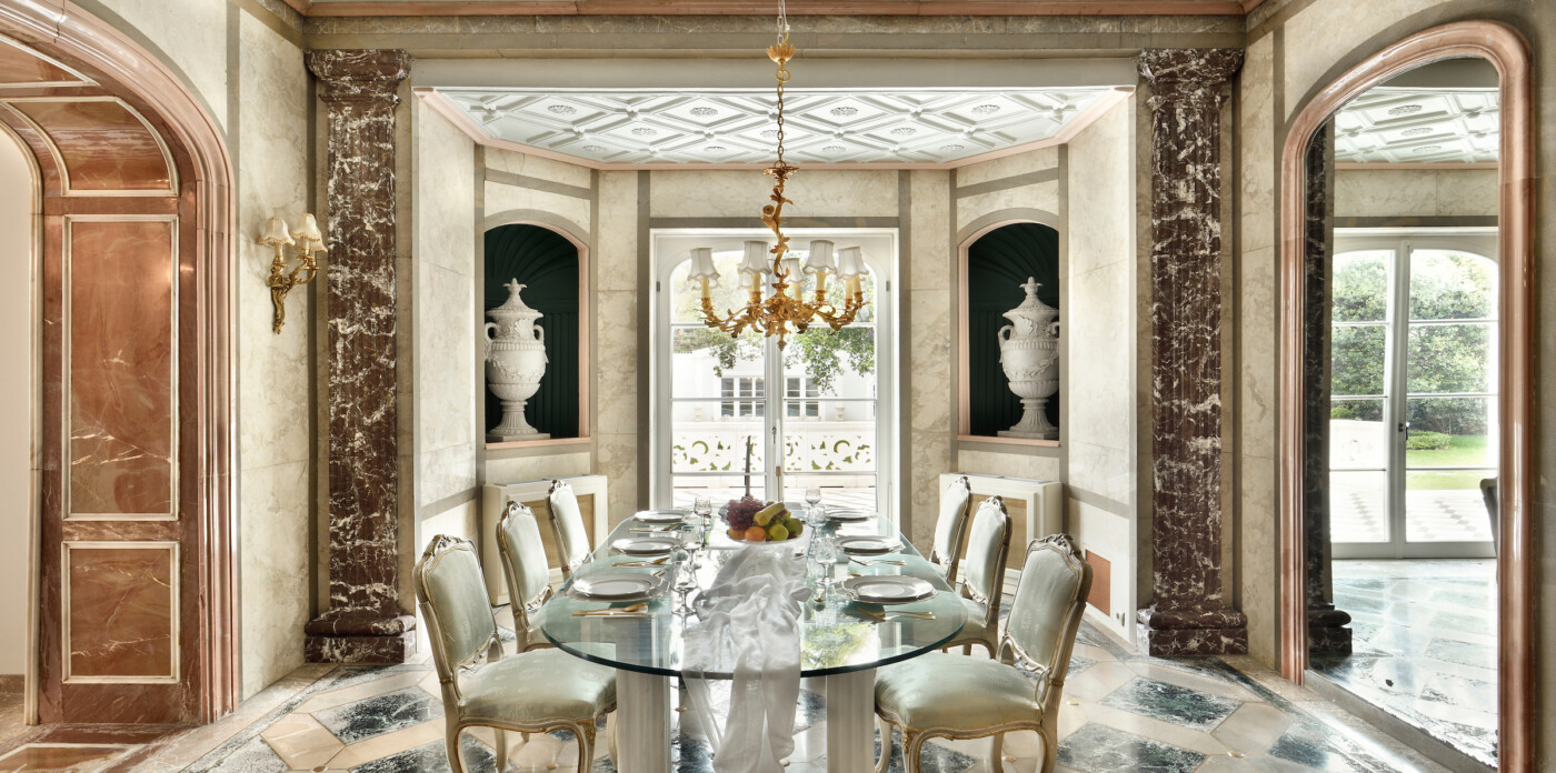 The main residence begins on the ground floor where voluminous reception areas feature high ceilings, multiple living and dining spaces, a grand study, and a fully equipped kitchen with breakfast area and pantry. French-style glass doors open onto an elegant marble terrace, offering tranquil views of the landscaped garden and pool.