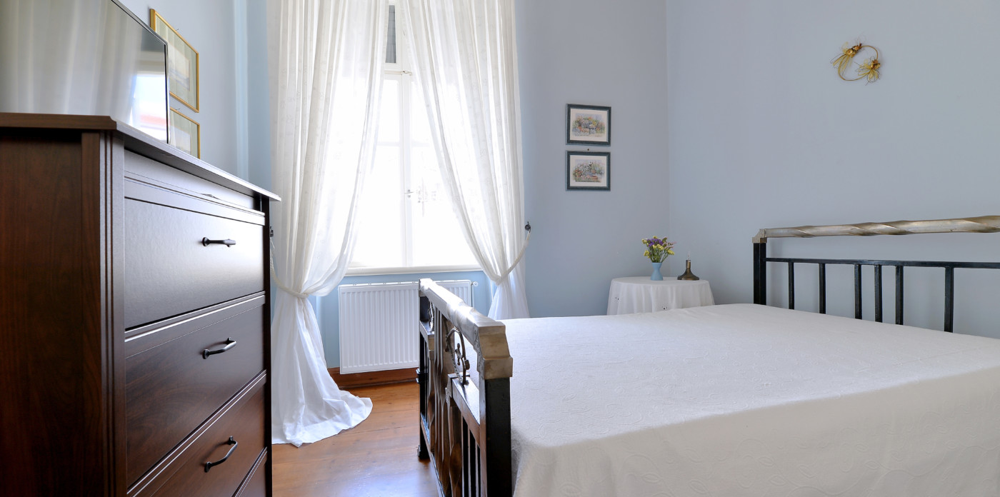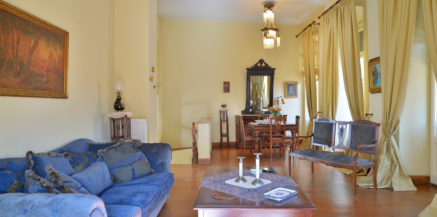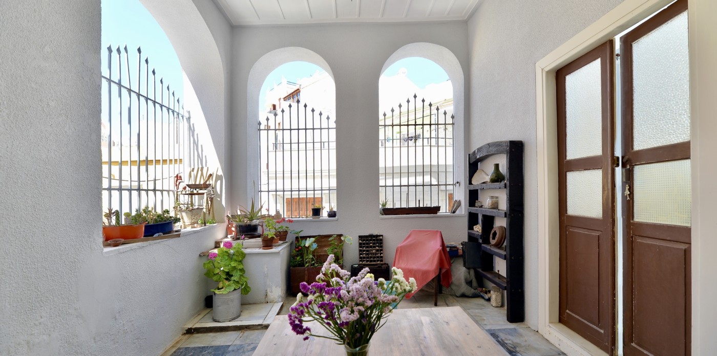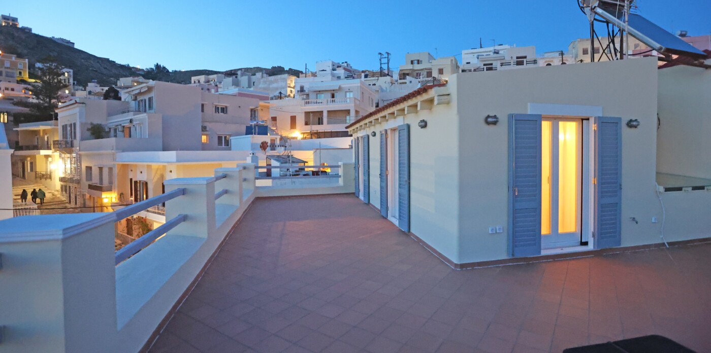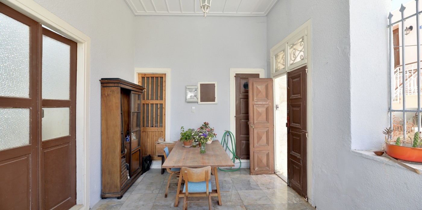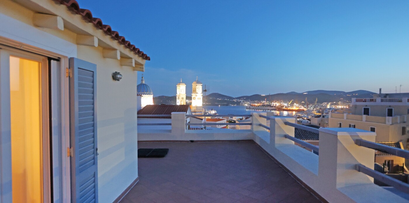 The spacious ground level residence enjoys light-filled rooms comprising two bedrooms and 1 ½ baths. It opens out onto a quaint covered courtyard. One level up is the second residence. Immediately noticeable are the four meter high ceilings with hand-painted ornamental details and the beautifully restored original wooden floors. This residence features three marble balconies with handcrafted wrought iron railings. An internal staircase leads up to the rooftop, a recent addition, which can be used as a guest suite, art studio or just a space to retreat to. The terrace offers postcard views of Syros harbor and the nearby islands of Mykonos, Delos and Tinos that are impressive any time of day and night.