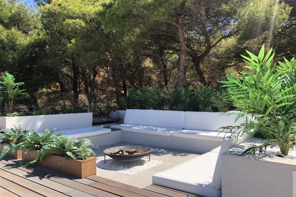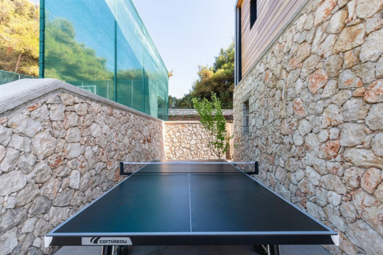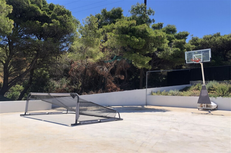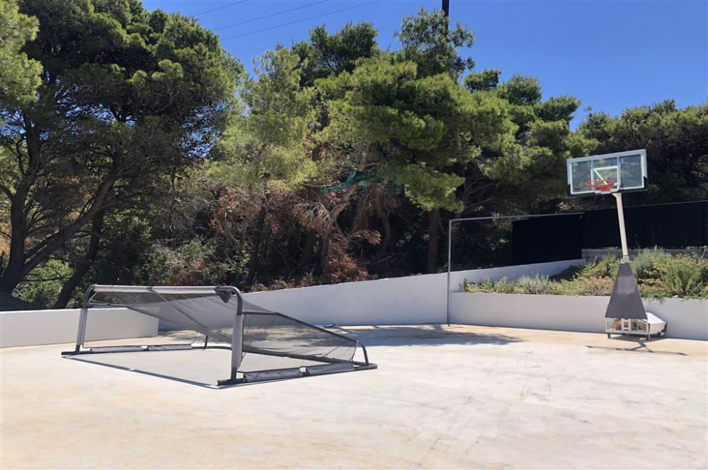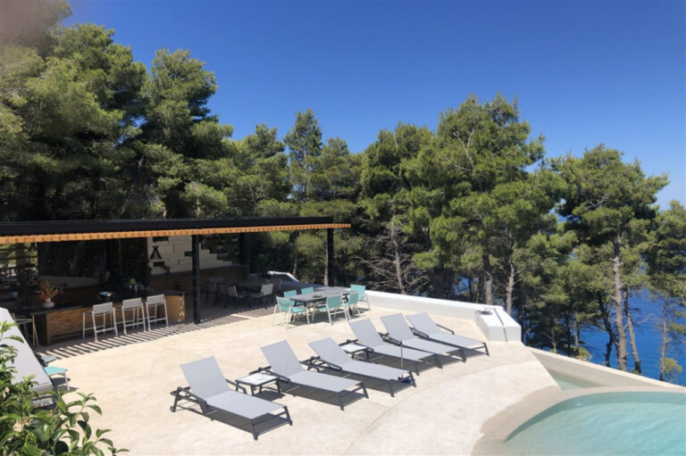 Outside, multi-level terraces are arranged around two swimming pools: a 16-metre infinity pool oriented toward the sea and a curved, beach-style pool designed for more relaxed use. Outdoor living areas include shaded dining spaces, a fully equipped kitchen with BBQ and pizza oven, and a sunken lounge with a fire pit.