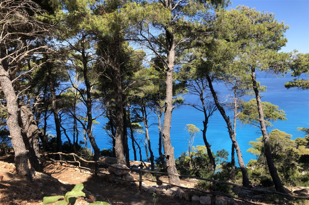 A picturesque path through fragrant woodland leads toward the blue sea below.