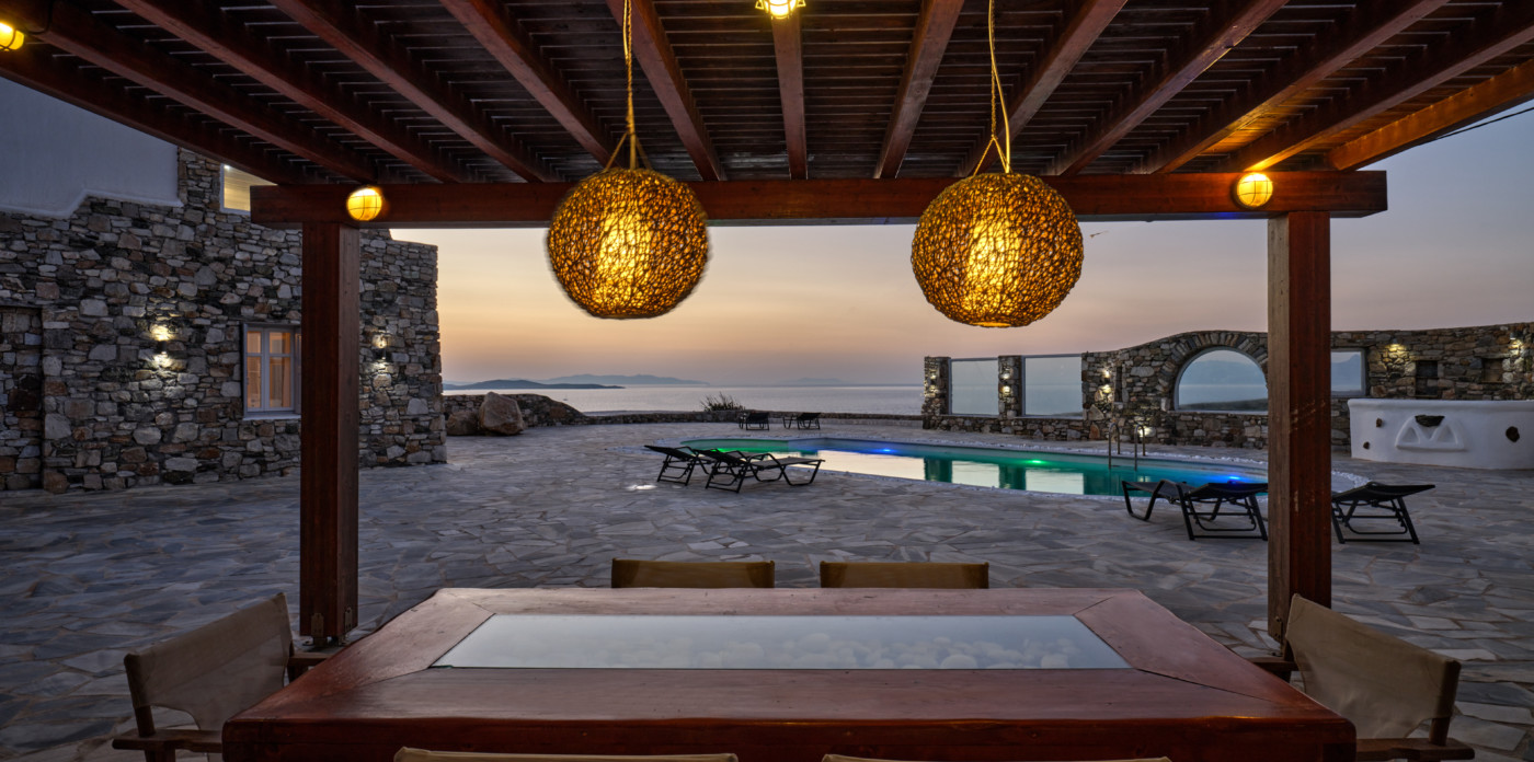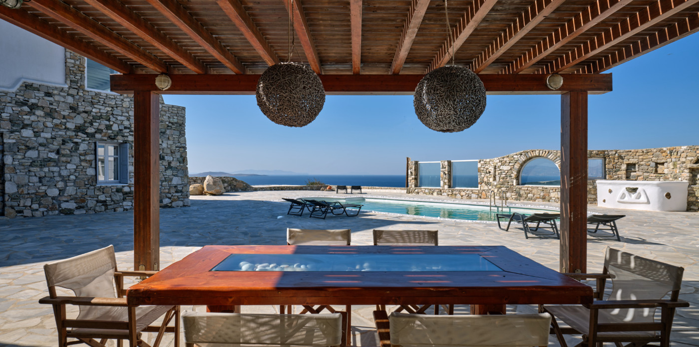Included in the well-manicured grounds, are a large swimming pool and an outside dining area with a beautiful pergola, completing the idyllic atmosphere. The spectacular infinity pool is a magical touch that complements the stunning panoramic views from the pool decks. Find the perfect spot in the outdoor areas and absorb the magical energy of the island of Mykonos.