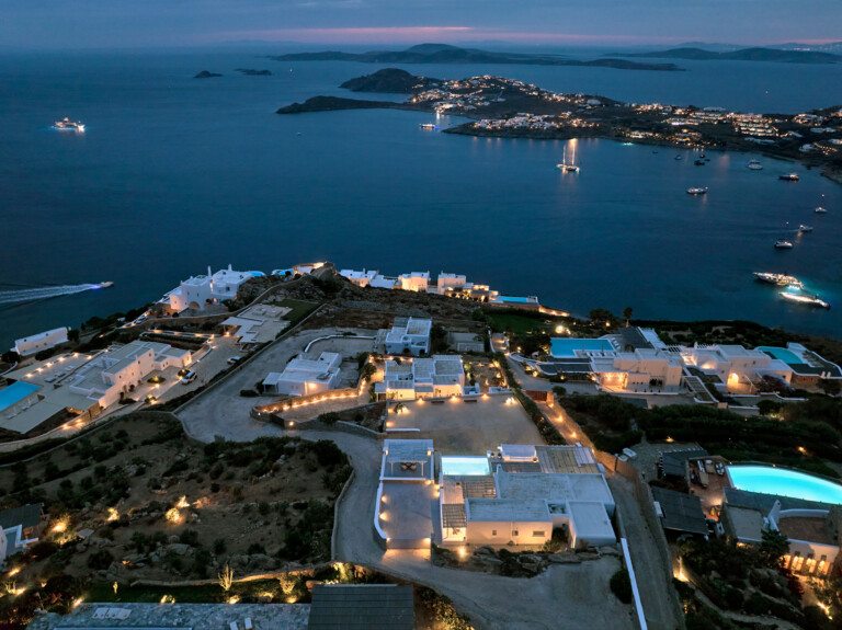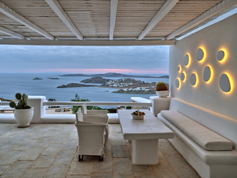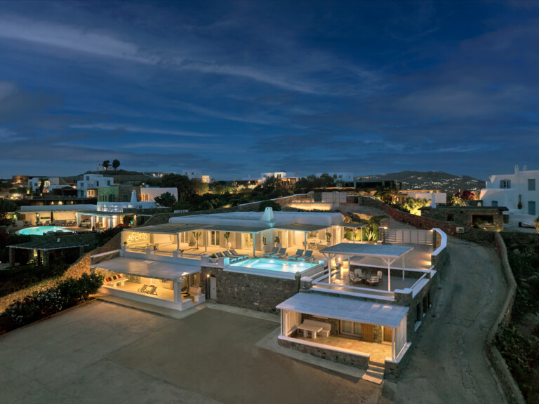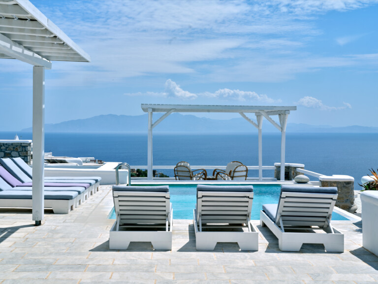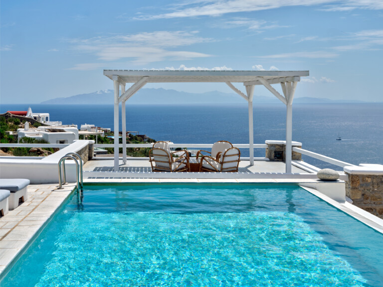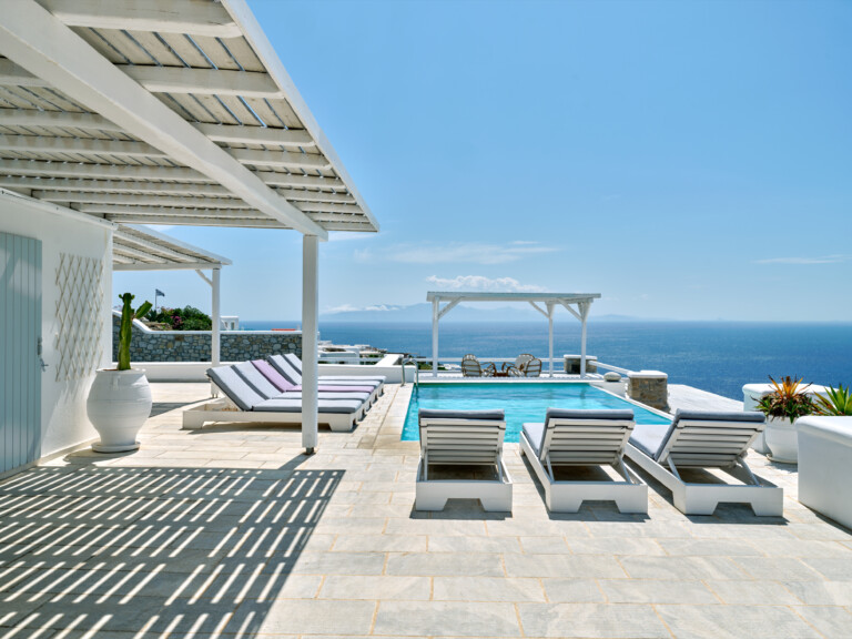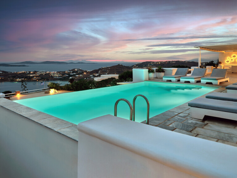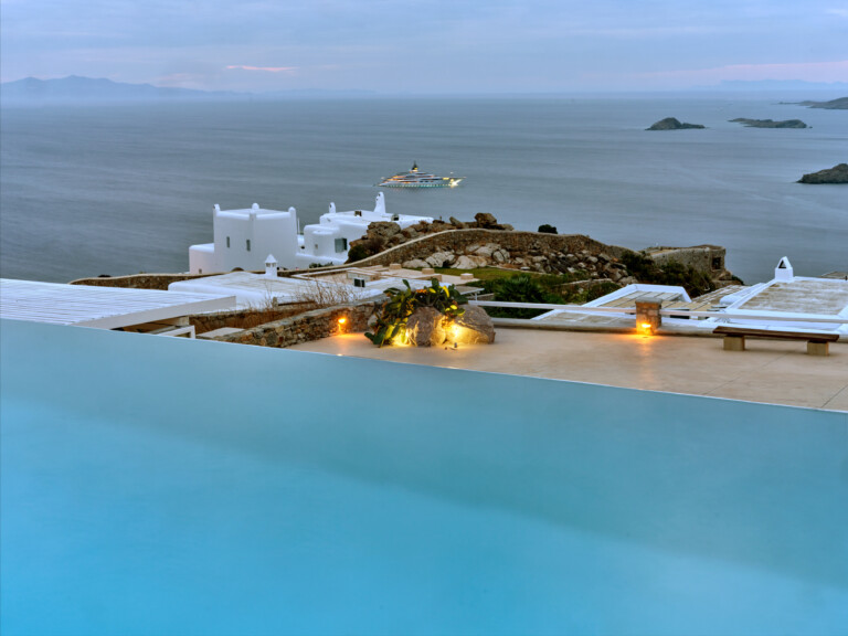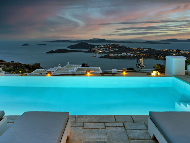 During the day, bask in the sun’s warmth on comfortable sunbeds, take a refreshing dip in the infinity pool that smoothly merges with the hypnotic sea, and let the views of the bright blue waters and endless horizons soothe your senses. As night falls, be enchanted by the gentle glow of the moon and stars overhead, complemented by the captivating Mykonian lights.