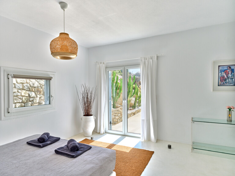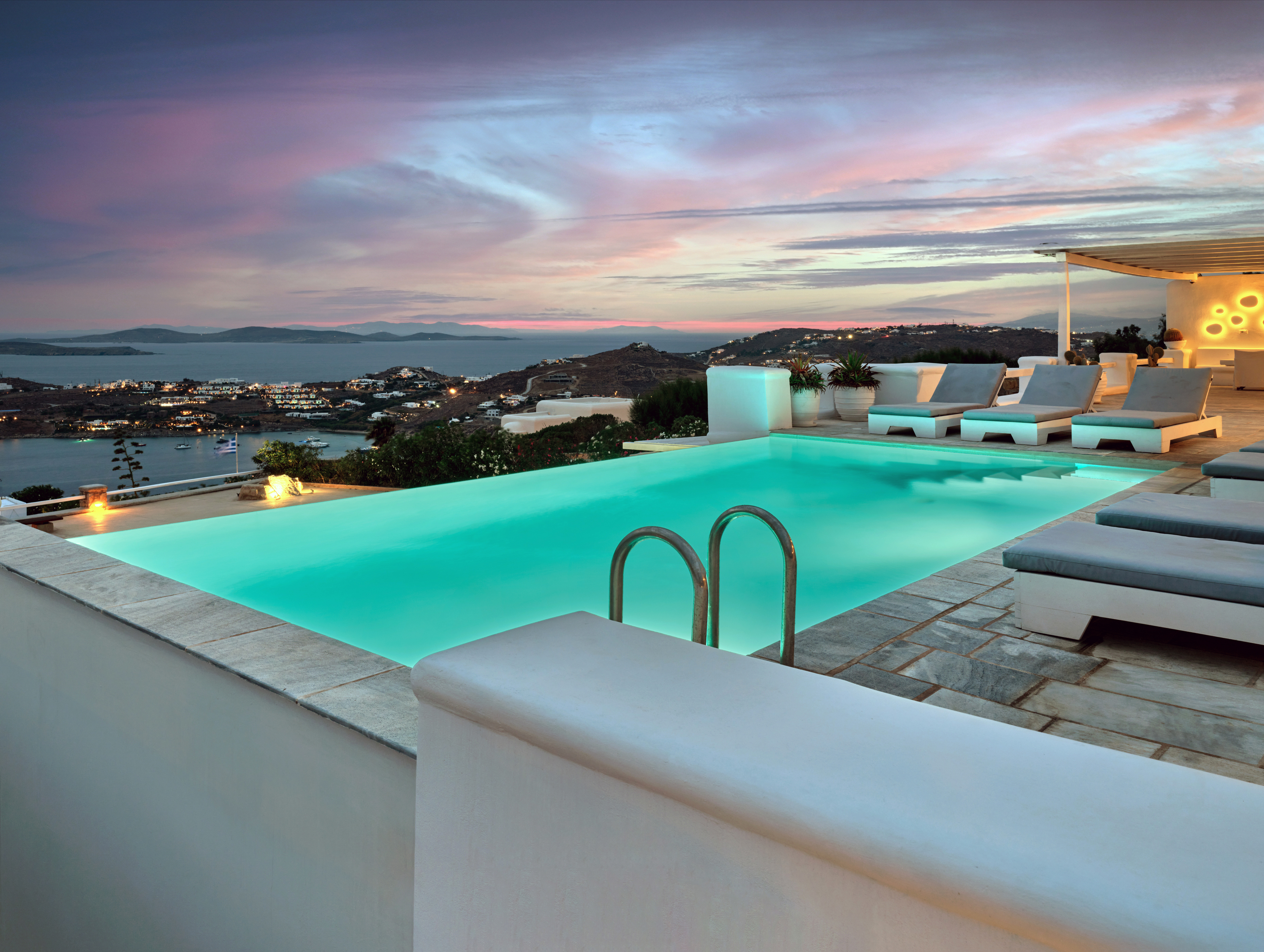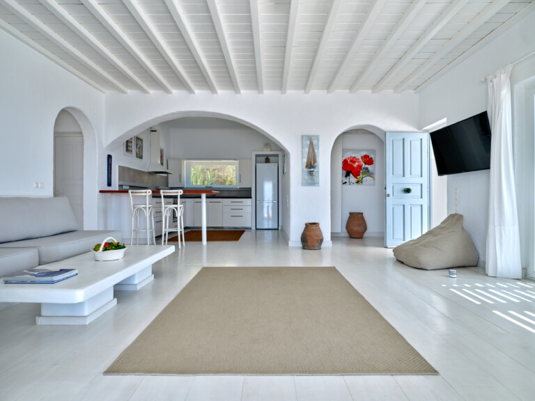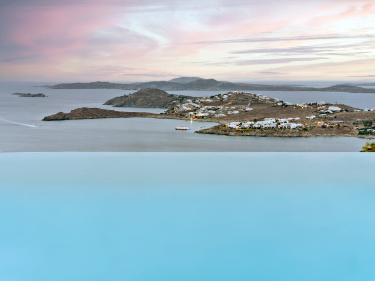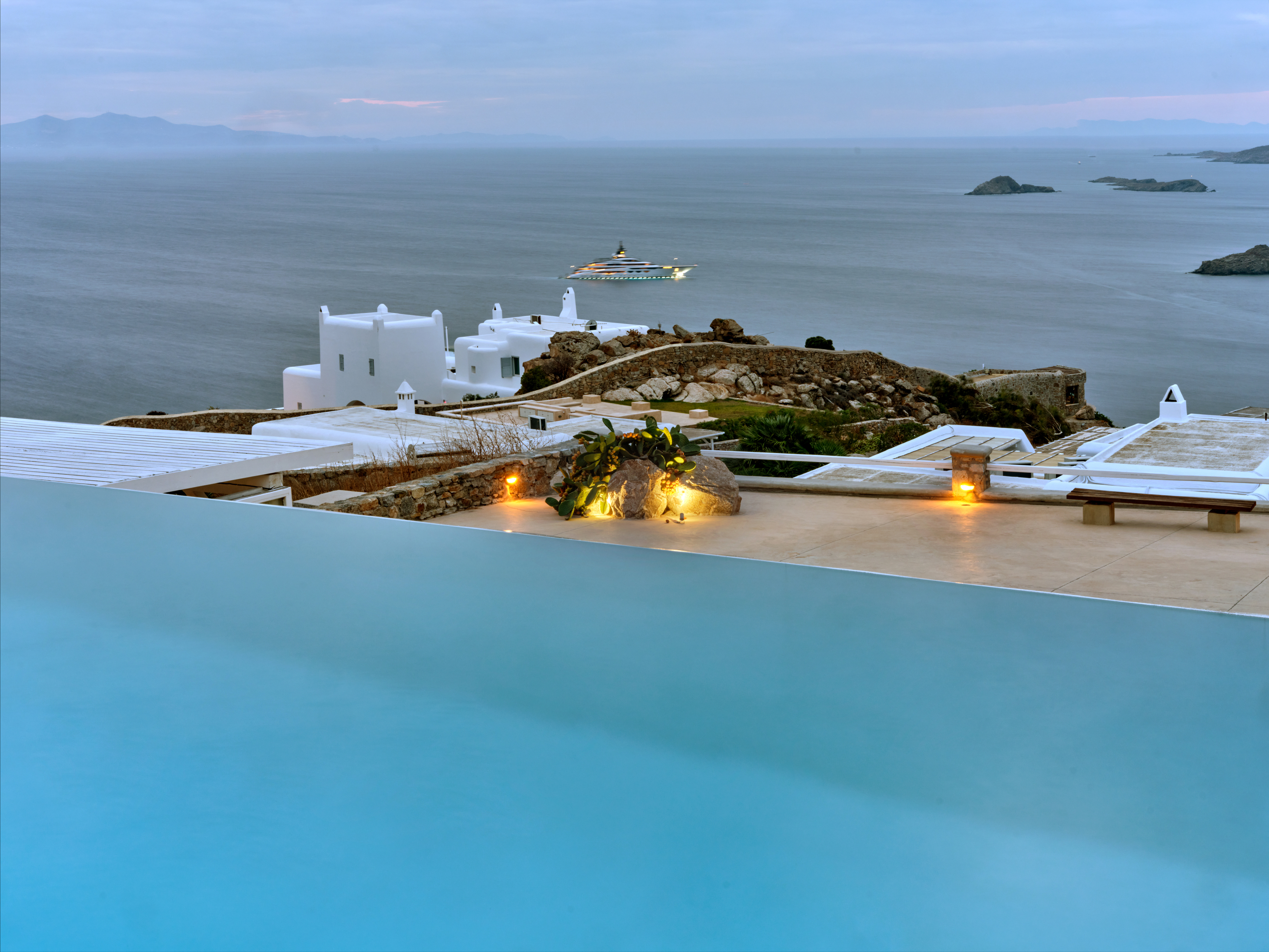 During the day, bask in the sun’s warmth on comfortable sunbeds, take a refreshing dip in the infinity pool that smoothly merges with the hypnotic sea, and let the views of the bright blue waters and endless horizons soothe your senses. As night falls, be enchanted by the gentle glow of the moon and stars overhead, complemented by the captivating Mykonian lights.