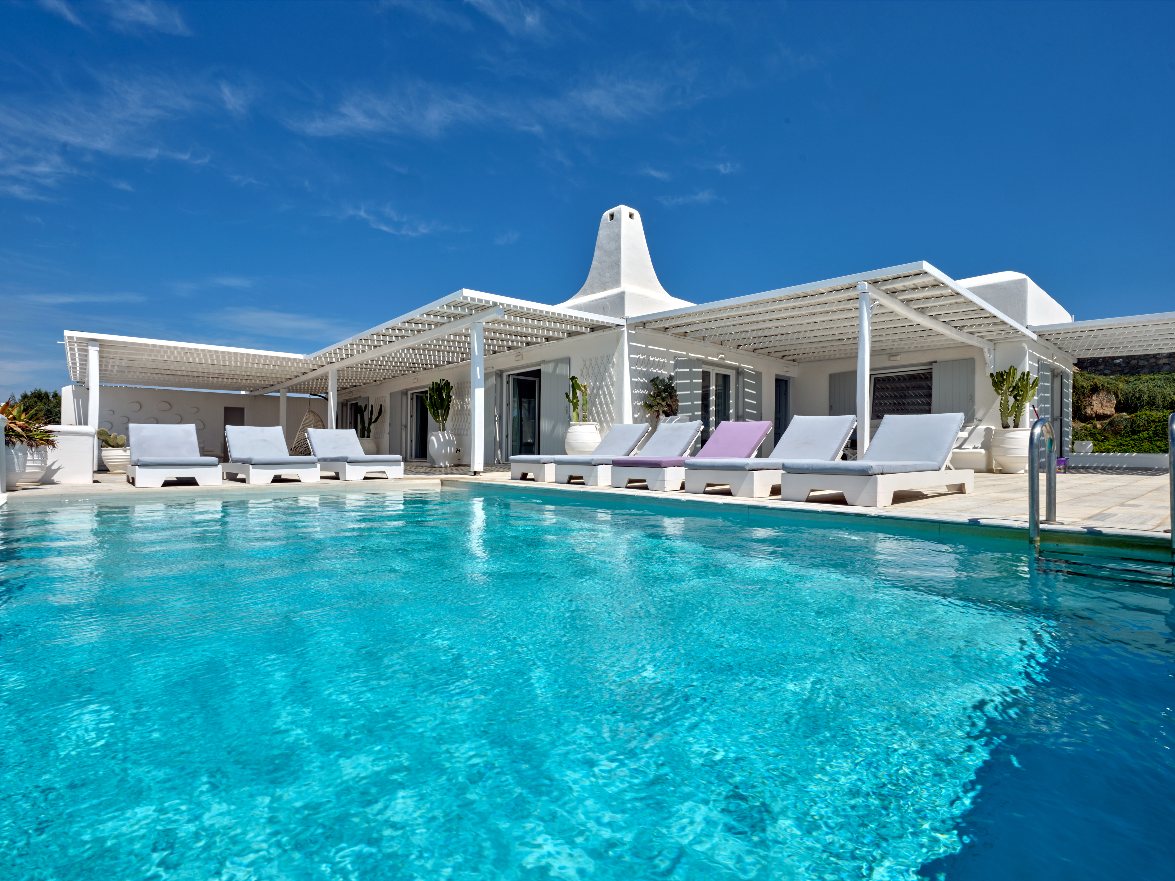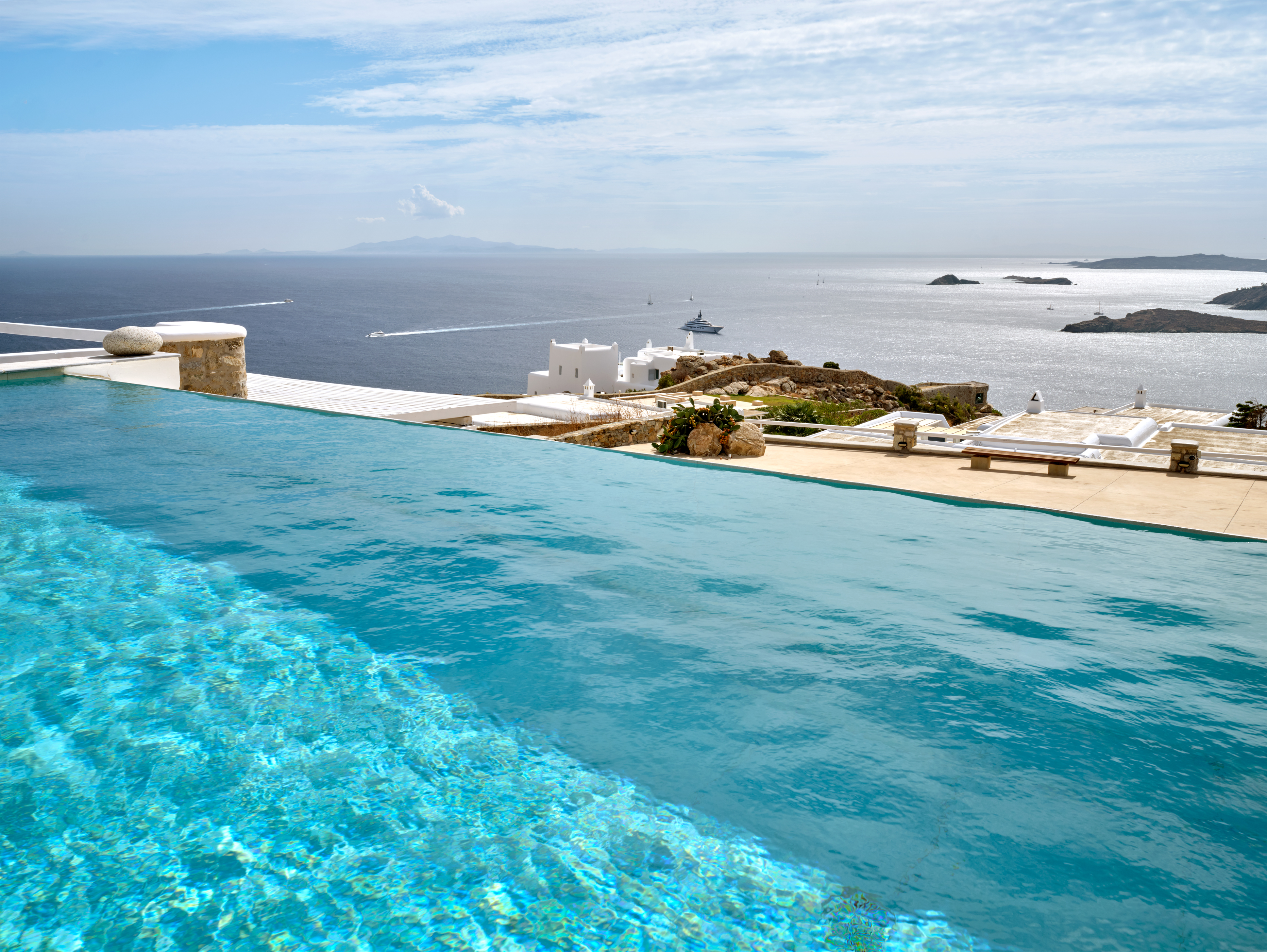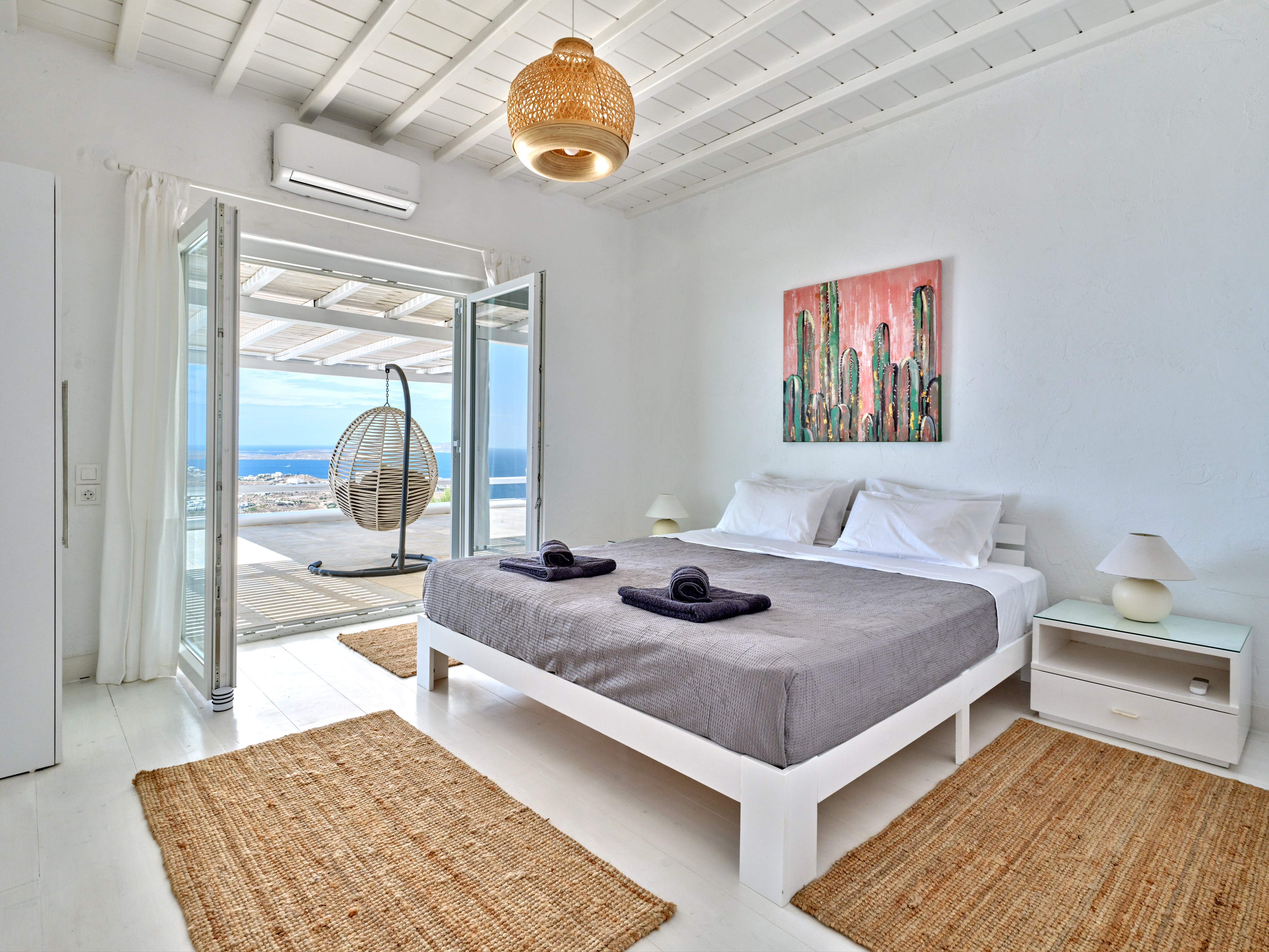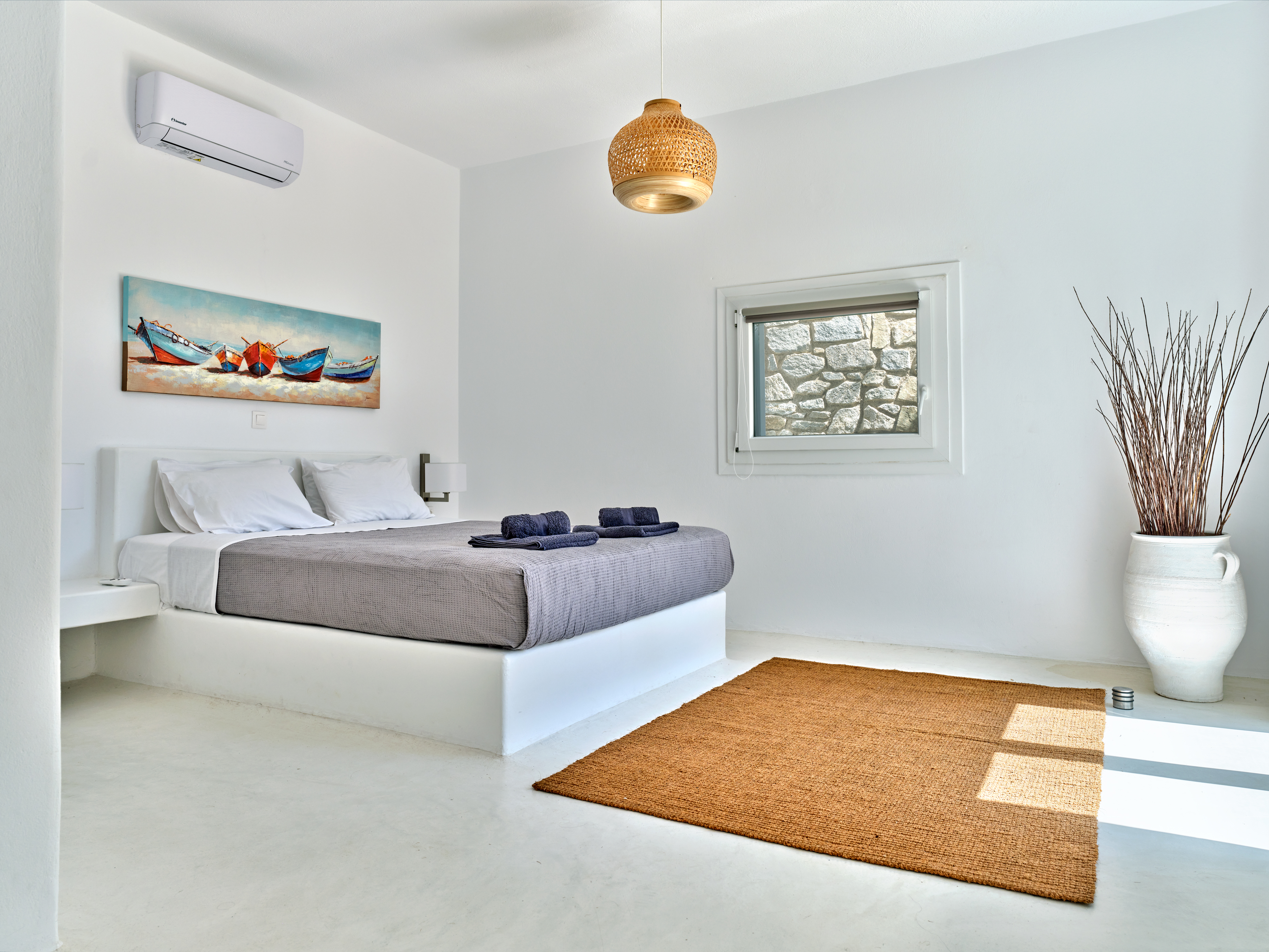 During the day, bask in the sun’s warmth on comfortable sunbeds, take a refreshing dip in the infinity pool that smoothly merges with the hypnotic sea, and let the views of the bright blue waters and endless horizons soothe your senses. As night falls, be enchanted by the gentle glow of the moon and stars overhead, complemented by the captivating Mykonian lights.