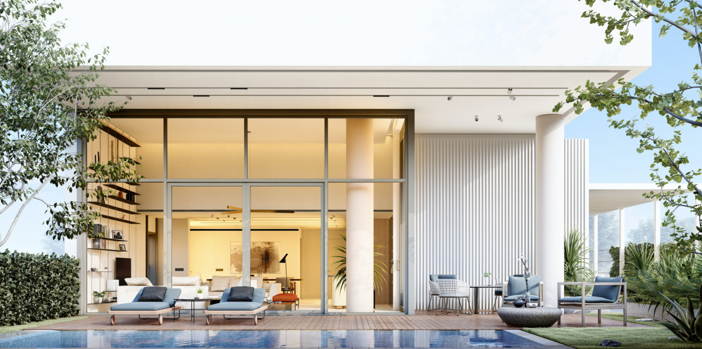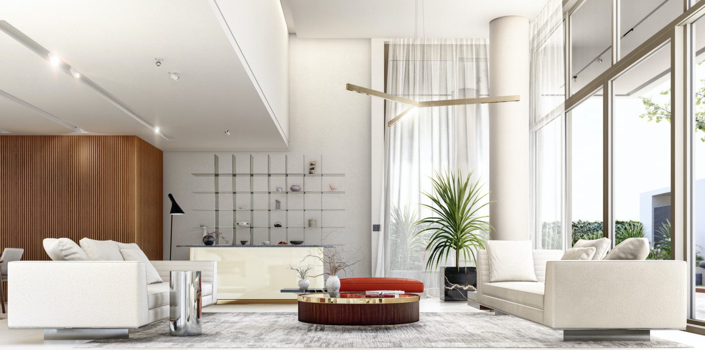 It has an impressive double ceiling height with oversized floor to ceiling glass doors. These large glass doors offer a beautiful view to the garden and the swimming pool and allow an abundance of natural light and superb sense of openness.