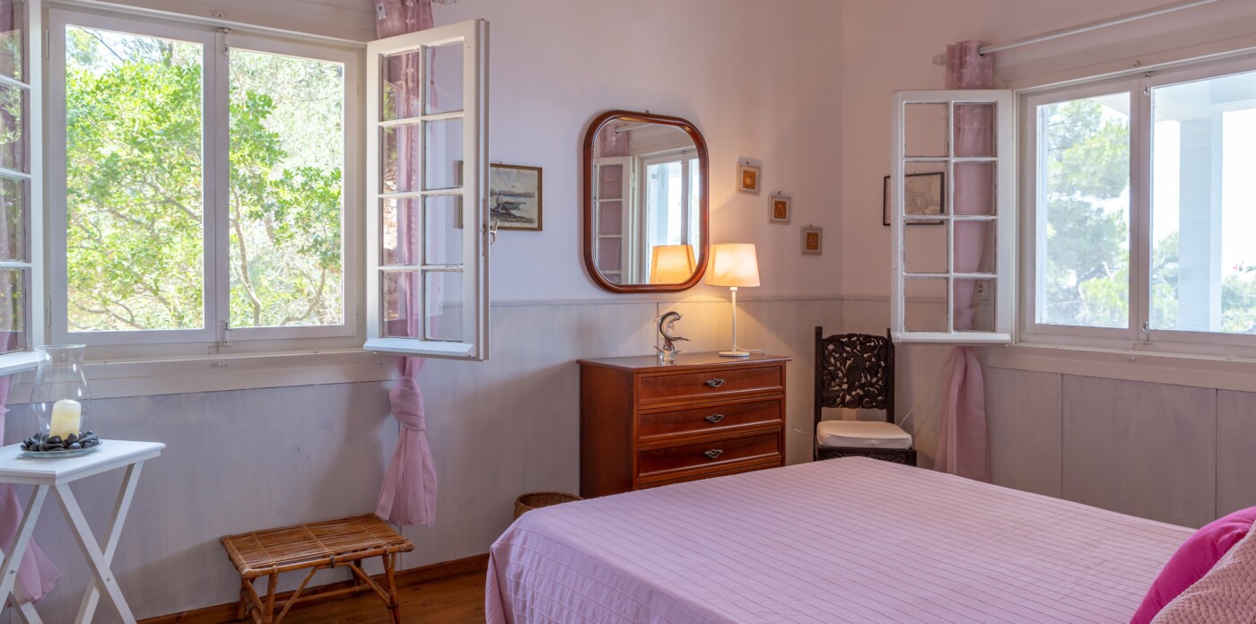 Built just above the water’s edge, Pelora commands panoramic views across the Aegean, encompassing two picturesque islets and the open sea beyond. A true sanctuary, the villa is embraced by nature, with fragrant oleanders, ancient olive trees, and towering pines framing its spacious verandas and sun-drenched terraces.