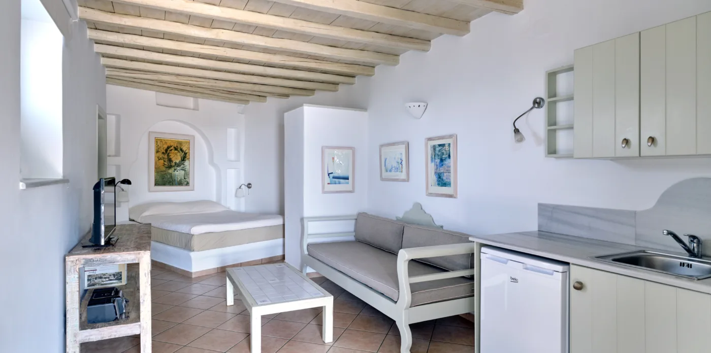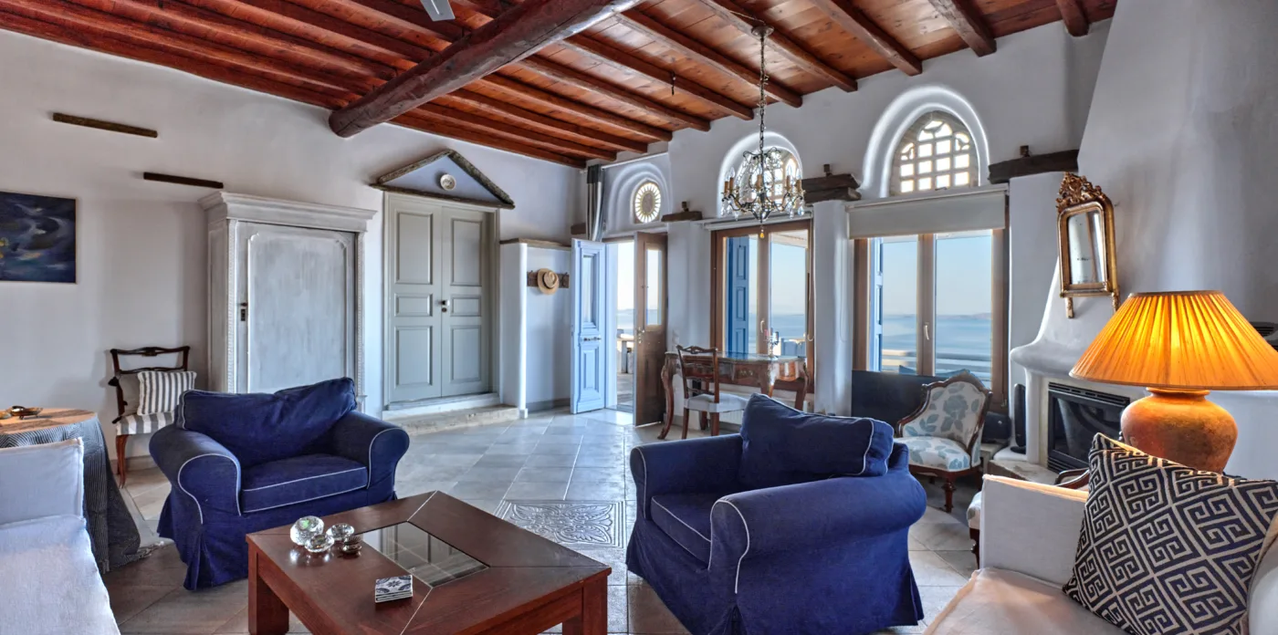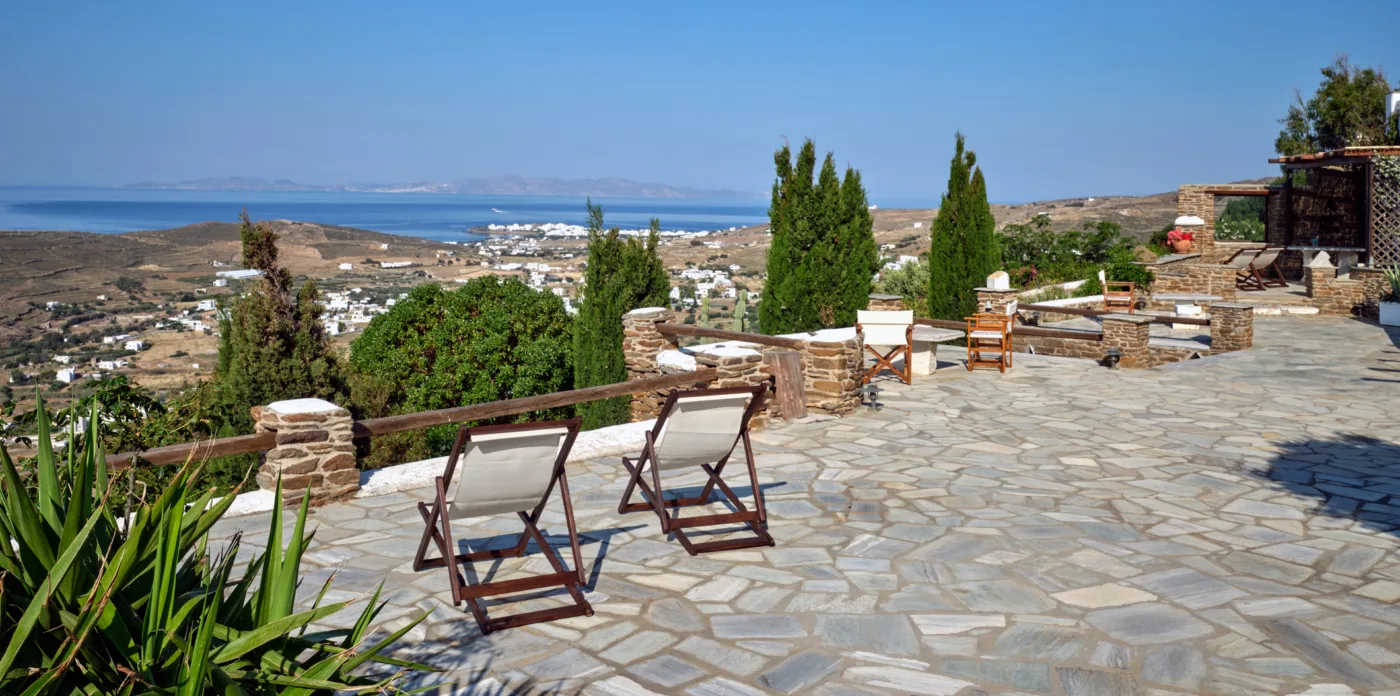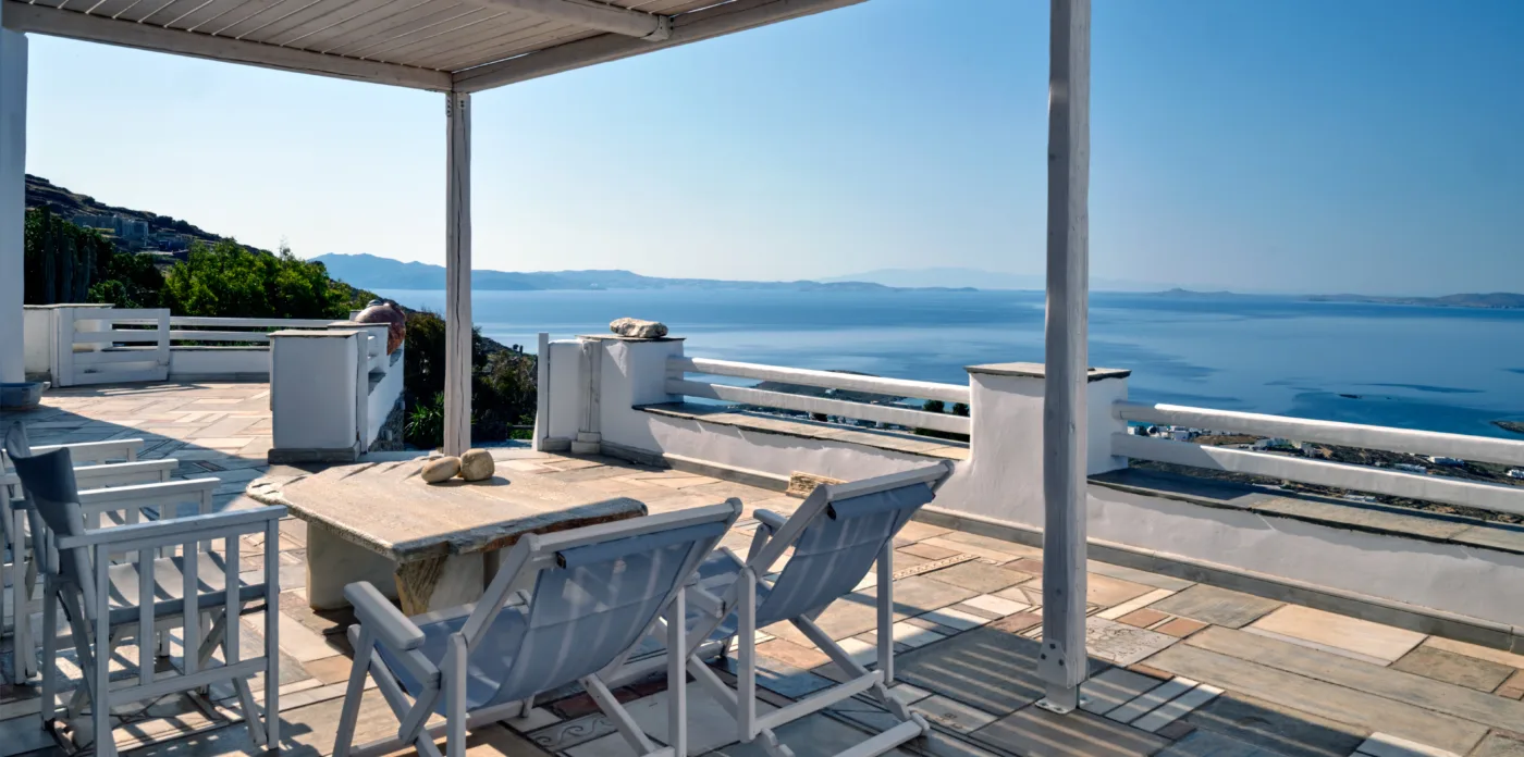 Pierrette offers stunning sunset views of the islands of Mykonos, Paros, Syros, and Naxos and night time views of the twinkling island lights.
