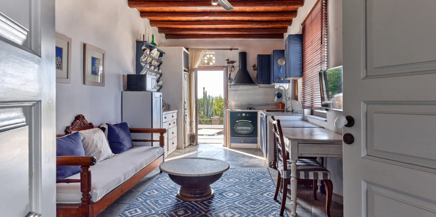 Four spacious bedrooms and five bathrooms are divided between three distinct spaces. Τhe main residence opens into a spacious living room with the kitchen off to the right and the first en-suite master bedroom directly behind it. To the left of the living room stairs lead to the second en-suite bedroom, a separate bathroom, as well as an additional room that can be adapted to your needs.