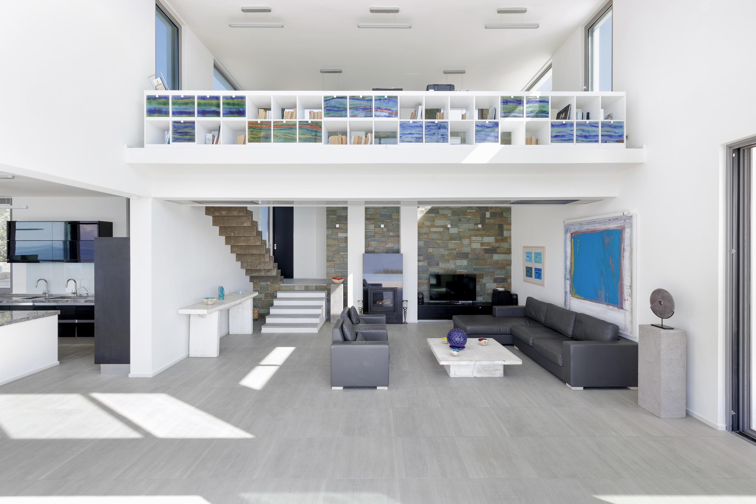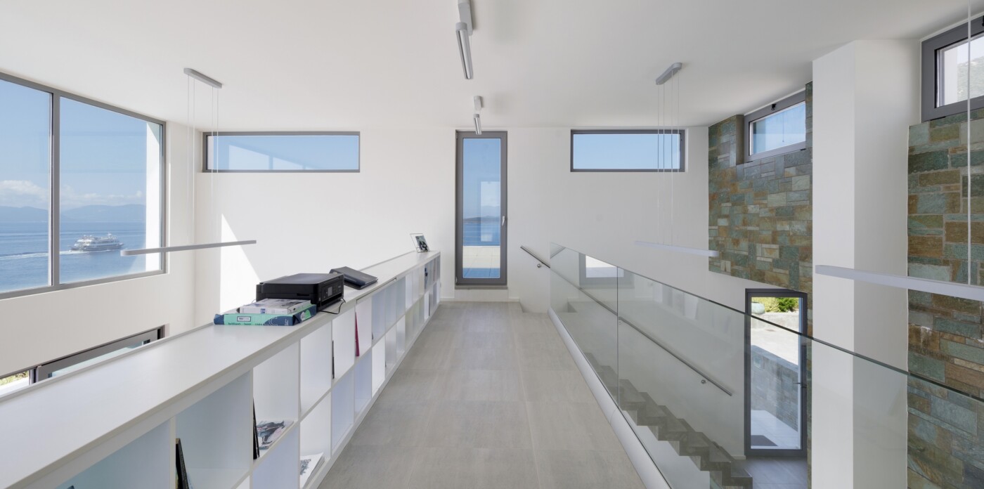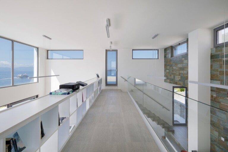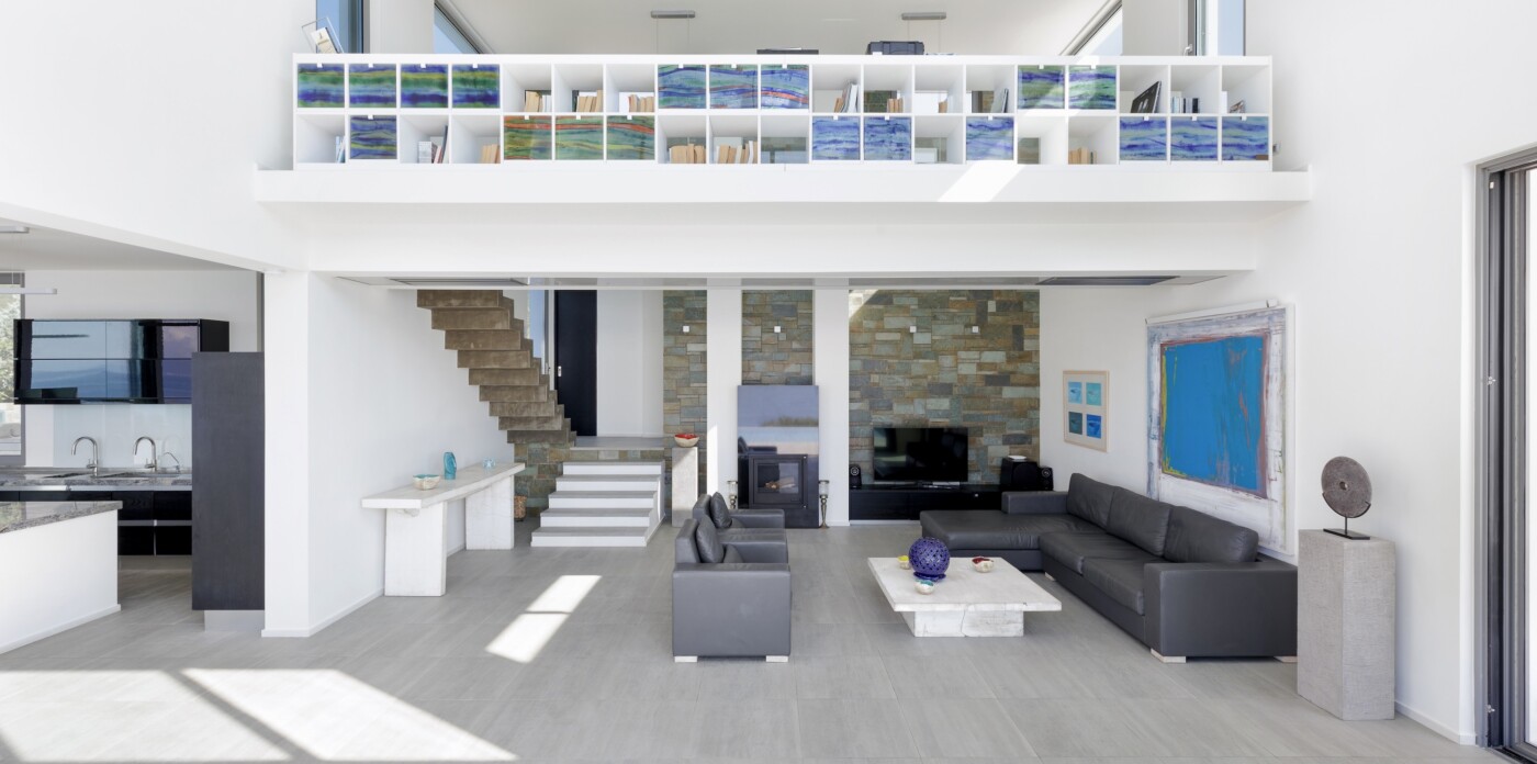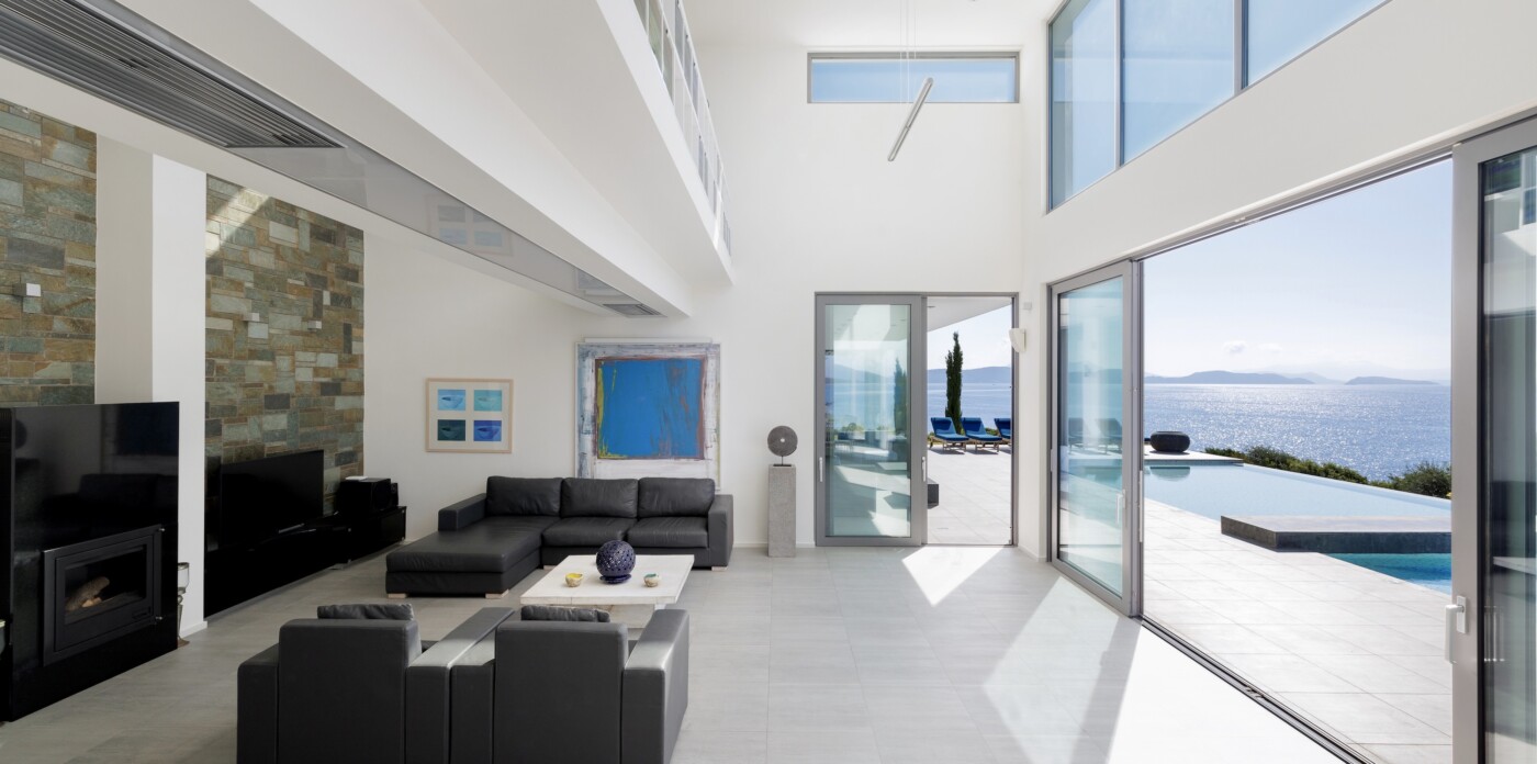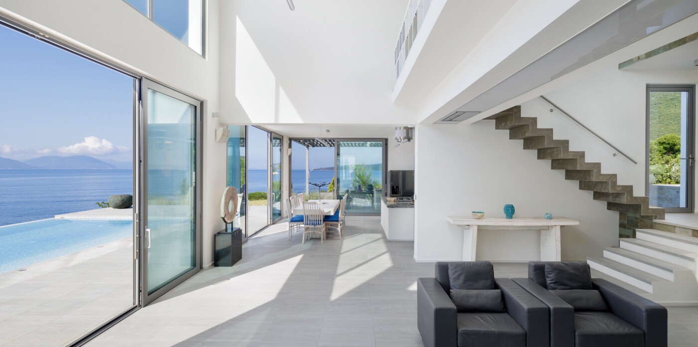 Inside, the interiors are bright and airy, with soaring ceilings and expansive double-height windows that frame breathtaking sea views and flood the space with natural light. The open-concept layout connects the living room, dining area, and kitchen, encouraging relaxed, sociable living.