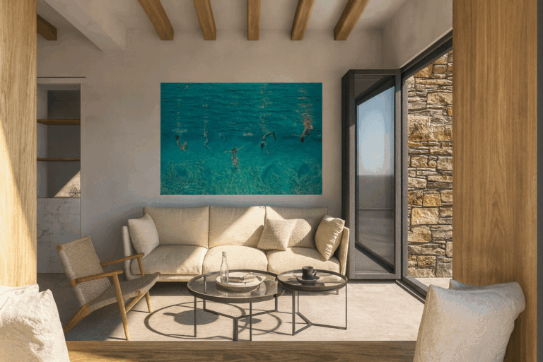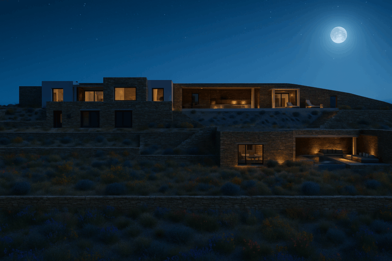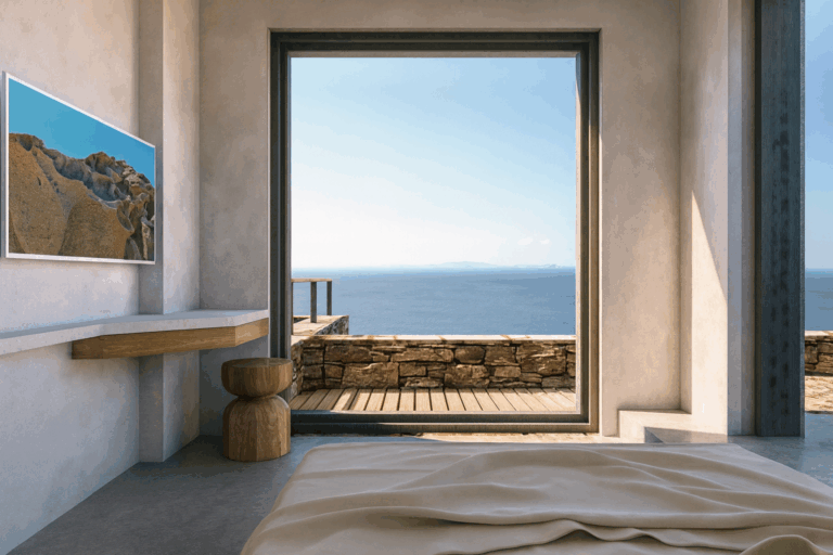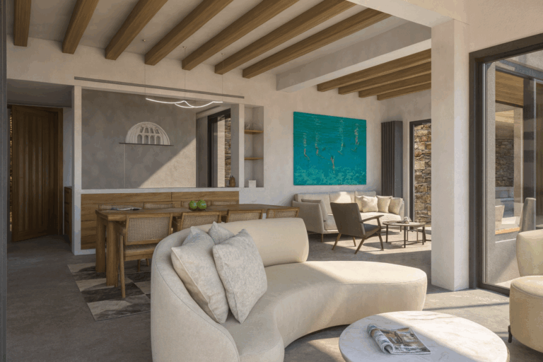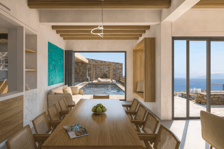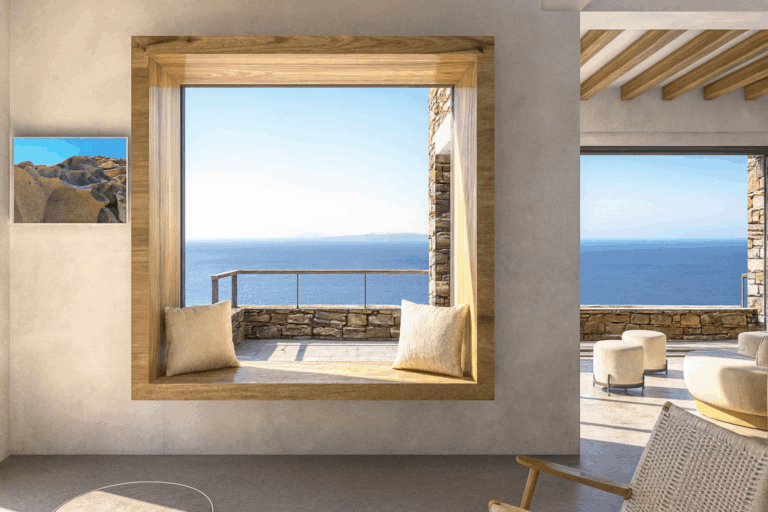 High on a hillside with captivating views across the endless blue of the Aegean, Villa Raina is a sanctuary of Cycladic elegance. From here, you can see Delos, Rinia, and Mykonos. Just ten minutes from the lively charm of Tinos Town and only minutes from the golden sands of Agios Sostis, this exquisite residence offers the perfect balance of privacy, convenience, and refined island living.