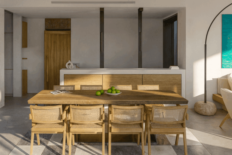 Spanning 375 square meters, the villa’s beautifully designed interiors are set on a generous 5,500 square meter plot. The main house, covering 260 square meters, features a spacious open-plan kitchen, dining, and living area. This space flows effortlessly onto the pool terrace and shaded lounging areas, creating a seamless connection between indoors and outdoors for relaxing or entertaining.