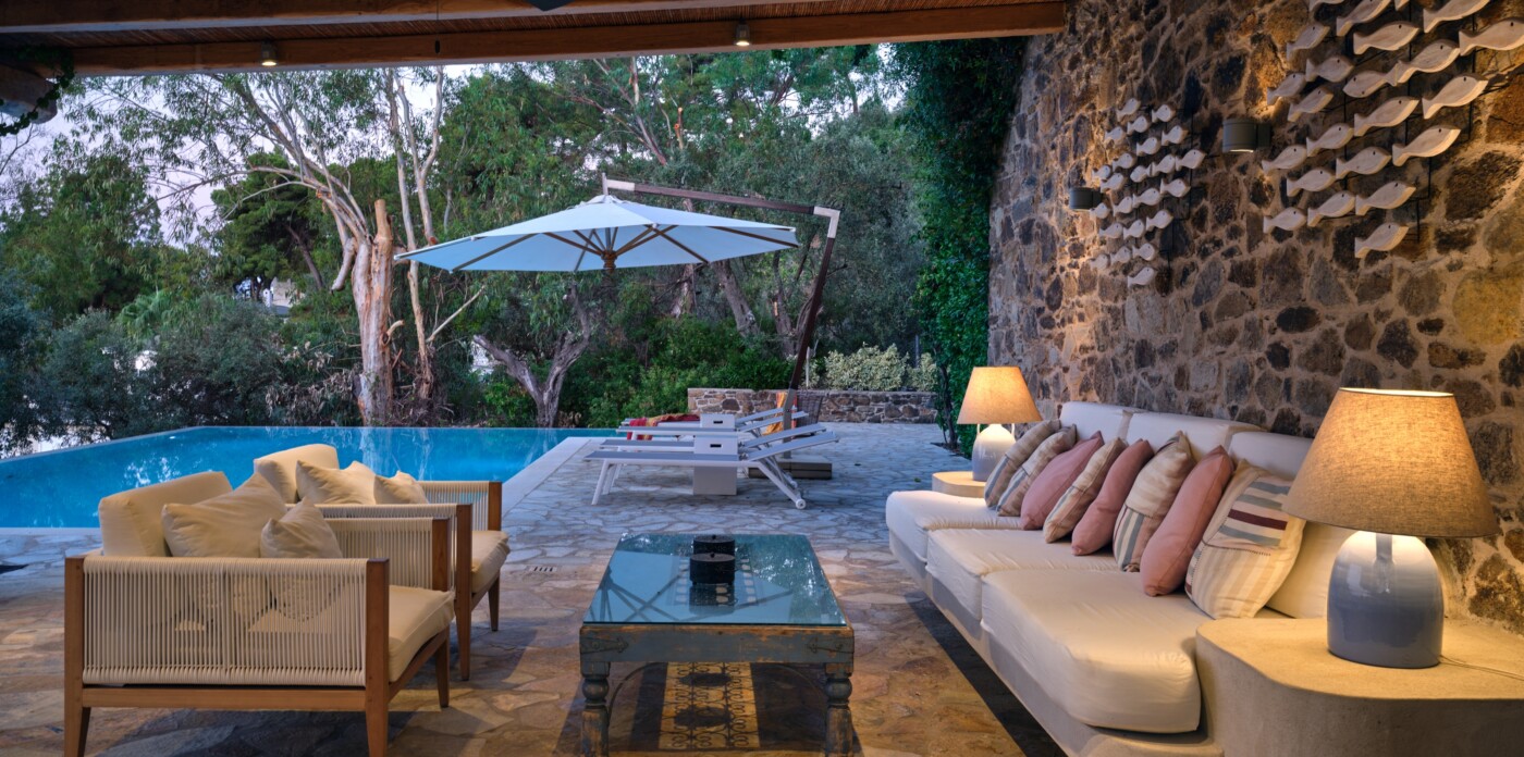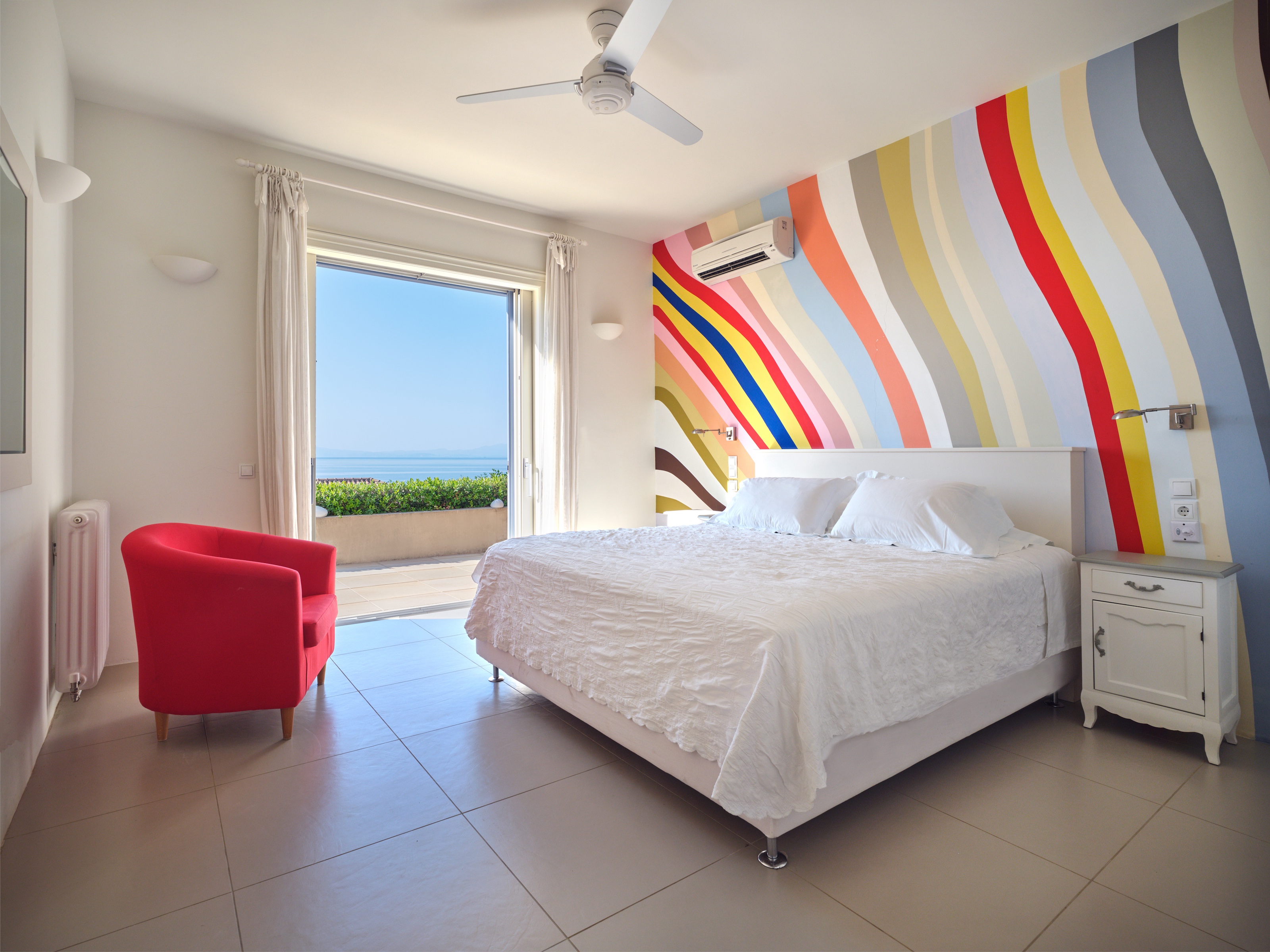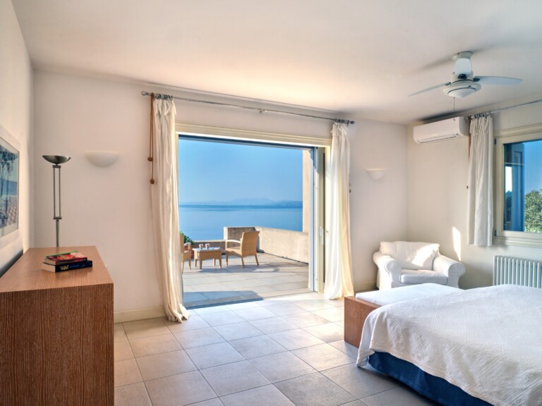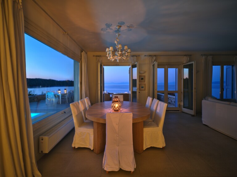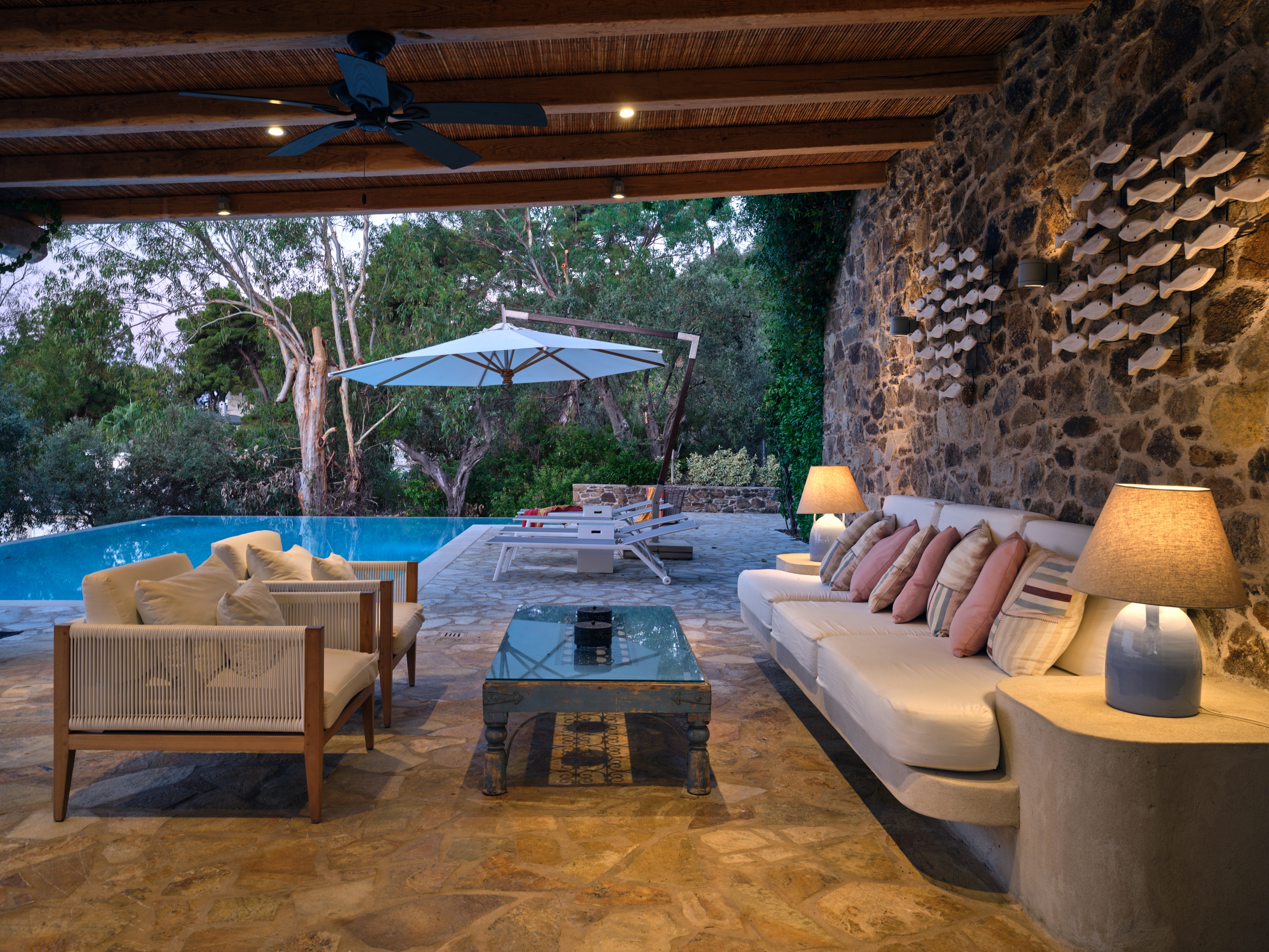 Around the shimmering infinity pool, you’ll discover a wealth of open-air sitting areas, perfect for relaxation. The top floor is dedicated to a luxurious master bedroom, complete with its own private entrance. Adjacent to it, a separate study provides access to a private balcony, commanding breathtaking views of the Aegean Sea.