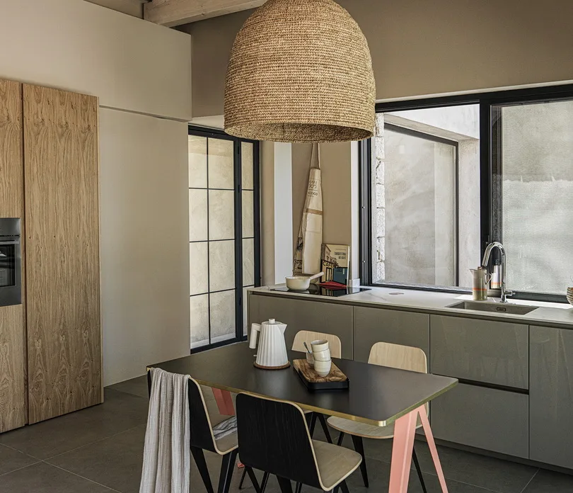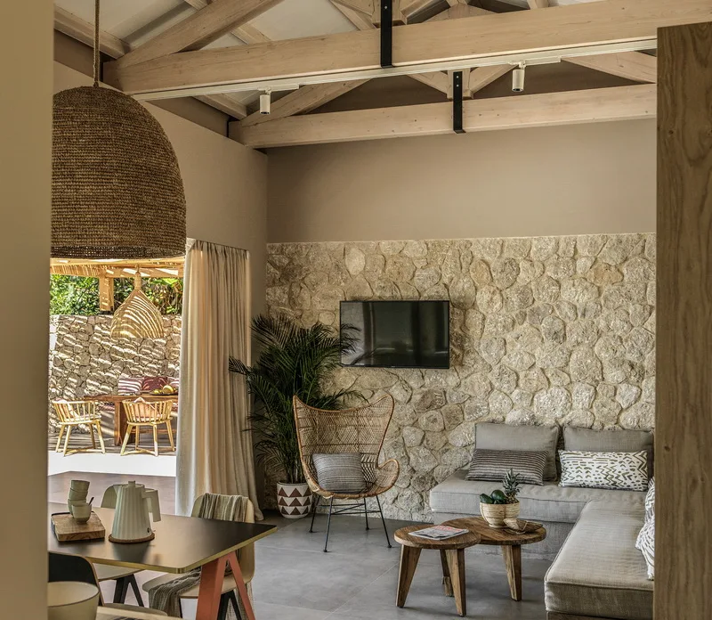 Villa 1 impresses with a high vaulted exposed beam ceiling, open-plan living room, fully fitted kitchen, and a stunning infinity pool. The upper level features a primary bedroom with an ensuite bathroom.