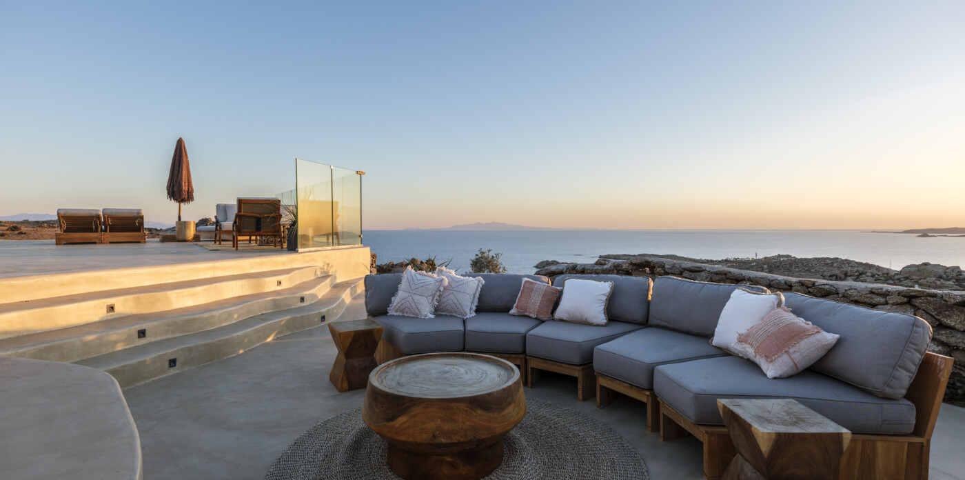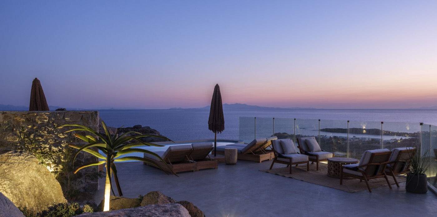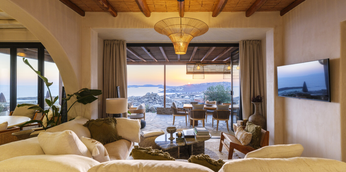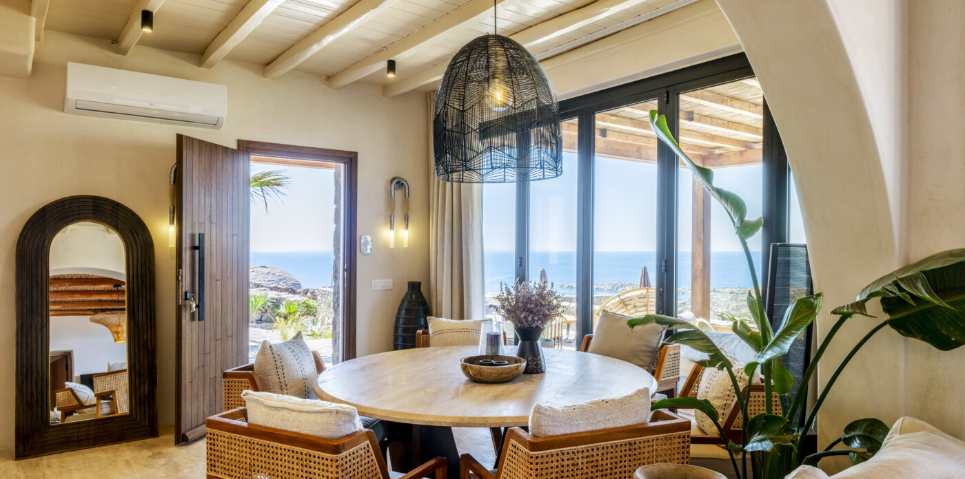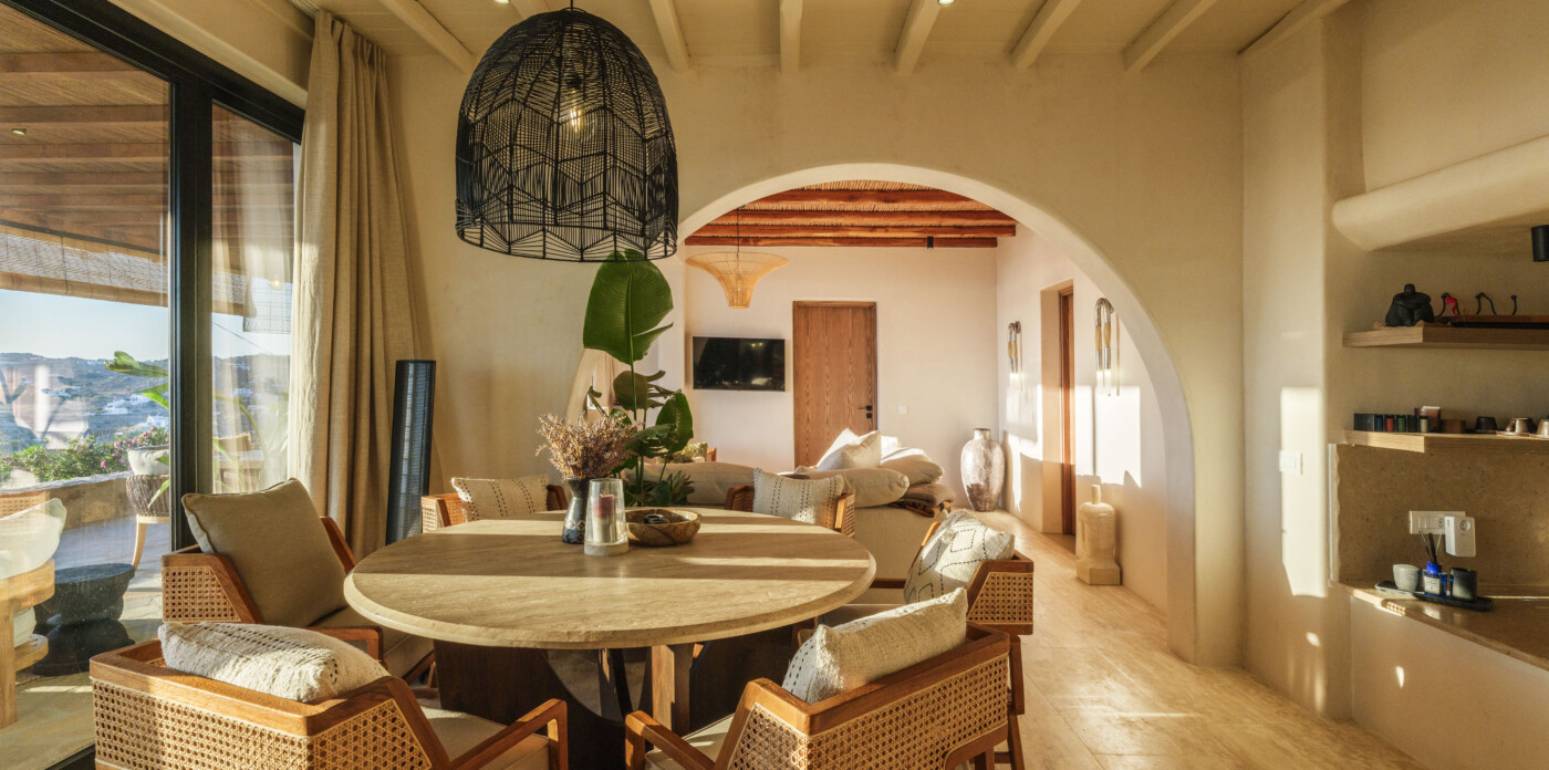 Located in the beautiful area of Pyrgi, just minutes from Mykonos’ most iconic beach clubs like Scorpios and Soho House, Solasta is a stunning four-bedroom en suite villa that redefines island elegance and effortless living. Its prime position offers magnificent sea views and a captivating panorama of the island’s famous sunsets.