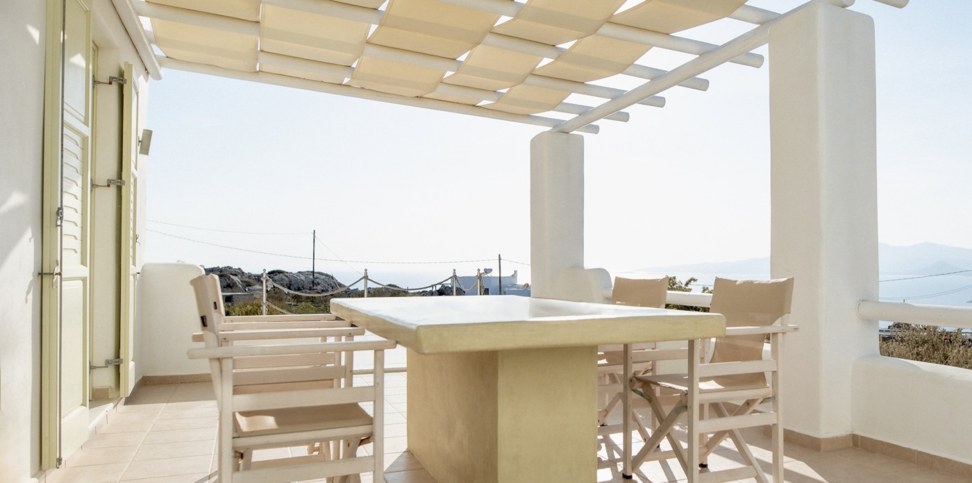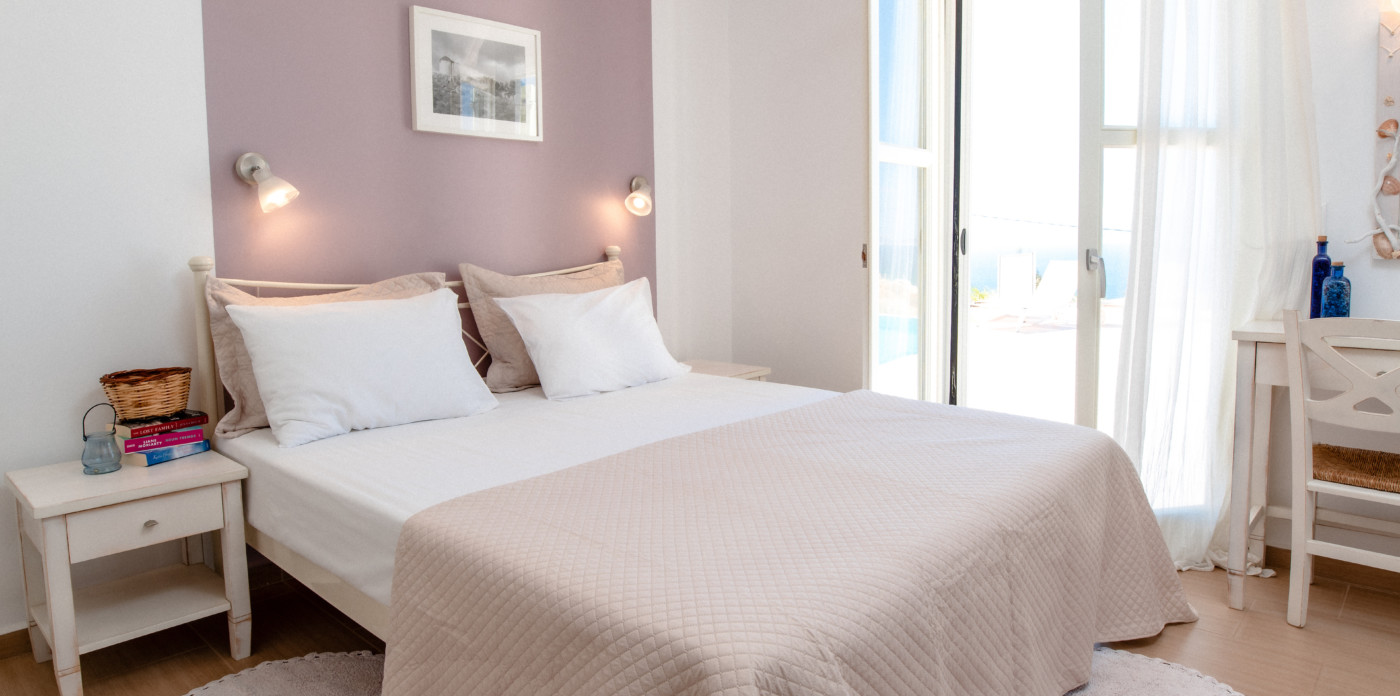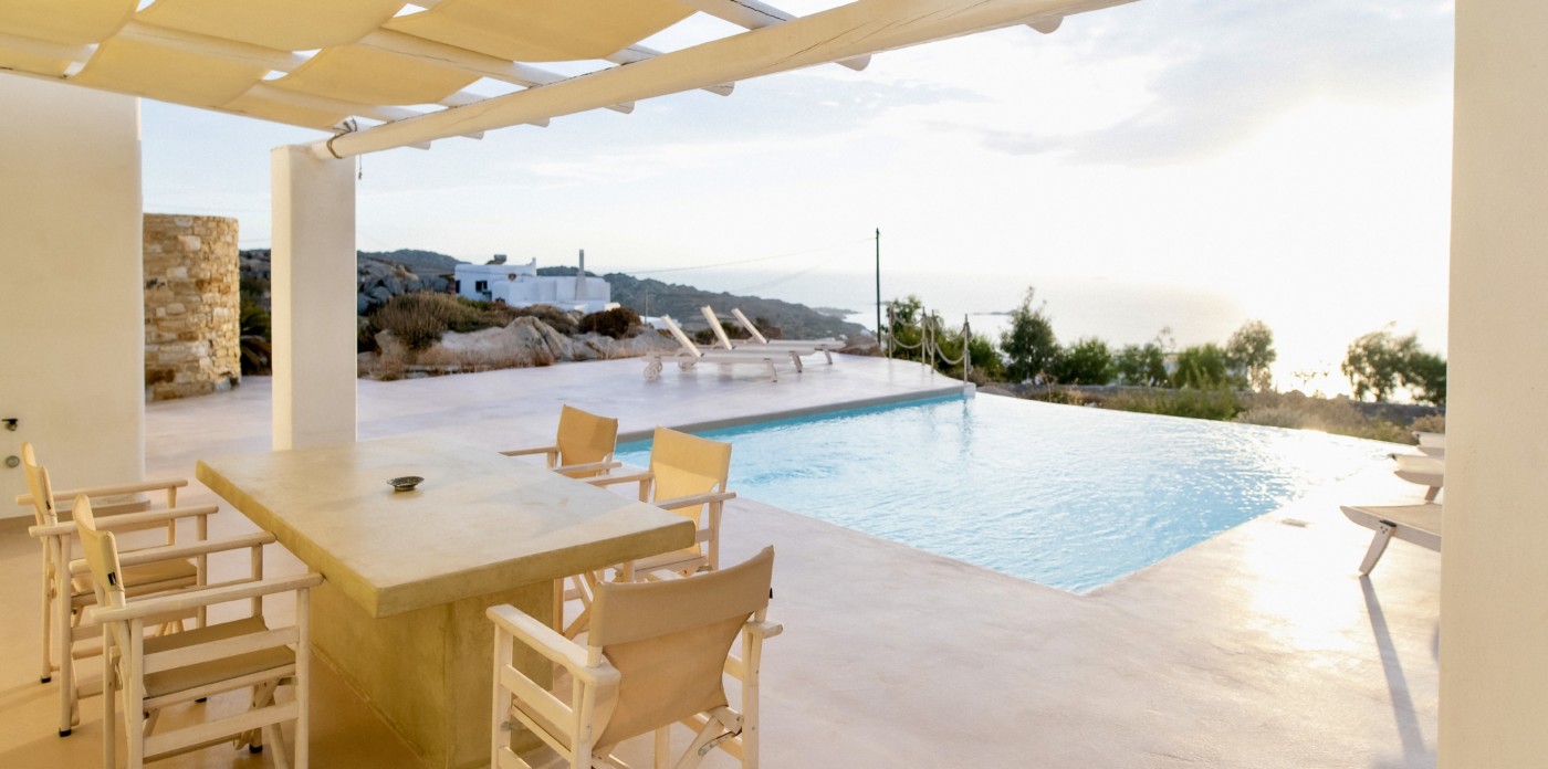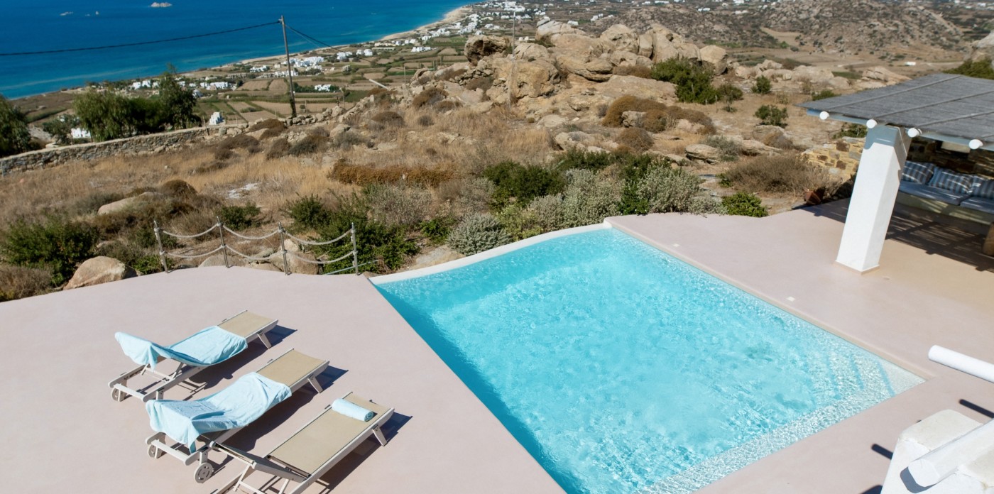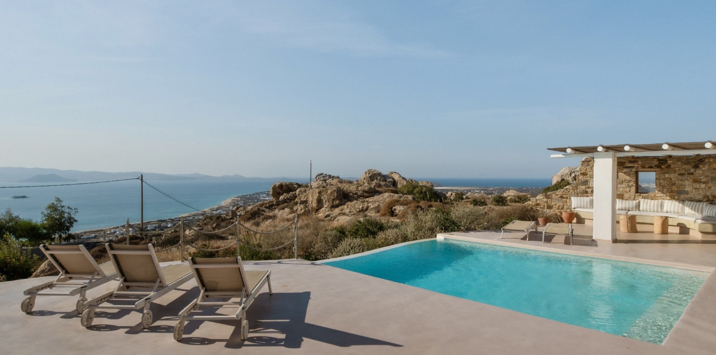 Theros villas on Naxos island enjoy magnificent sunsets and panoramic vistas of sandy beaches and shimmering turquoise waters.