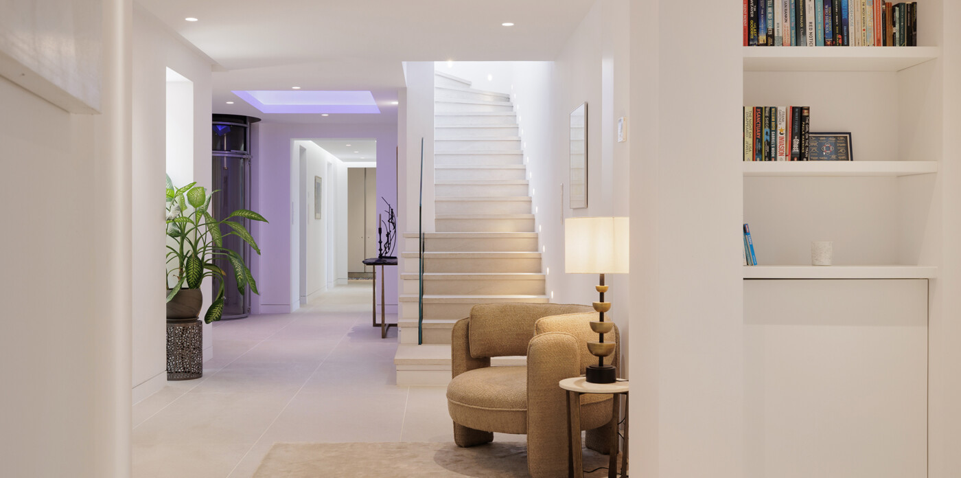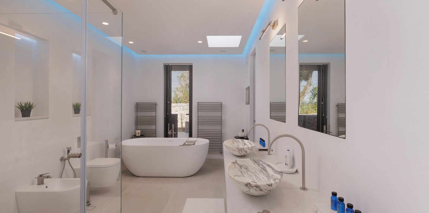 Underfloor heating provides consistent comfort across all seasons, with interiors that perfectly echo the property’s contemporary ethos through sleek finishes and an open-plan design that continuously draws the eye to the surrounding seascape.