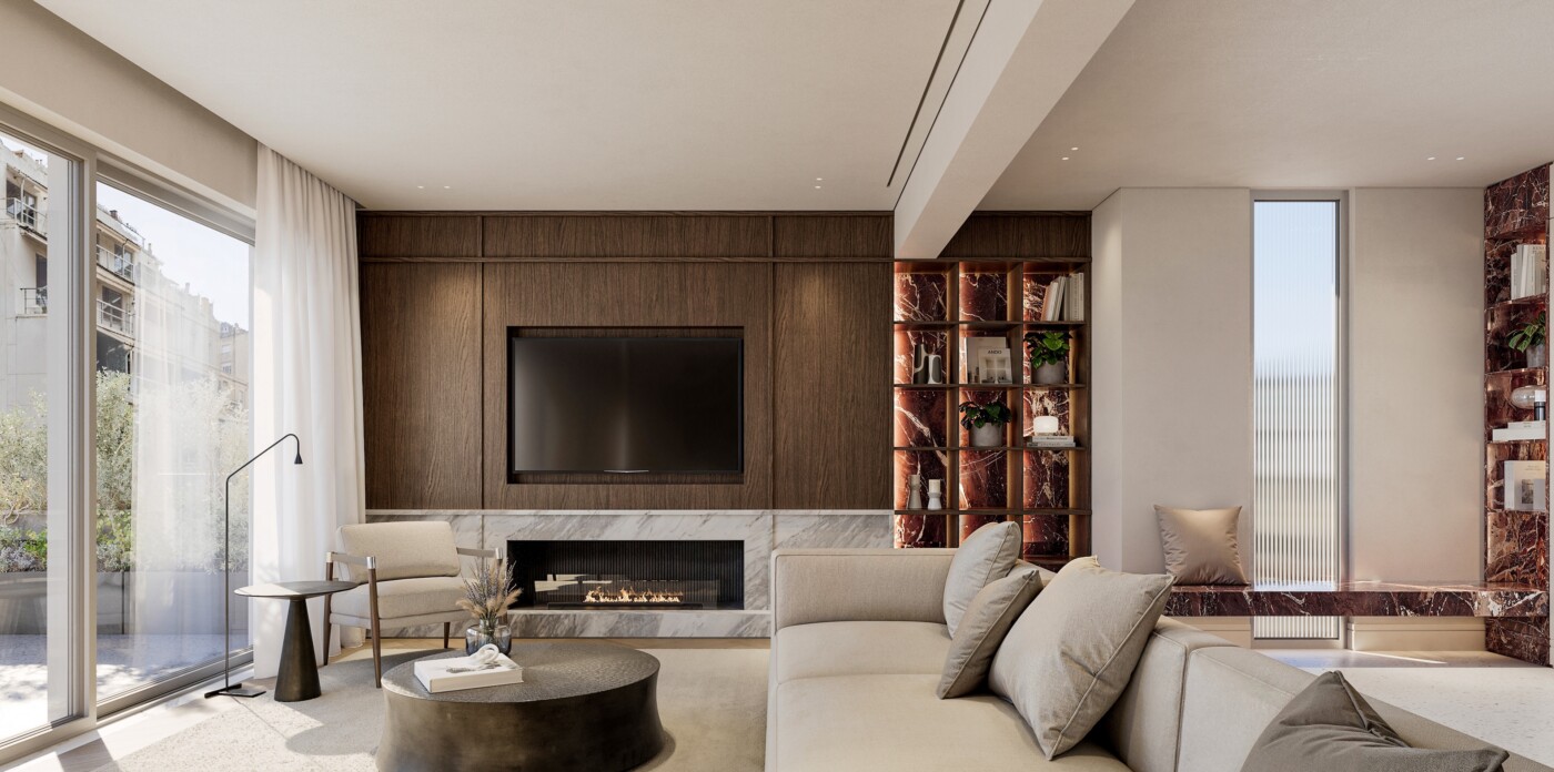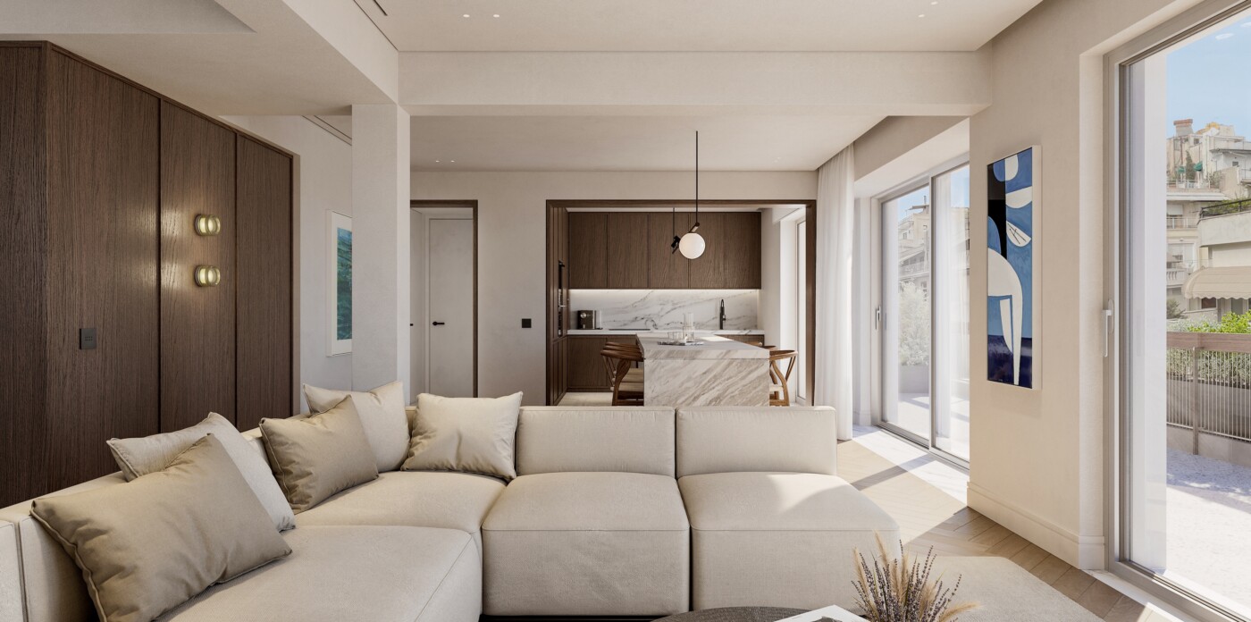 Urban Vista is a refined fourth-floor, full-floor apartment in the heart of Kolonaki, Athens most prestigious and cosmopolitan neighborhood, offering elegant interiors and views of Lycabettus Hill.