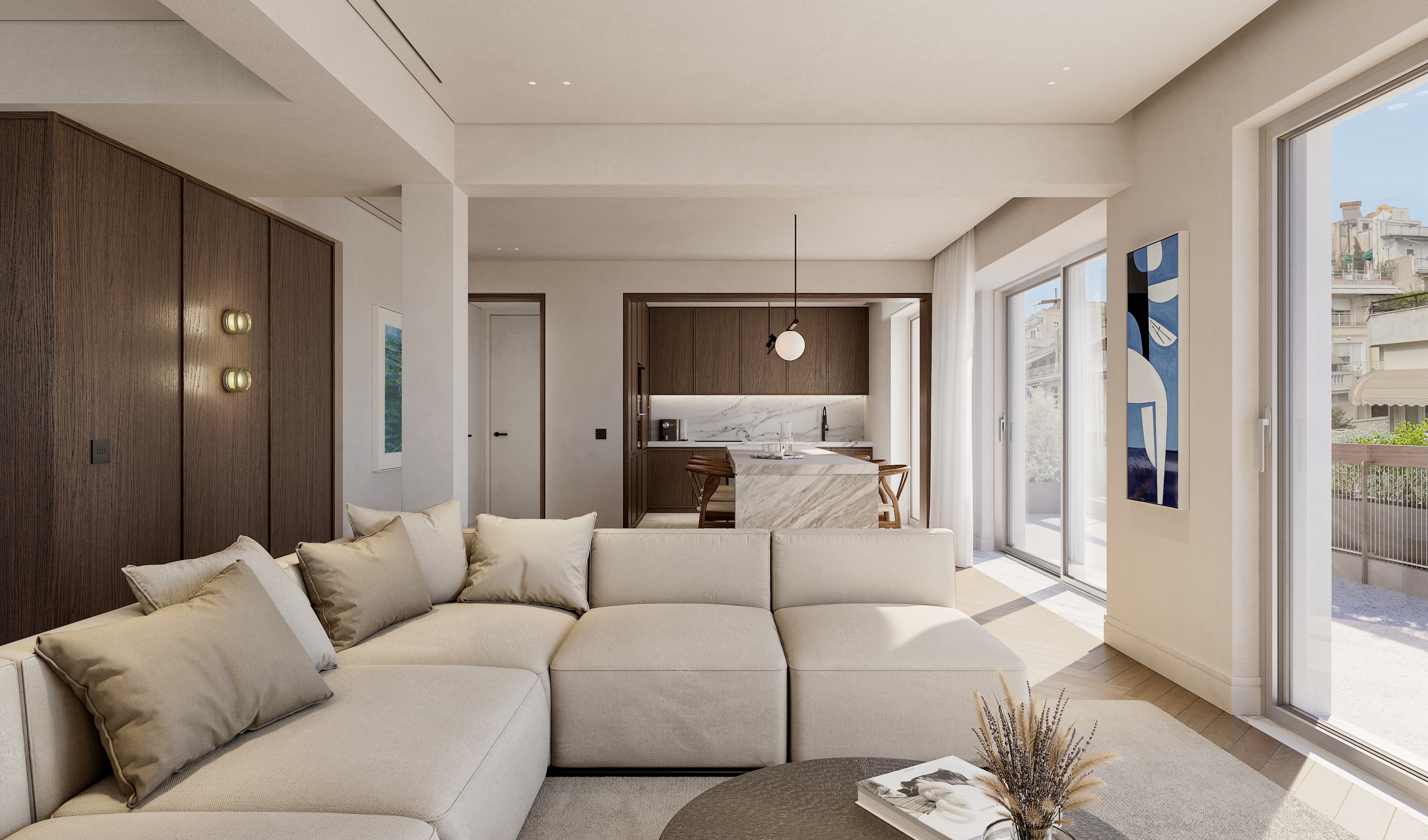 The open-plan living and dining area flows naturally into a sleek, modern kitchen, creating an inviting setting for both everyday living and entertaining. Expansive floor-to-ceiling windows fill the interiors with natural light and open onto a spacious balcony, where Lycabettus Hill provides a striking and unmistakably Athenian backdrop.