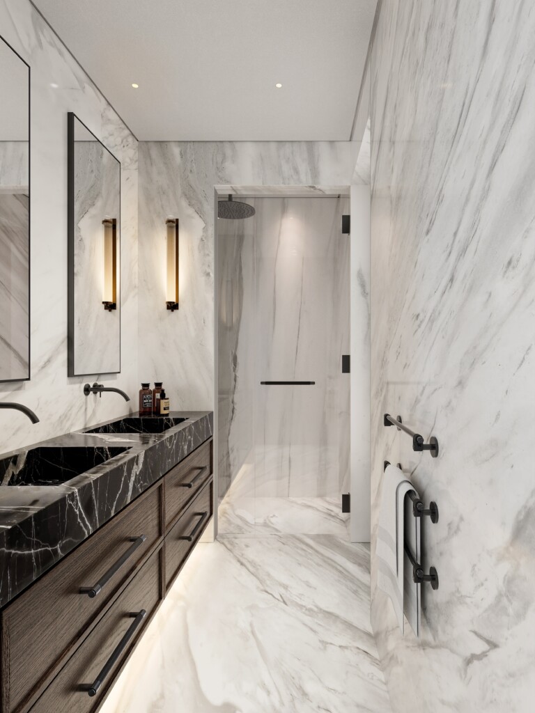 The apartment includes two well-appointed en-suite bedrooms designed for comfort and privacy, along with a guest powder room and a practical laundry area.