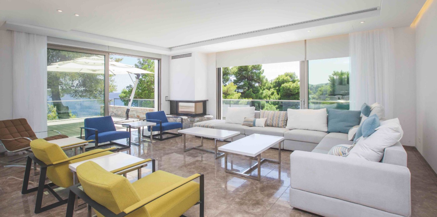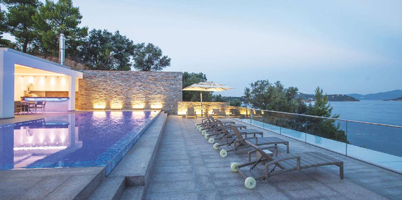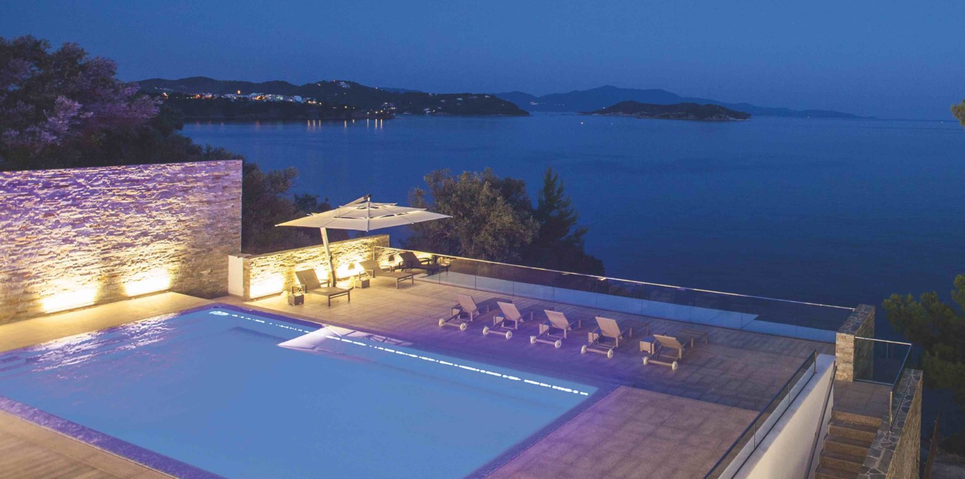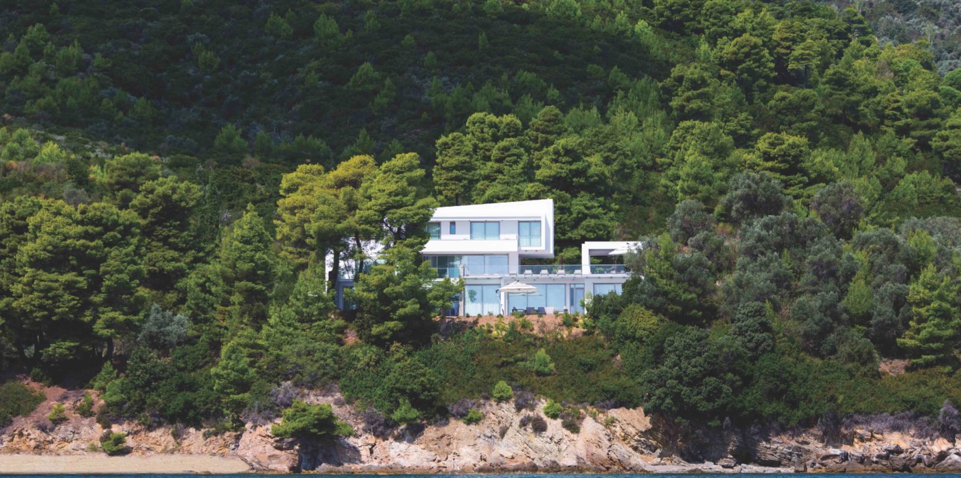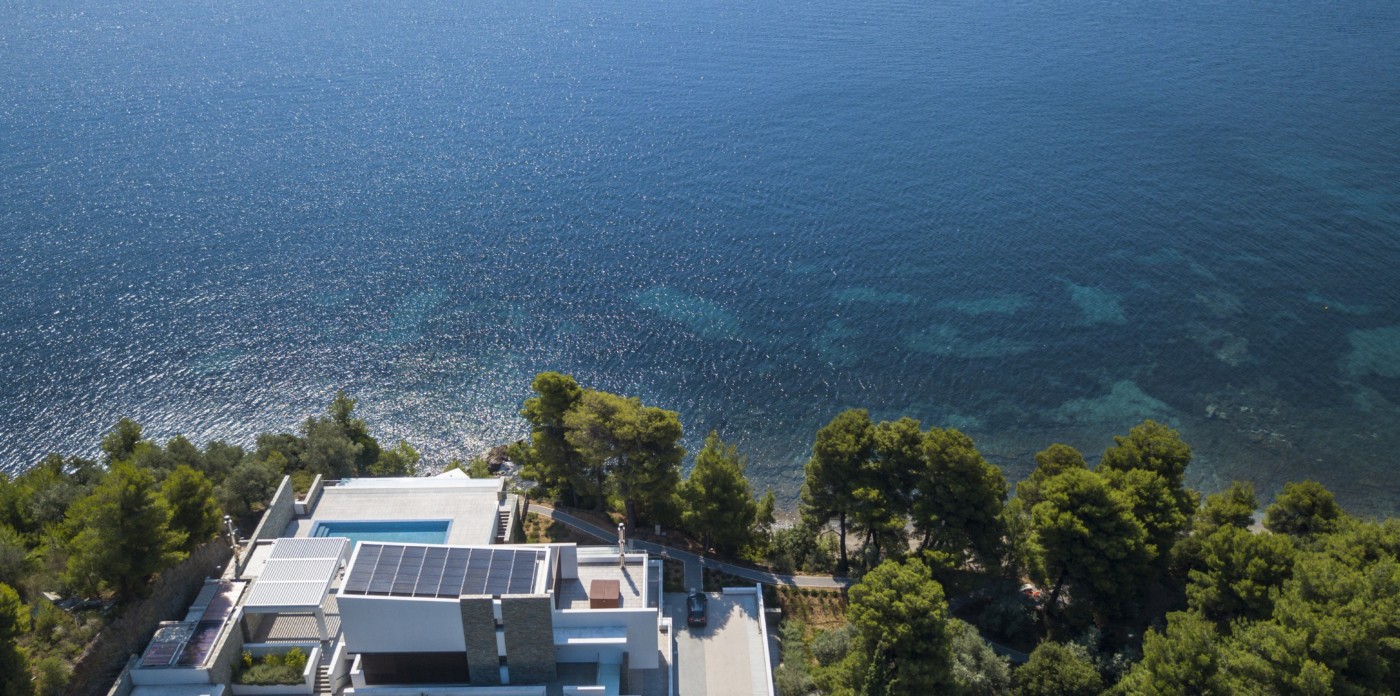 VerdeBlue is a luxury sea-front villa located on the renowned Greek island of Skiathos, Northwest of the Aegean Sea. It is set in one of the most prestigious spots of Skiathos that has been awarded the “Blue Flag” award for its beautiful Mikros Vasilias beach. The property is entirely engulfed in pines trees, olives and luscious oak trees with a panoramic view of the Aegean Sea.