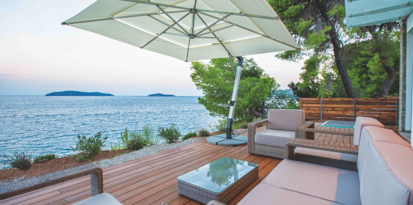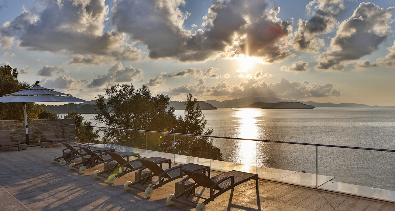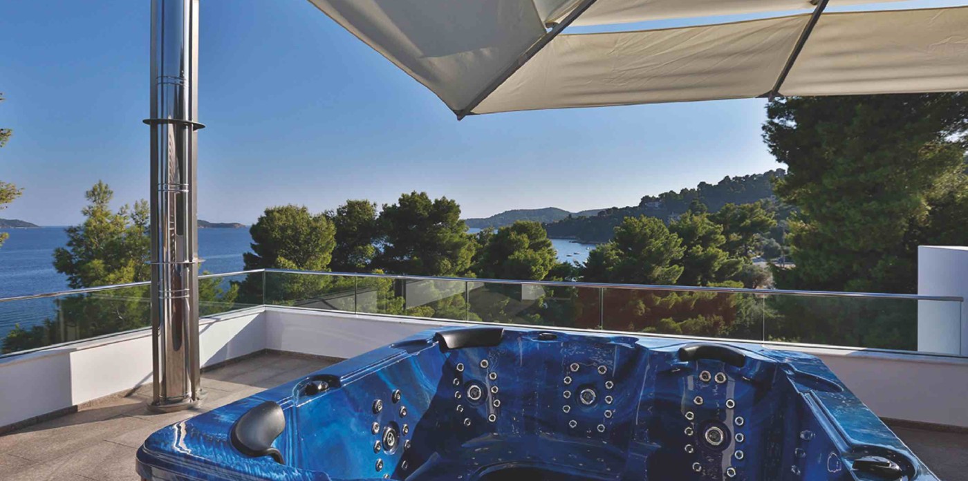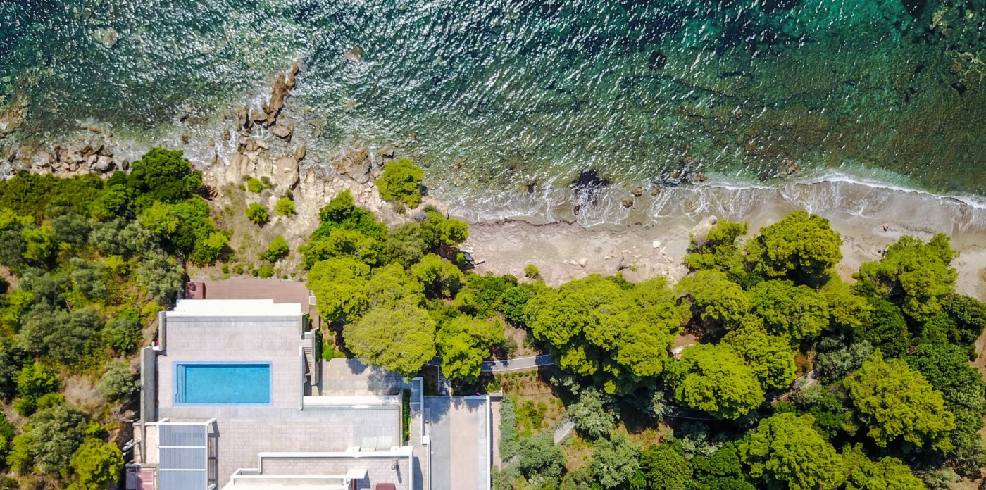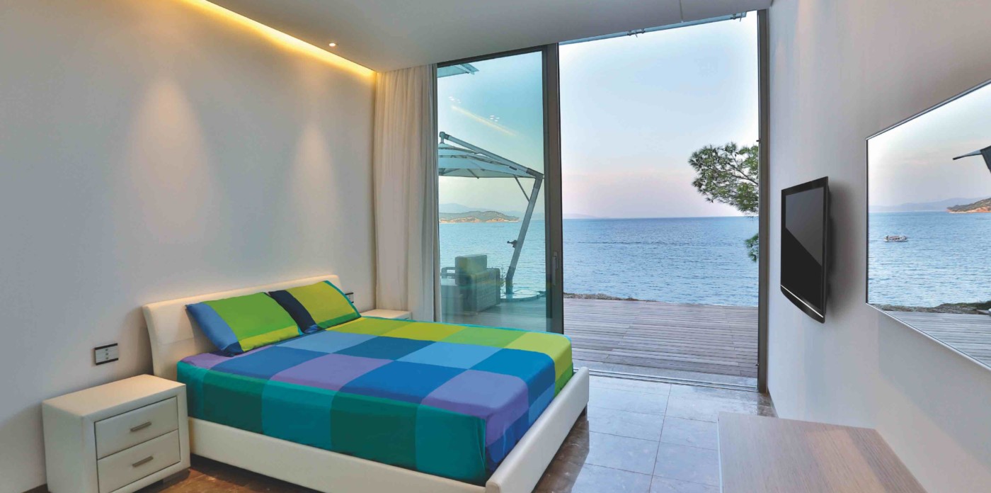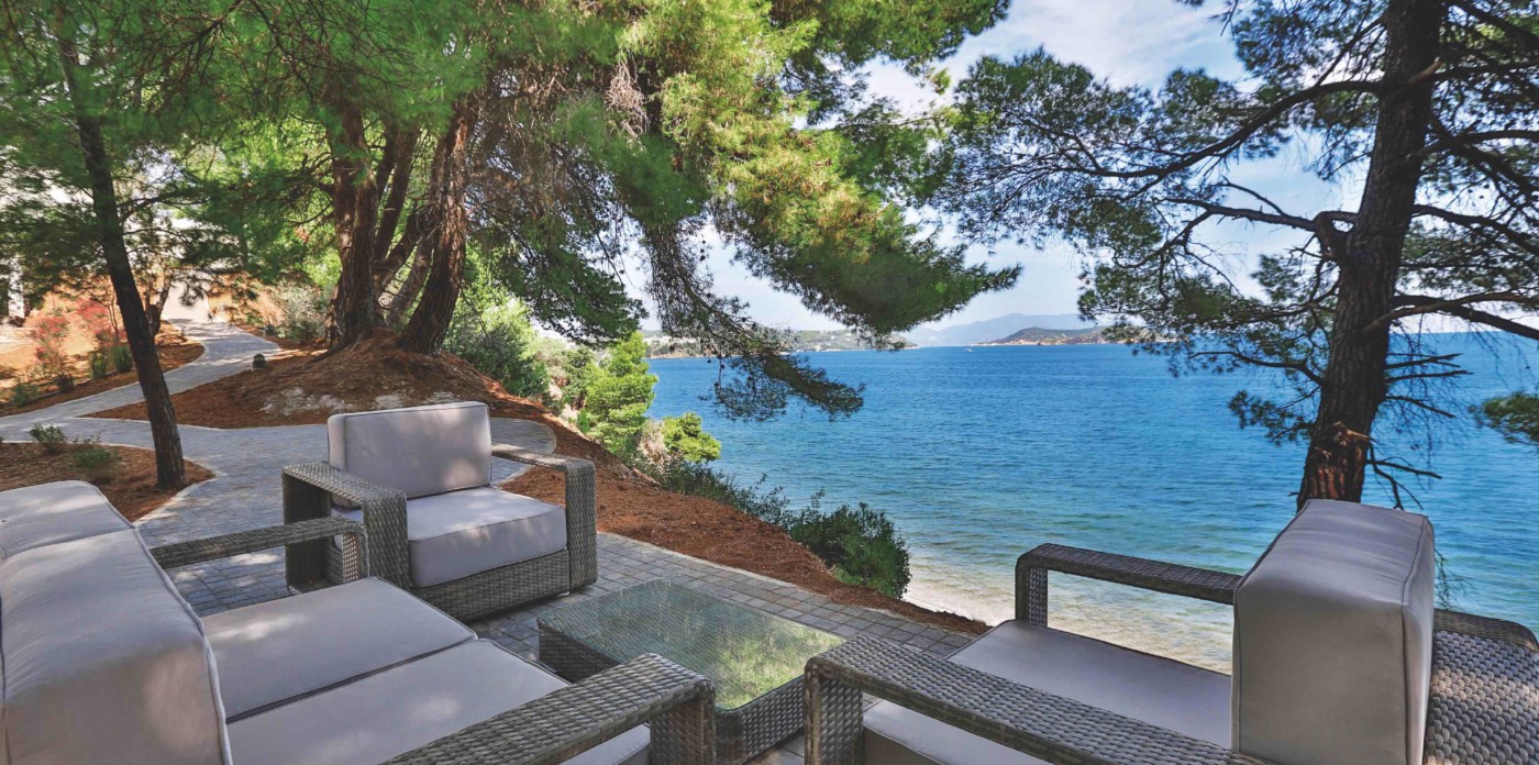 VerdeBlue is a luxury sea-front villa located on the renowned Greek island of Skiathos, Northwest of the Aegean Sea. It is set in one of the most prestigious spots of Skiathos that has been awarded the “Blue Flag” award for its beautiful Mikros Vasilias beach. The property is entirely engulfed in pines trees, olives and luscious oak trees with a panoramic view of the Aegean Sea.