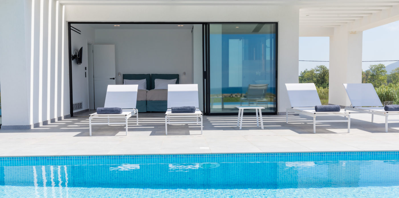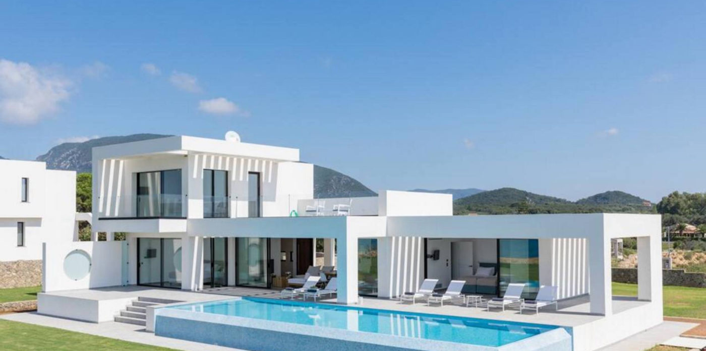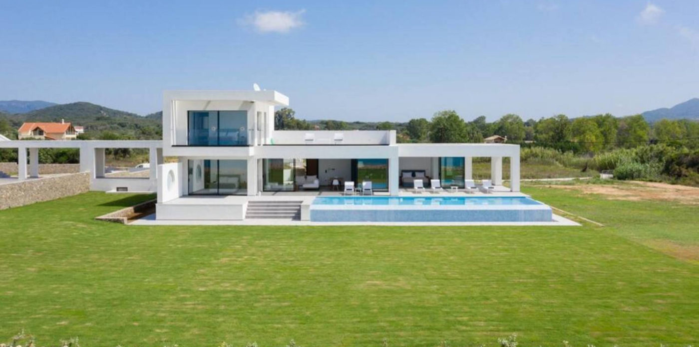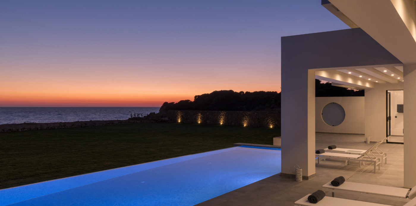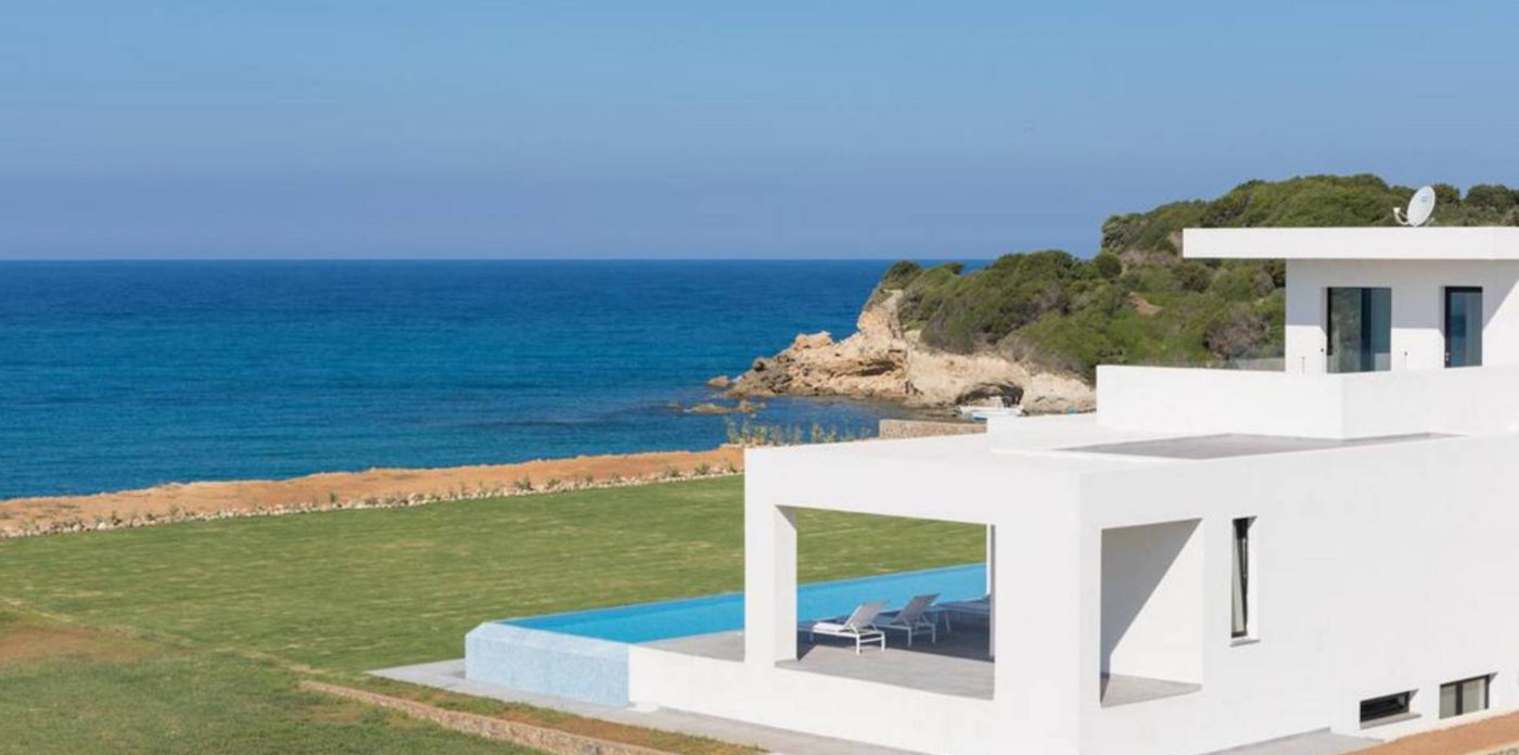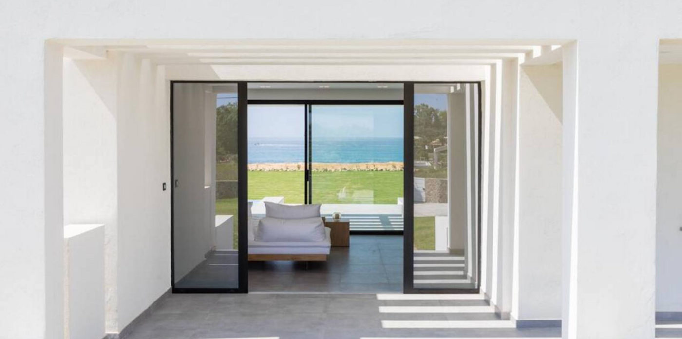 Contemporary style villa with incredible, unobstructed sea views. Located on the seafront, in the a private and peaceful area in Halikounas with direct access to the beach, and very close to the lake of Halikounas. It offers contemporary and functional architecture and design with a careful selection of high-quality materials and finishes.