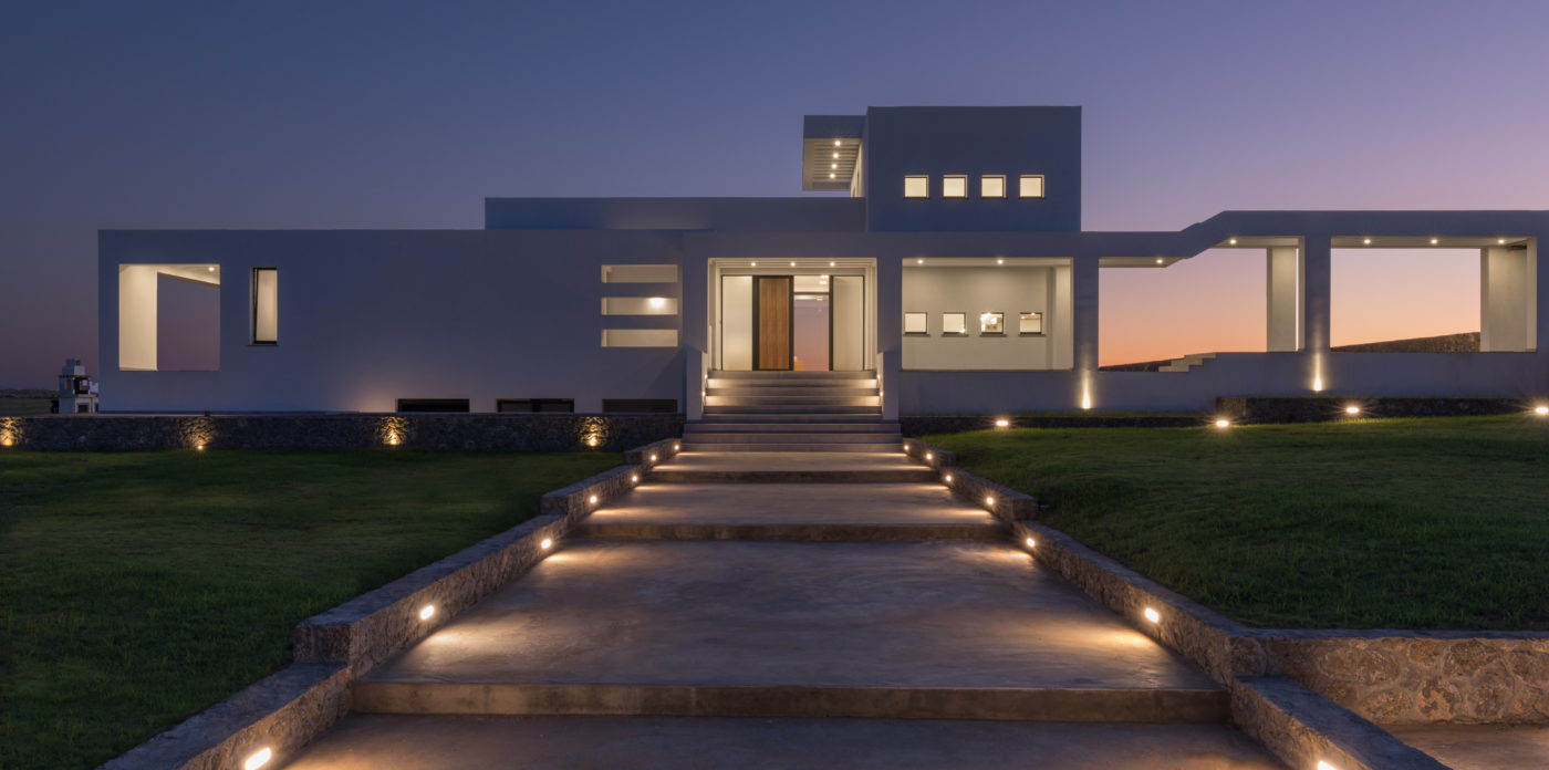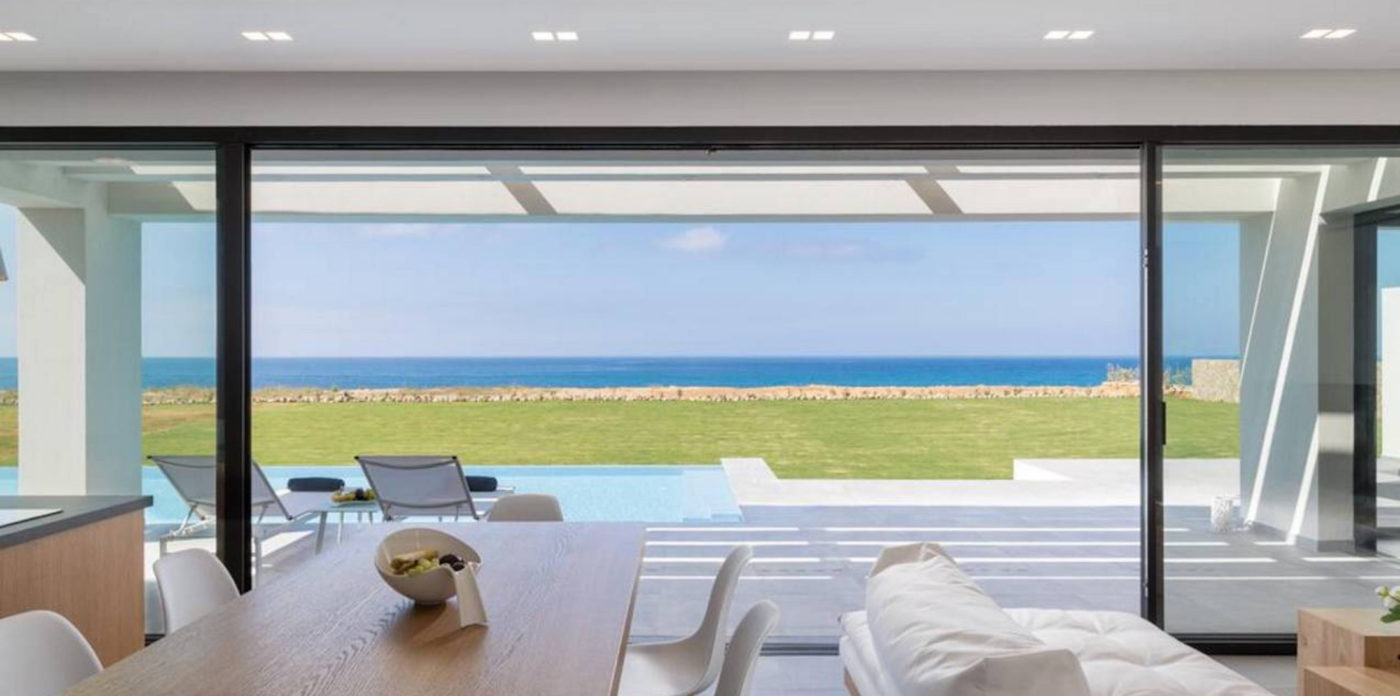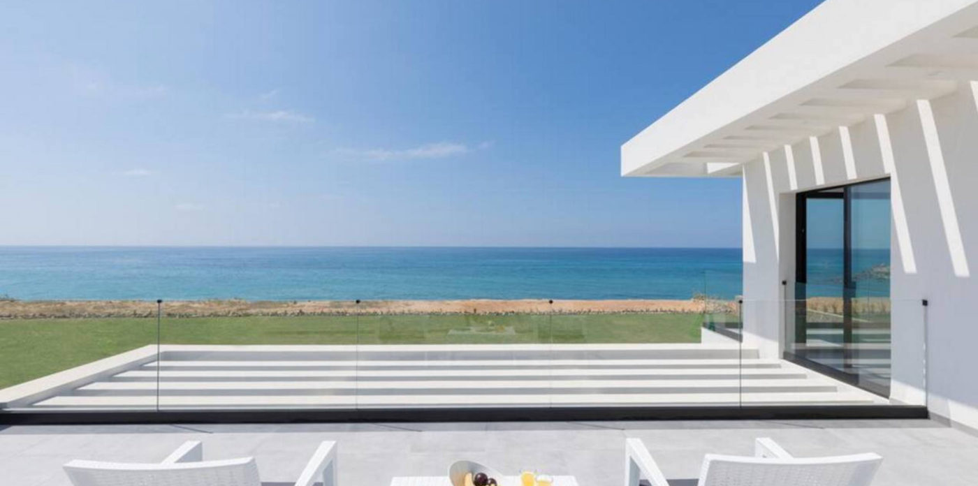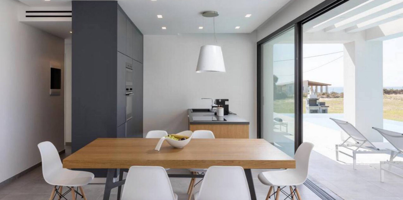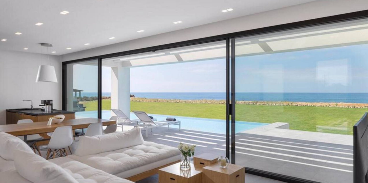 Contemporary style villa with incredible, unobstructed sea views. Located on the seafront, in the a private and peaceful area in Halikounas with direct access to the beach, and very close to the lake of Halikounas. It offers contemporary and functional architecture and design with a careful selection of high-quality materials and finishes.