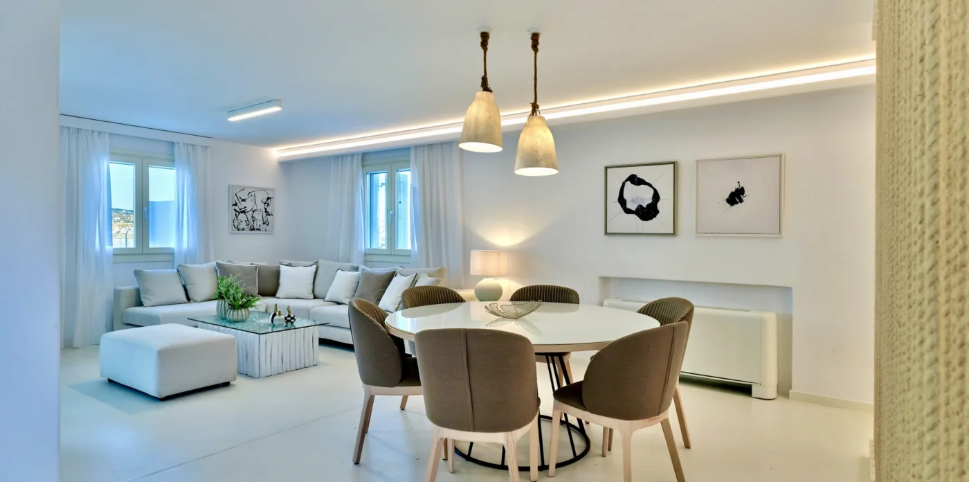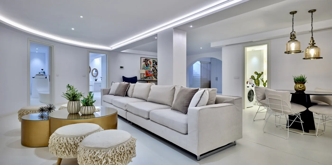 The interior colour palette creates a relaxed atmosphere, each shade carefully chosen to complement the space and enhance the ambience. The design draws inspiration from Cycladic aesthetics, every detail carefully considered to create a cohesive and striking overall effect. The result is perfect for anyone who values simplicity and beauty.