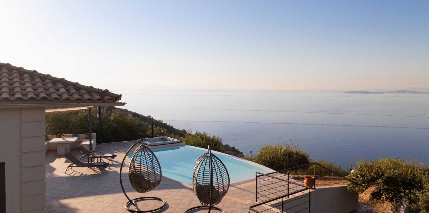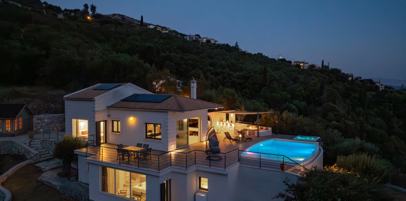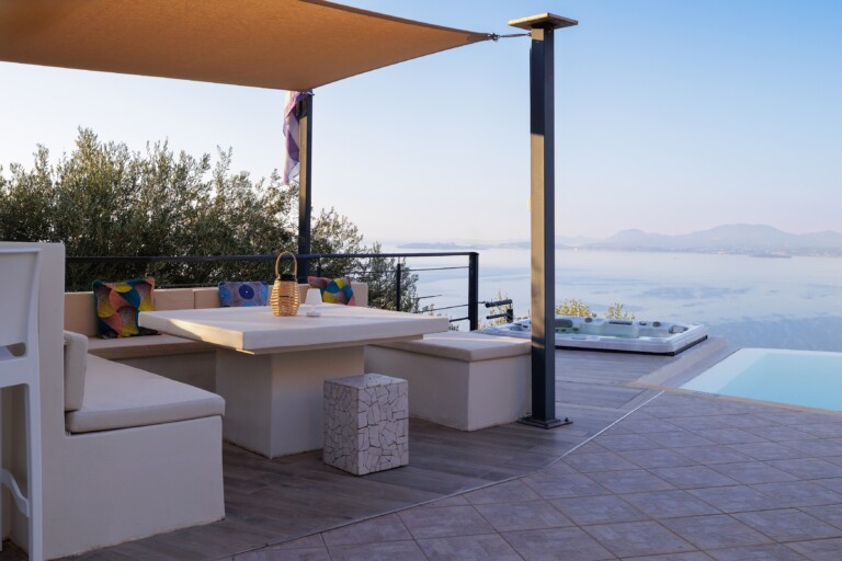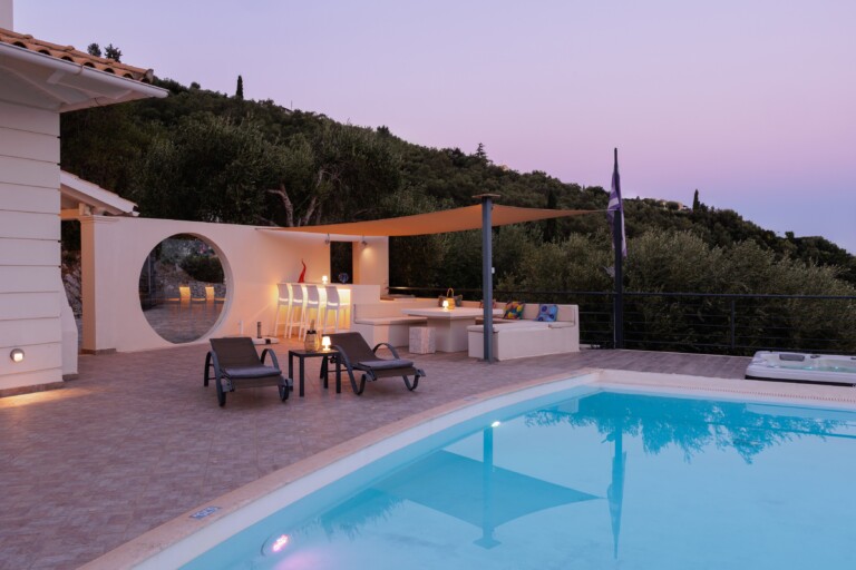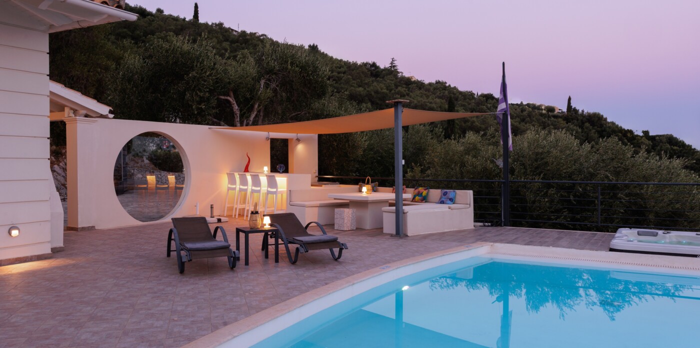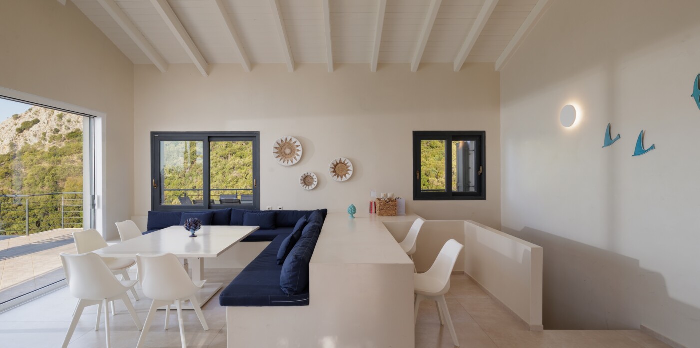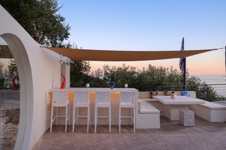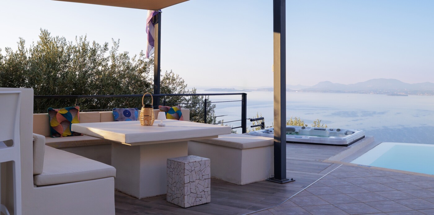 The villa’s infinity pool appears to spill into the Ionian Sea, creating a stunning visual connection between the sky and water. Adjacent to the pool, a jacuzzi and sun-soaked deck invite you to relax and unwind in absolute privacy. The spacious outdoor living area features a large dining table, comfortable lounge seating, and a fully equipped outdoor kitchen and bar—perfect for al fresco meals, entertaining guests, or simply savouring the view.
