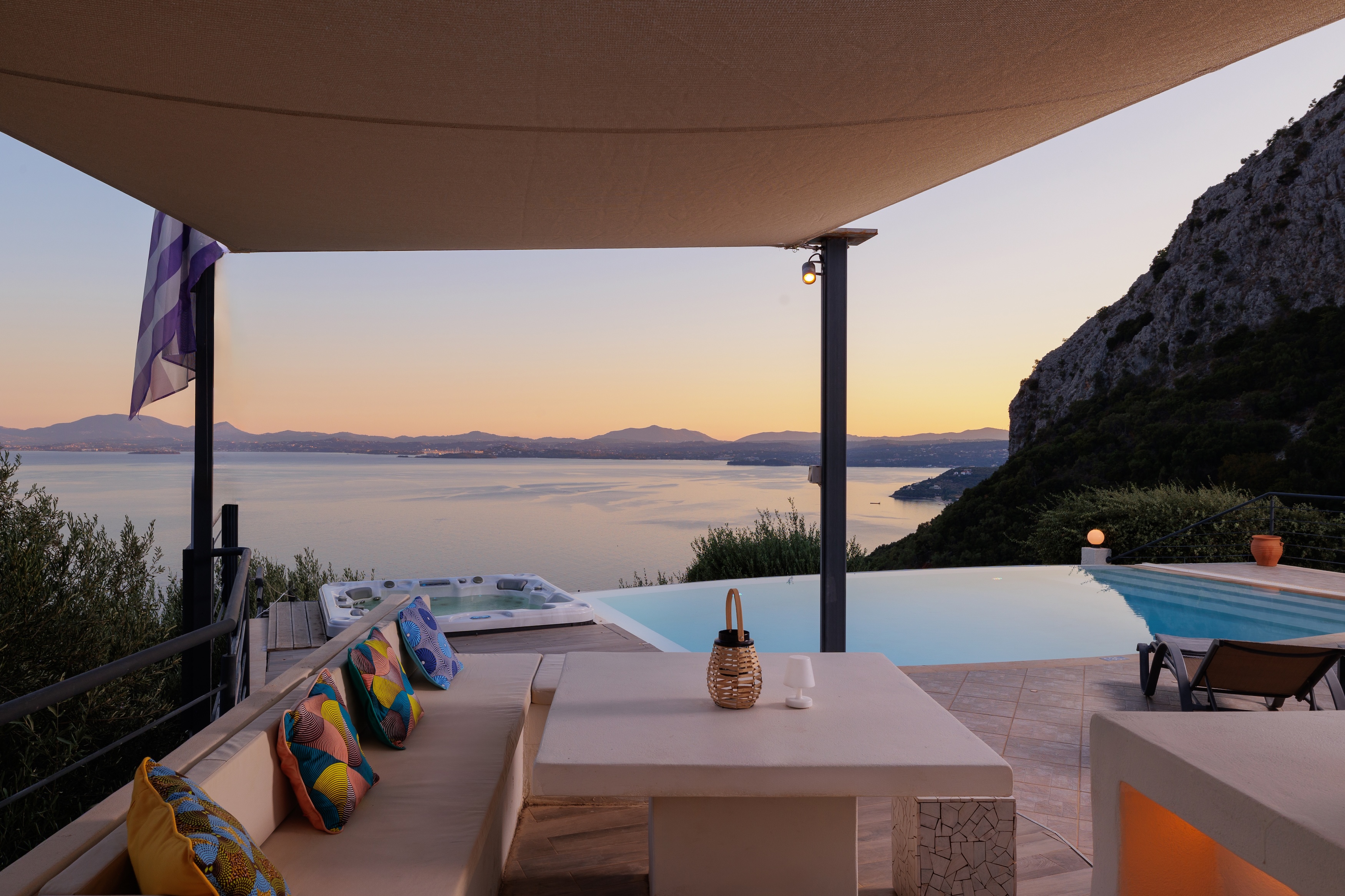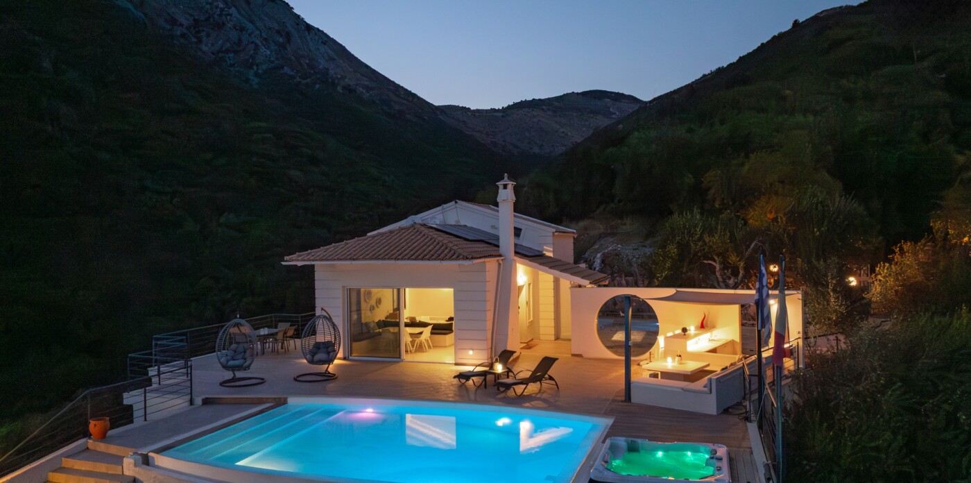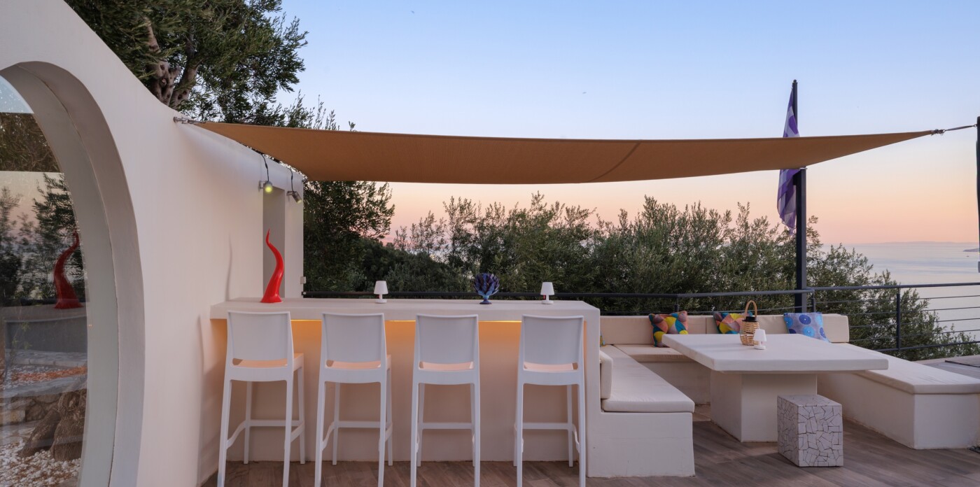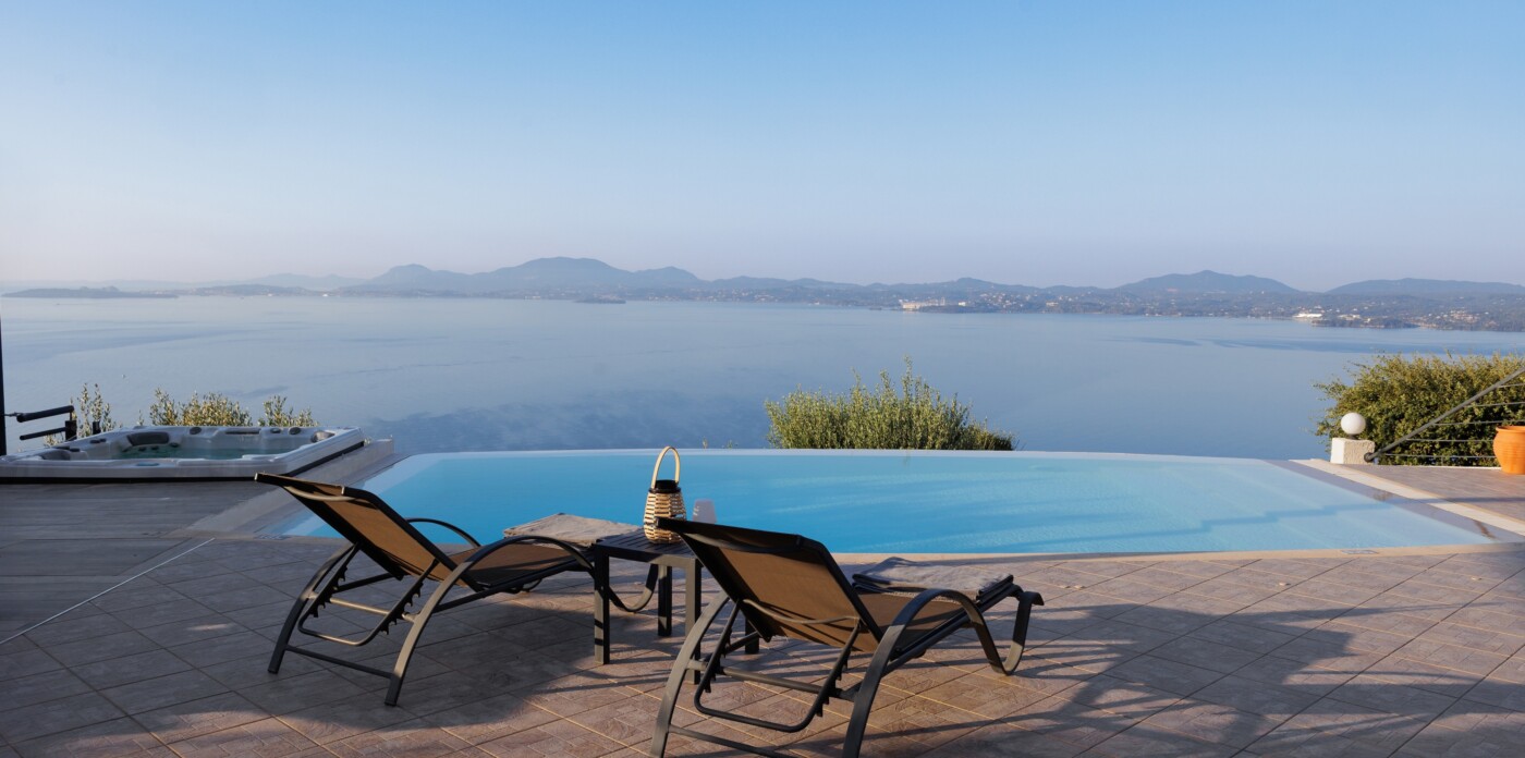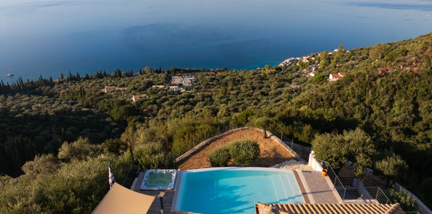 The villa’s infinity pool appears to spill into the Ionian Sea, creating a stunning visual connection between the sky and water. Adjacent to the pool, a jacuzzi and sun-soaked deck invite you to relax and unwind in absolute privacy. The spacious outdoor living area features a large dining table, comfortable lounge seating, and a fully equipped outdoor kitchen and bar—perfect for al fresco meals, entertaining guests, or simply savouring the view.