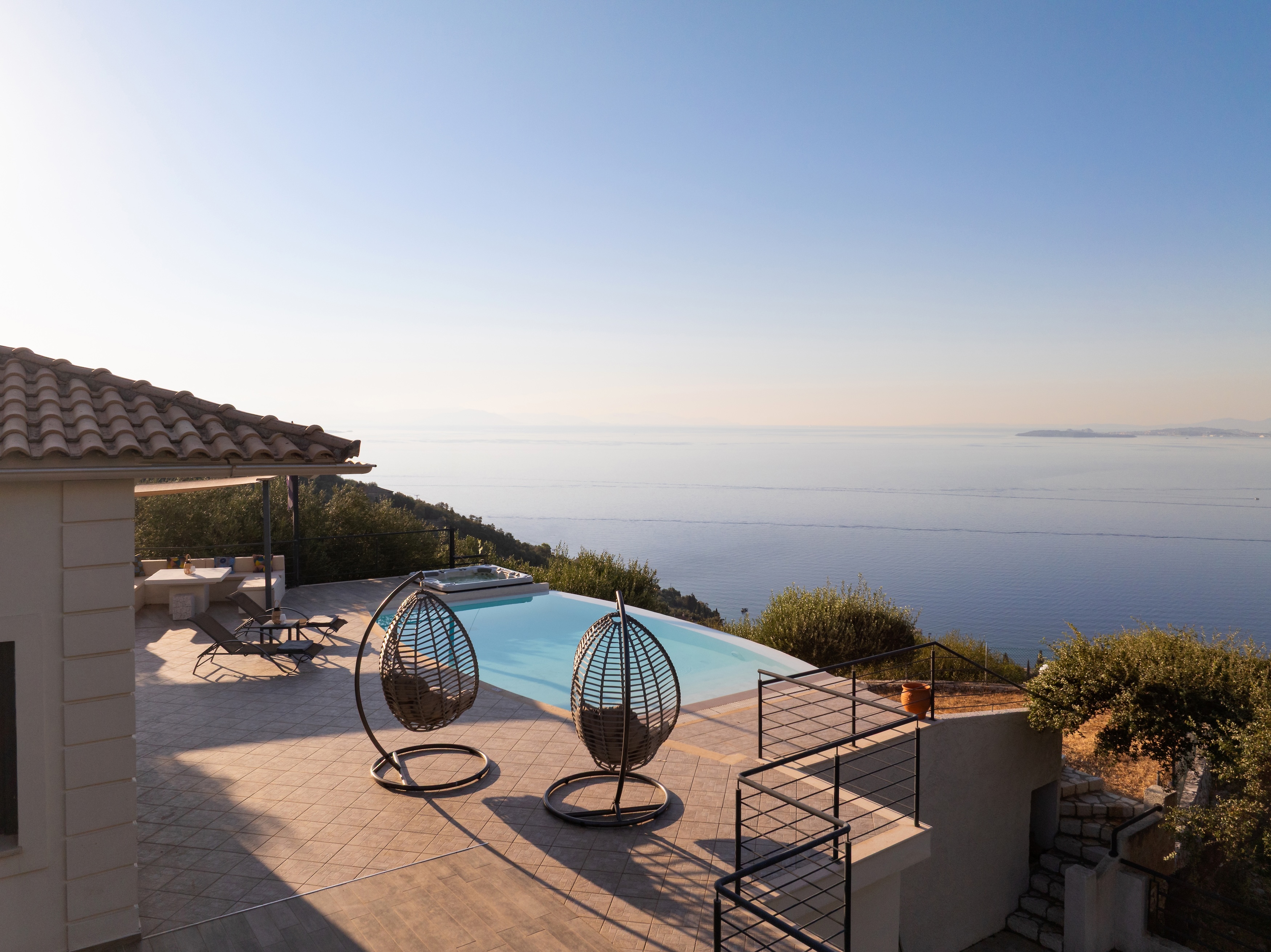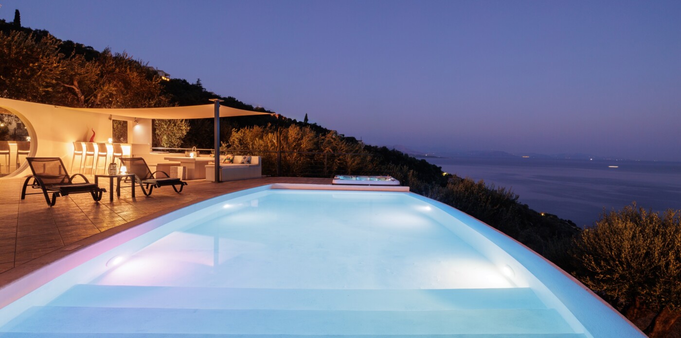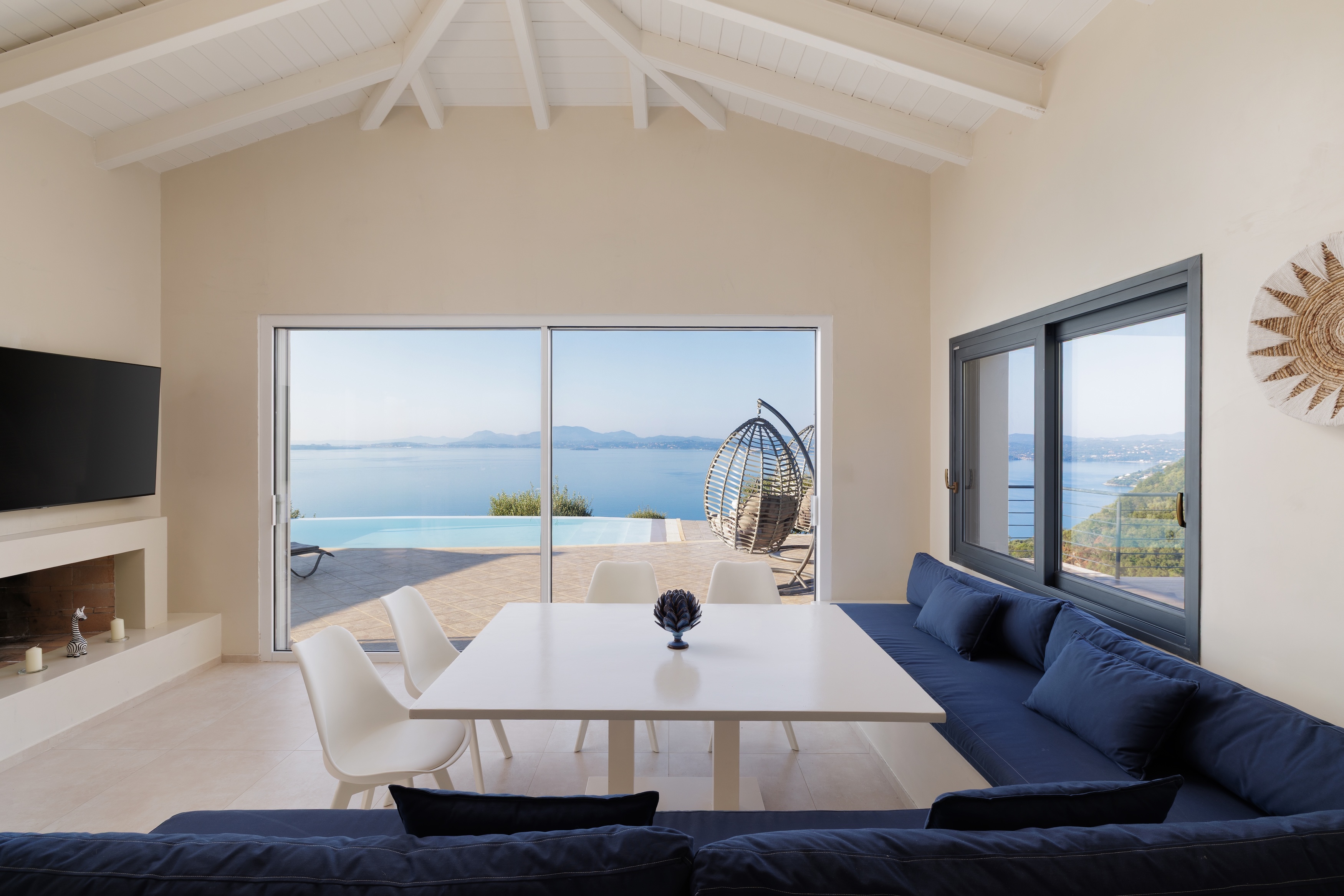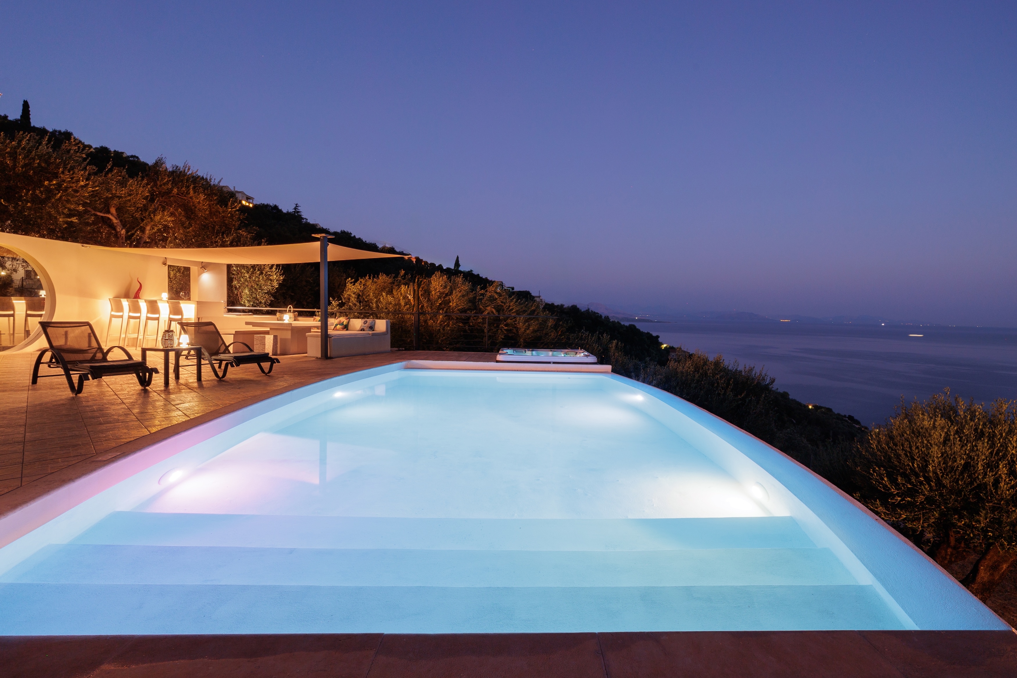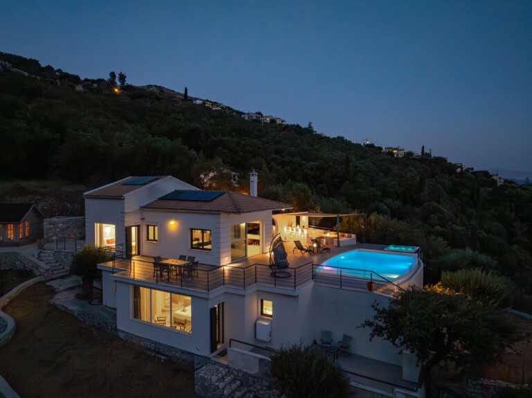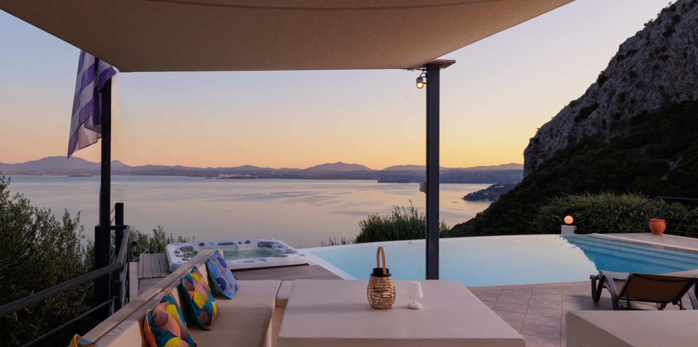 The villa’s infinity pool appears to spill into the Ionian Sea, creating a stunning visual connection between the sky and water. Adjacent to the pool, a jacuzzi and sun-soaked deck invite you to relax and unwind in absolute privacy. The spacious outdoor living area features a large dining table, comfortable lounge seating, and a fully equipped outdoor kitchen and bar—perfect for al fresco meals, entertaining guests, or simply savouring the view.