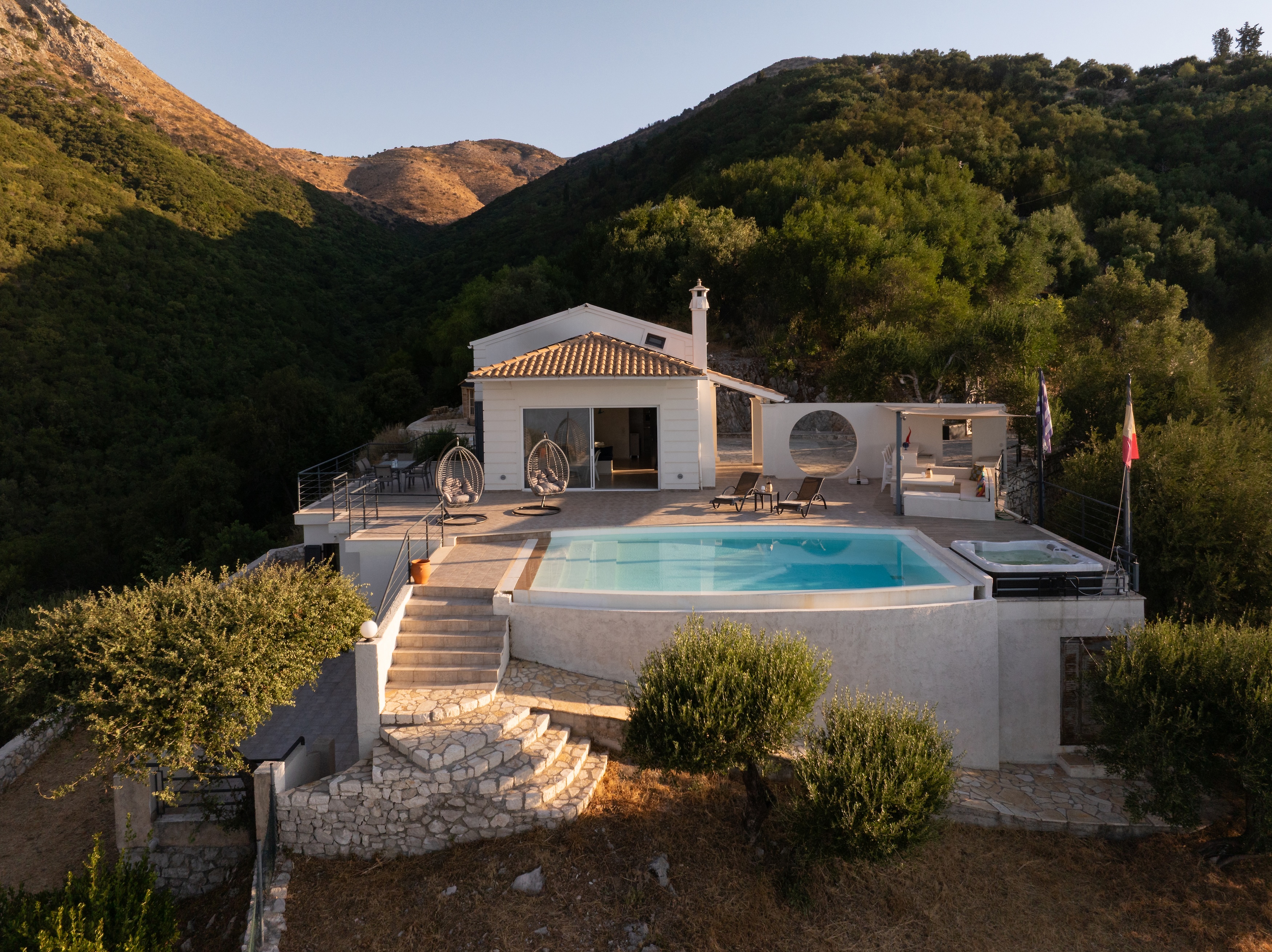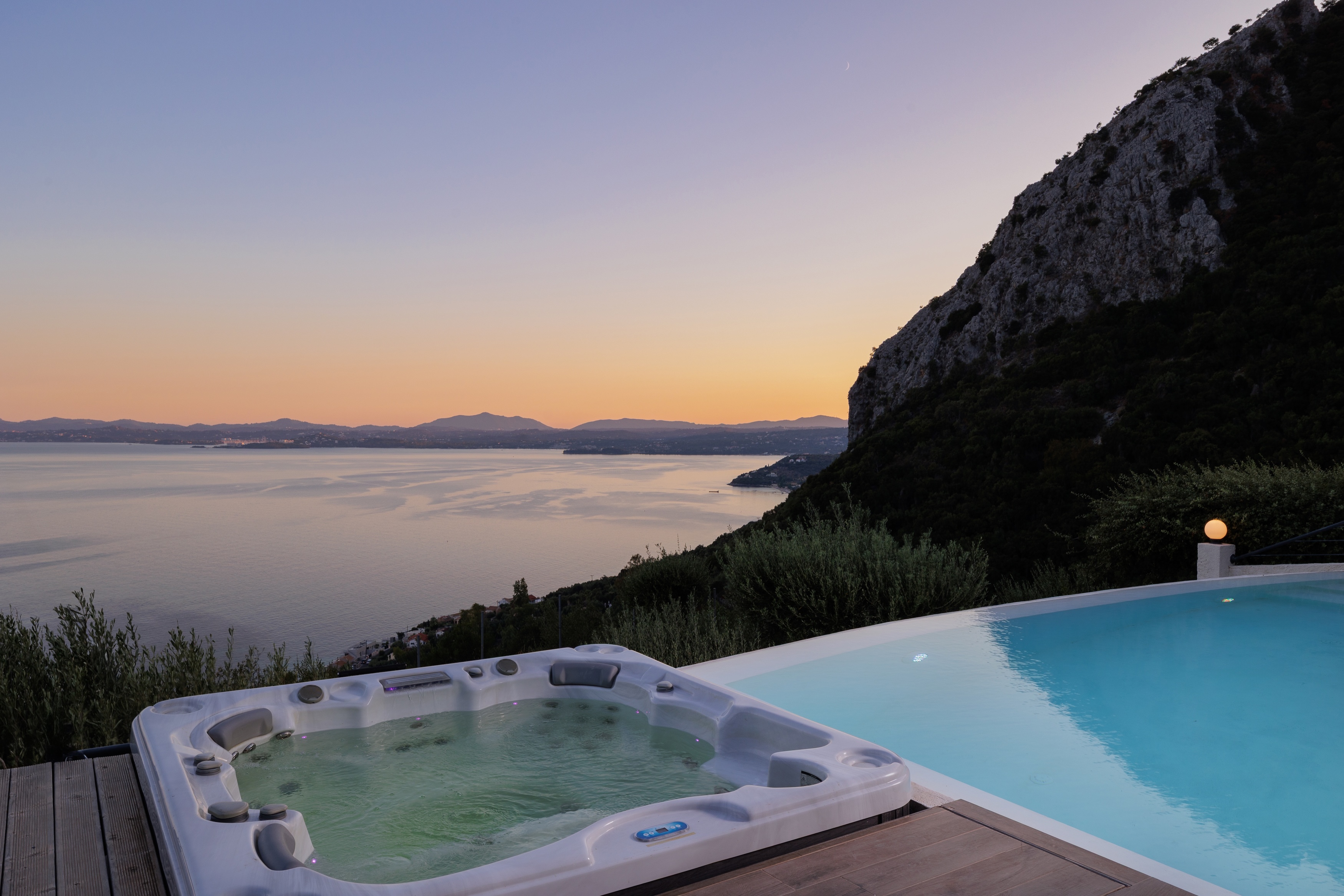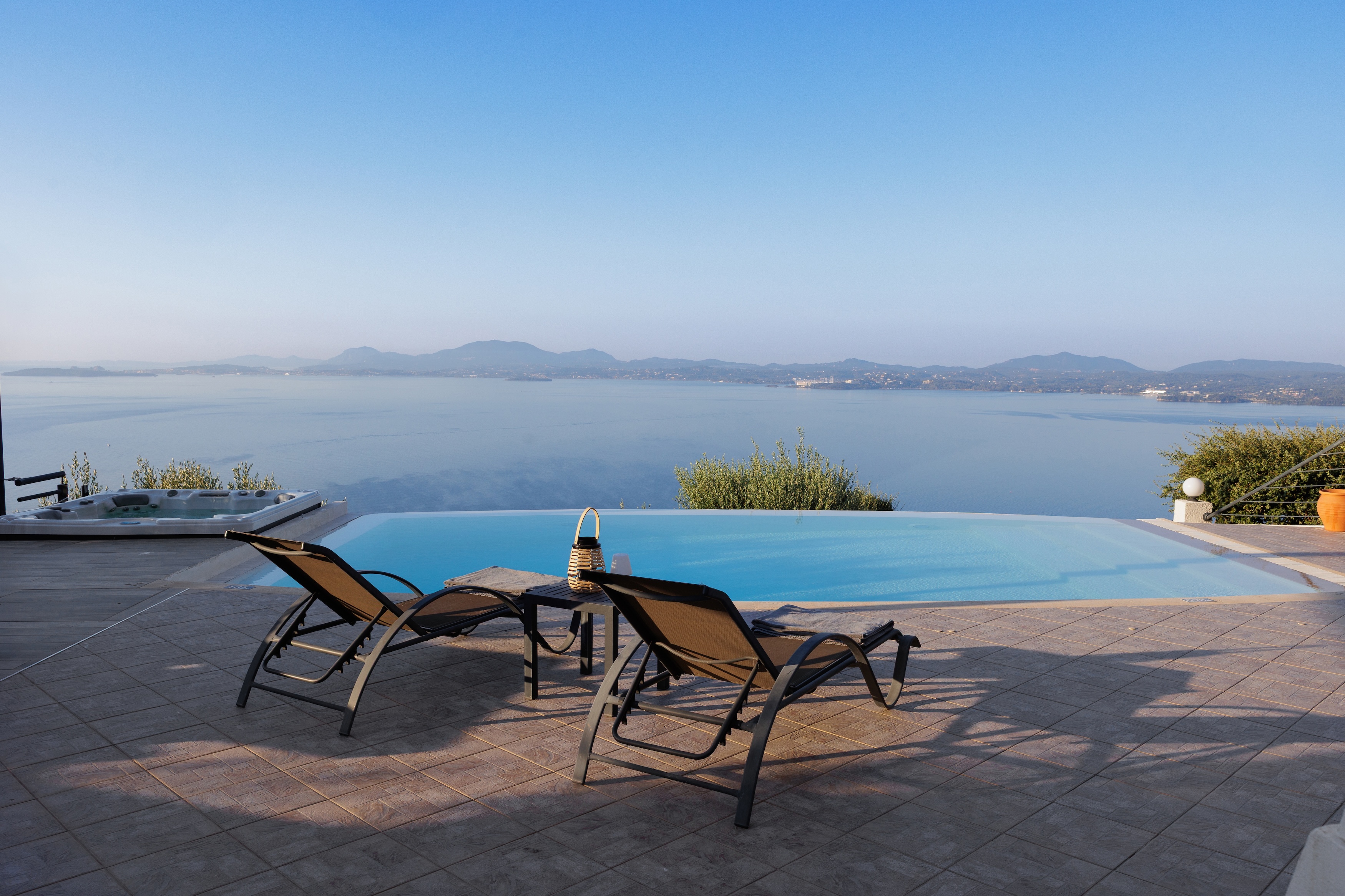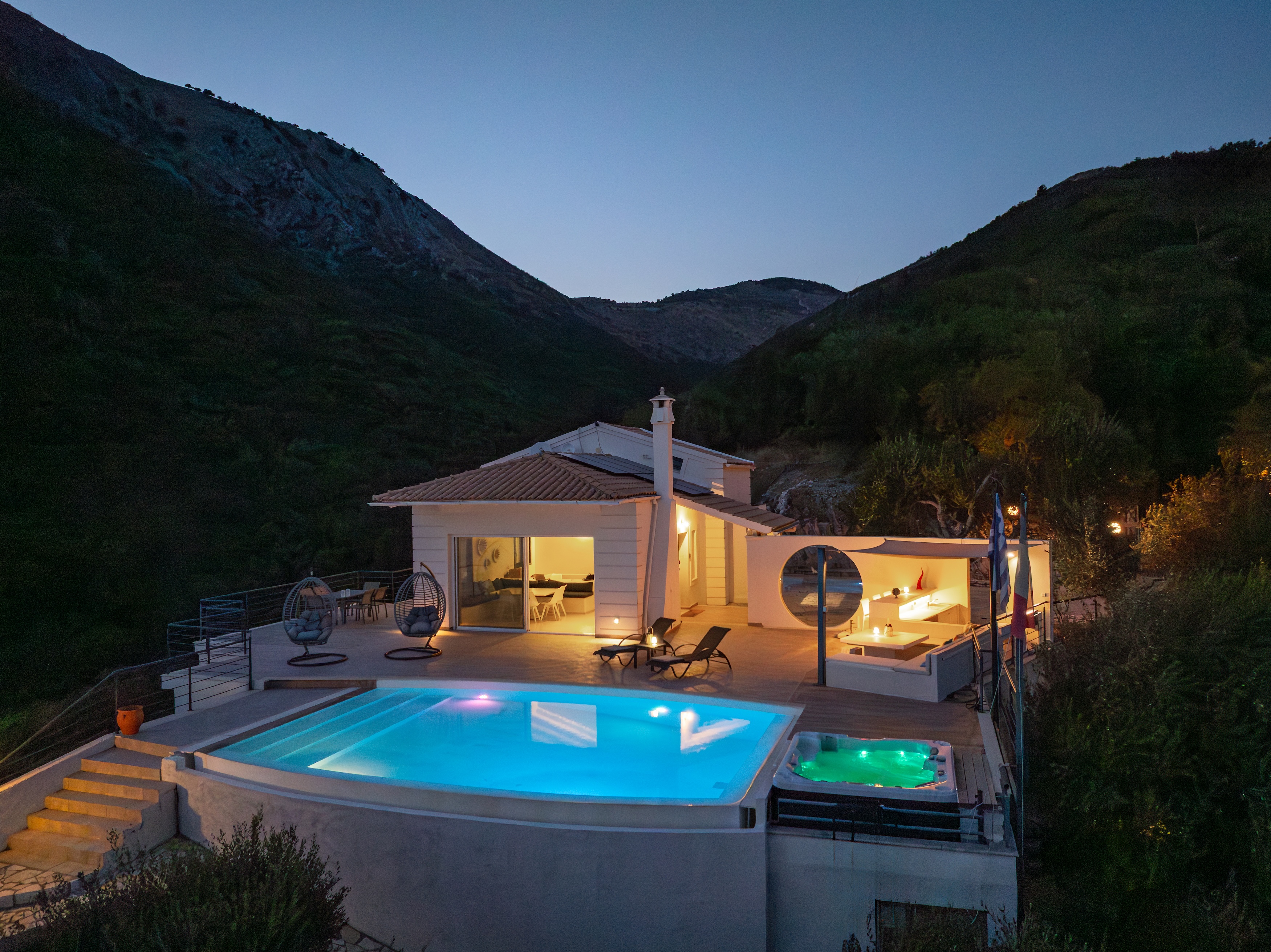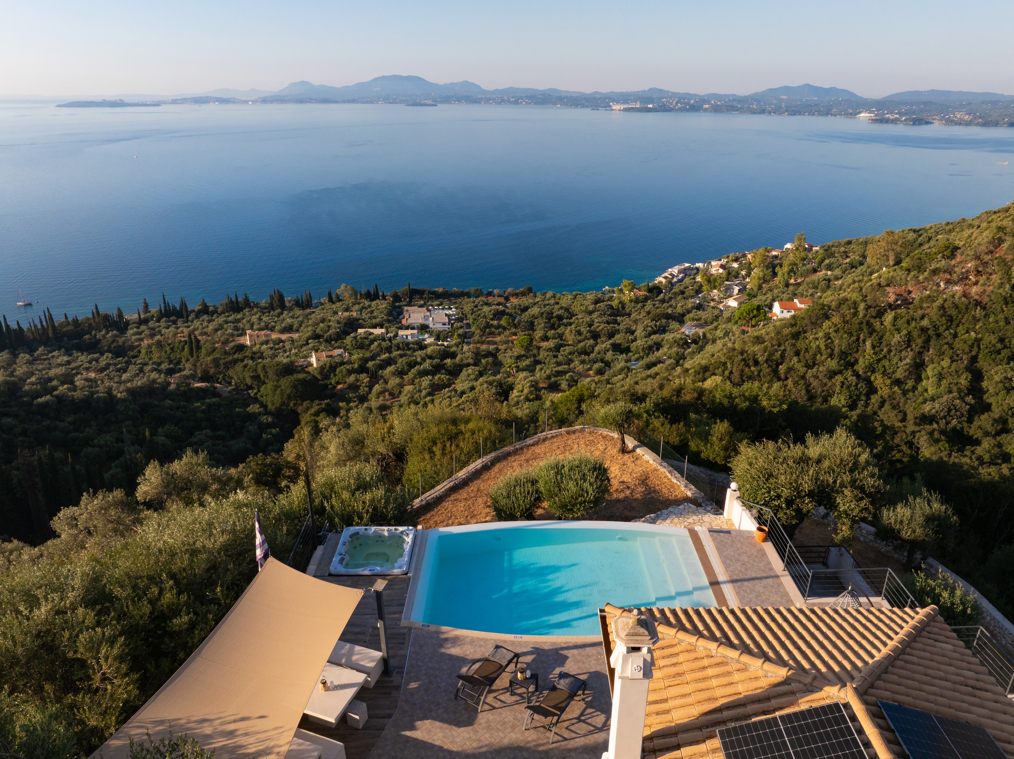 The villa’s infinity pool appears to spill into the Ionian Sea, creating a stunning visual connection between the sky and water. Adjacent to the pool, a jacuzzi and sun-soaked deck invite you to relax and unwind in absolute privacy. The spacious outdoor living area features a large dining table, comfortable lounge seating, and a fully equipped outdoor kitchen and bar—perfect for al fresco meals, entertaining guests, or simply savouring the view.
