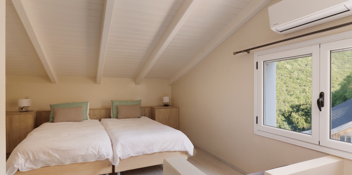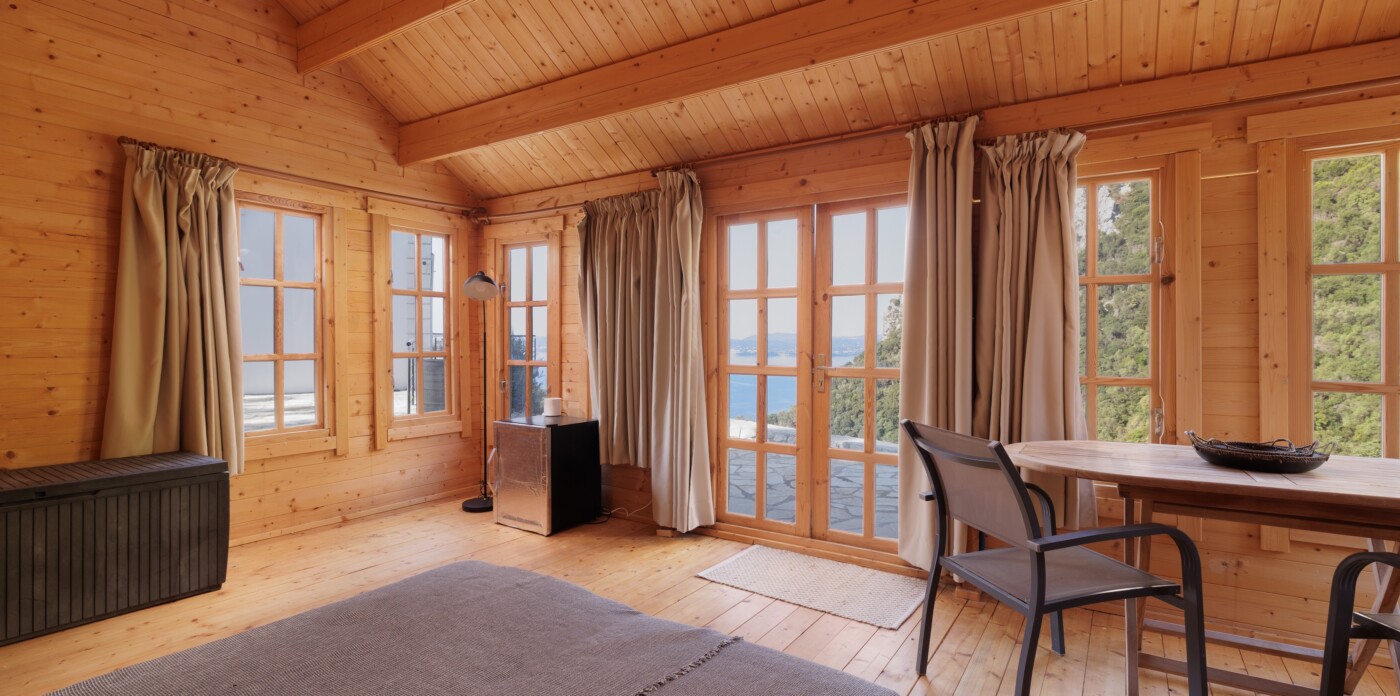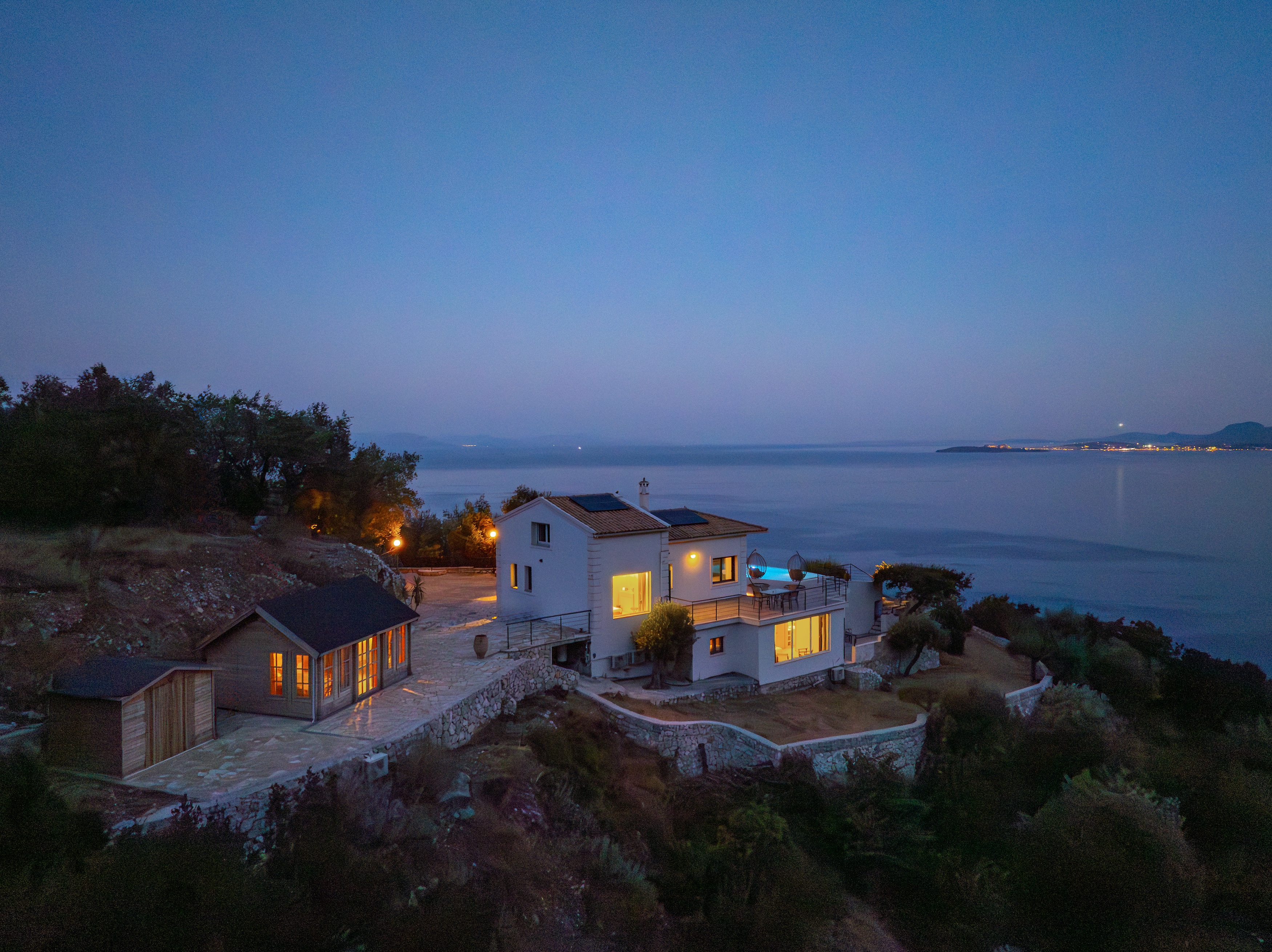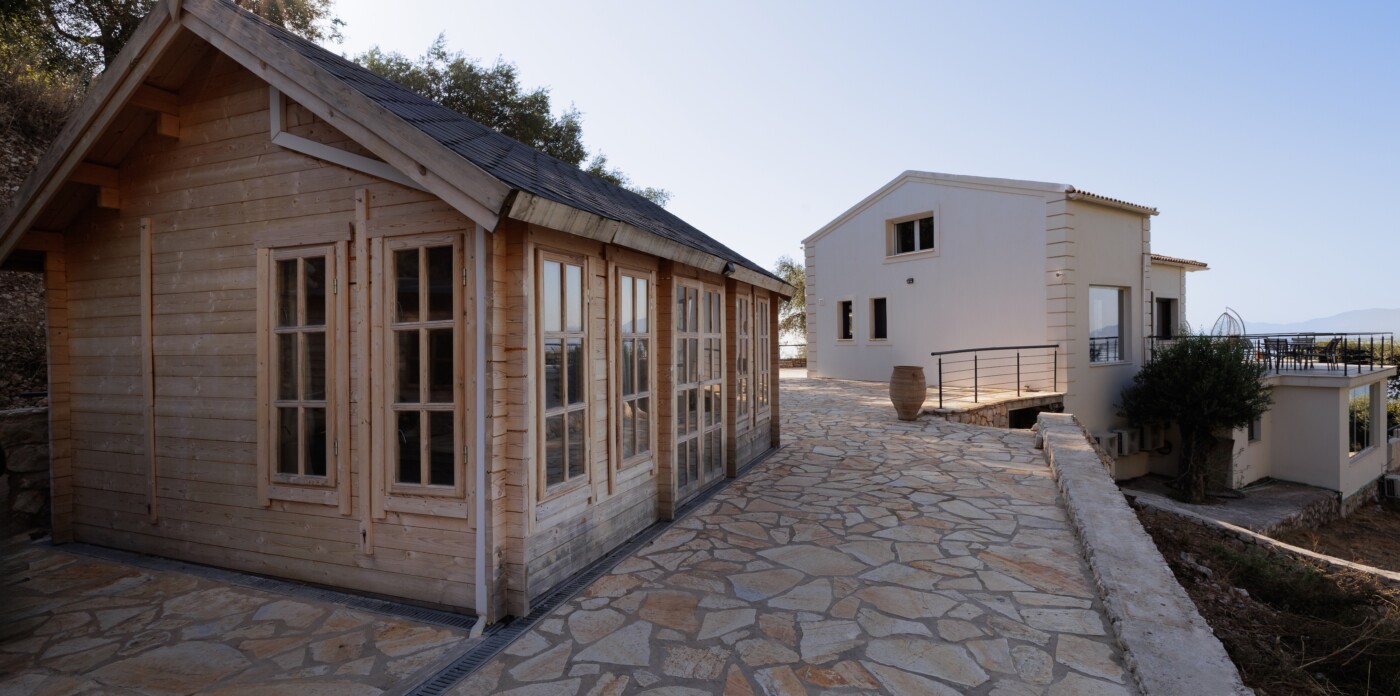 Indoors, the villa boasts two bright bedrooms, two modern bathrooms, and an open-concept living space that gracefully transitions to the outdoors. Elegant finishes and panoramic windows ensure the sea and landscape are integral to almost every room. A charming wooden guest house provides extra space for guests, while 40 sq.m. of additional building potential offers exciting possibilities.
