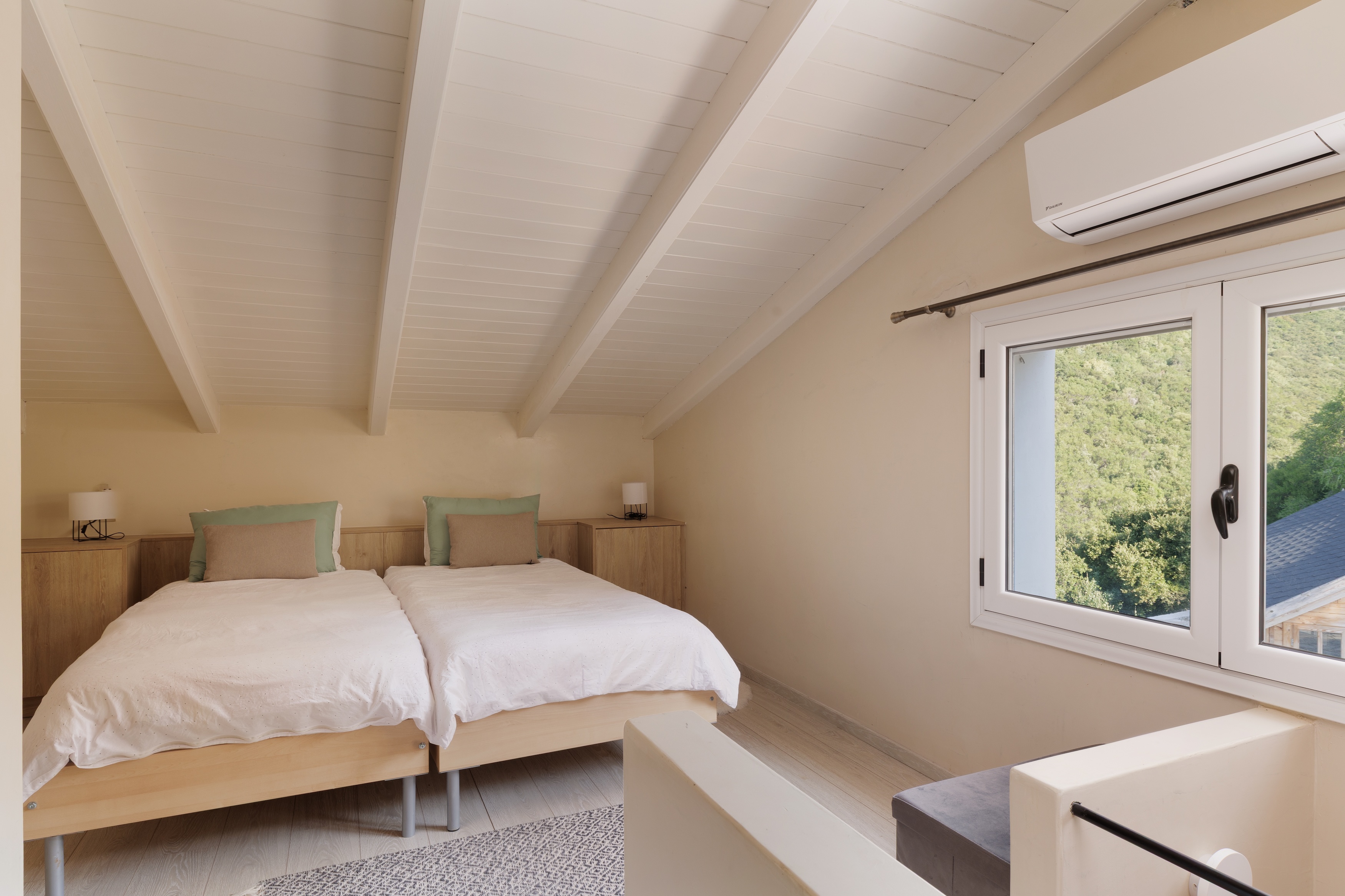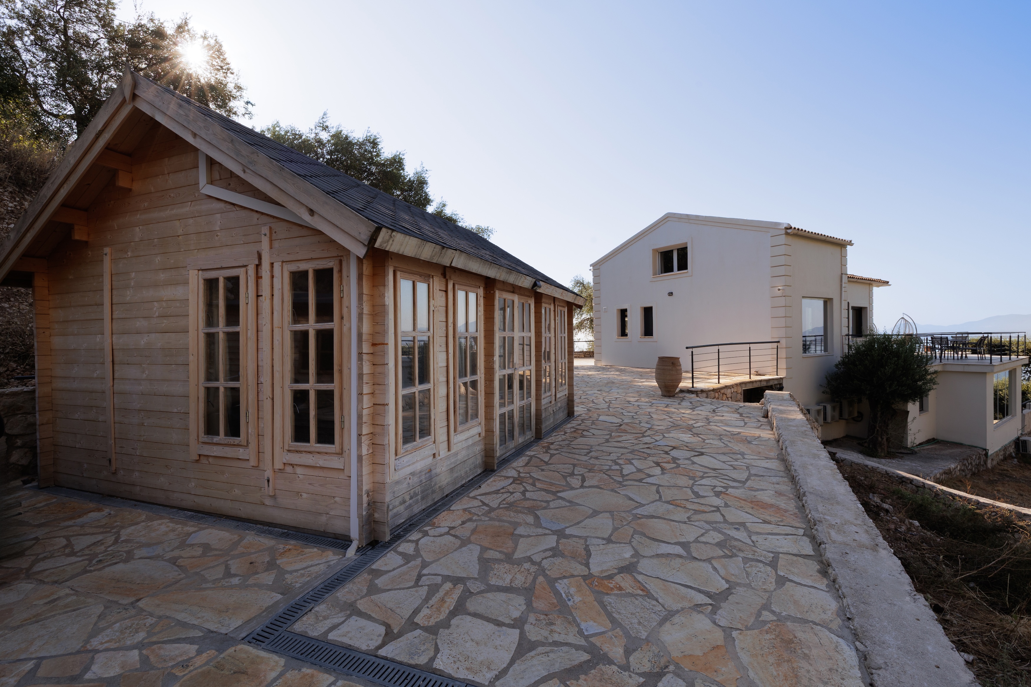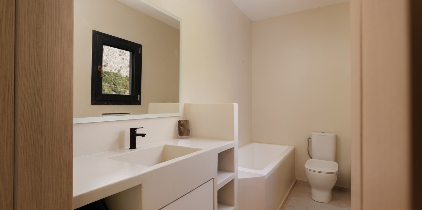 Indoors, the villa boasts two bright bedrooms, two modern bathrooms, and an open-concept living space that gracefully transitions to the outdoors. Elegant finishes and panoramic windows ensure the sea and landscape are integral to almost every room. A charming wooden guest house provides extra space for guests, while 40 sq.m. of additional building potential offers exciting possibilities.