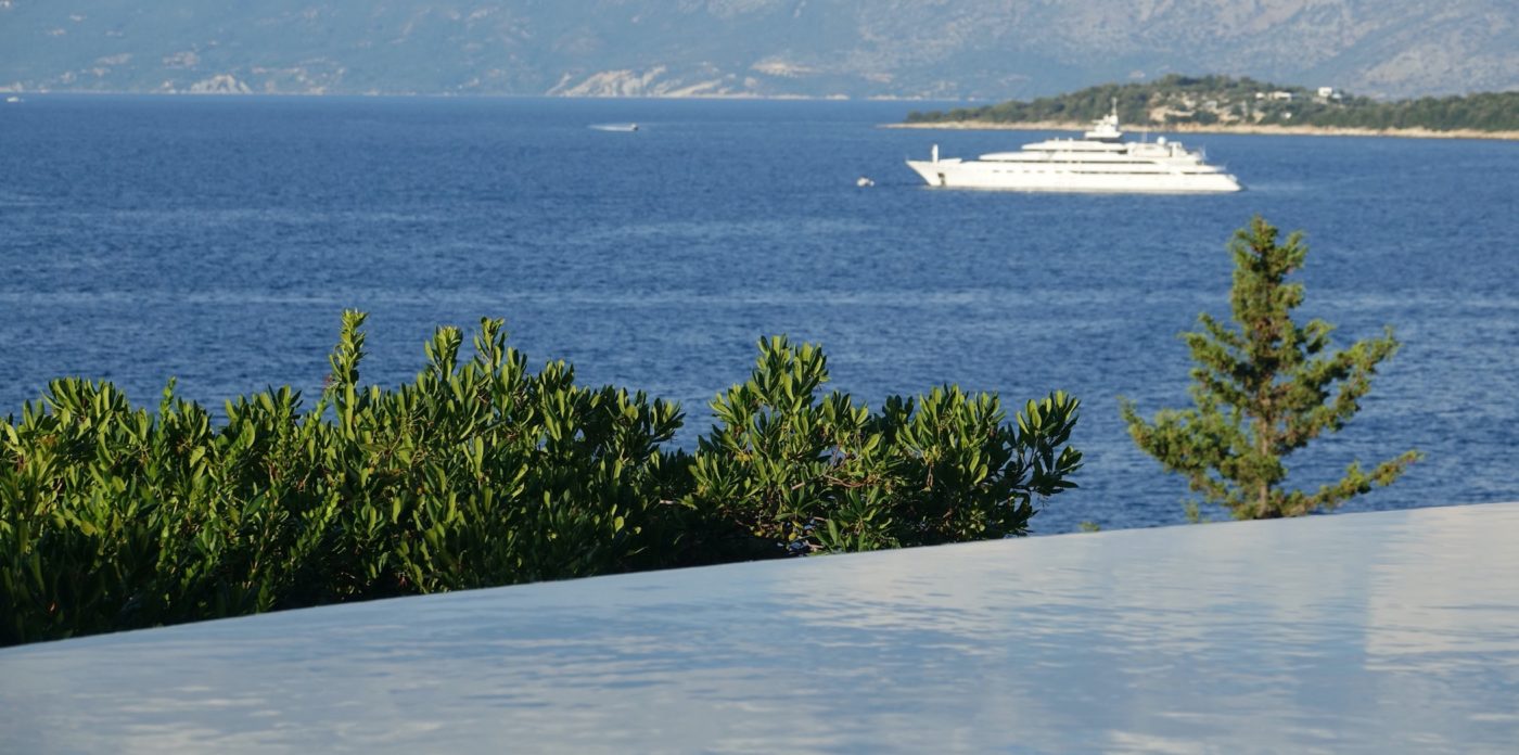 The second lounge on the upper floor, decorated in the same spirit and style as the main lounge, with its own balcony offers amazing sea views. Great attention has been given to the outdoor spaces as pergola-shaded areas and large verandas give numerous alternatives for lounging and dining throughout the day. The private infinity swimming pool runs the length of the garden at the front of the villa and offers breathtaking sunset views.