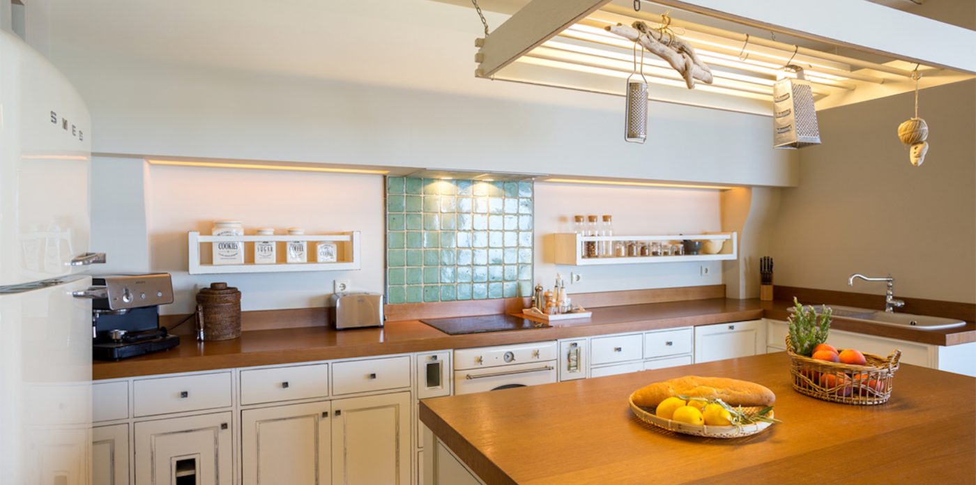 The interiors feature large, comfortable spaces with unstoppable outdoor views, elegantly framed by French windows. Decorated in pastel colours, its open plan lounge–dining area and fully-equipped kitchen offer fabulous views to the turquoise sea and allow natural light to alternate throughout the day. Natural materials together with a full range of amenities and comfortable furnishings contribute to the sense of ultimate relaxation.