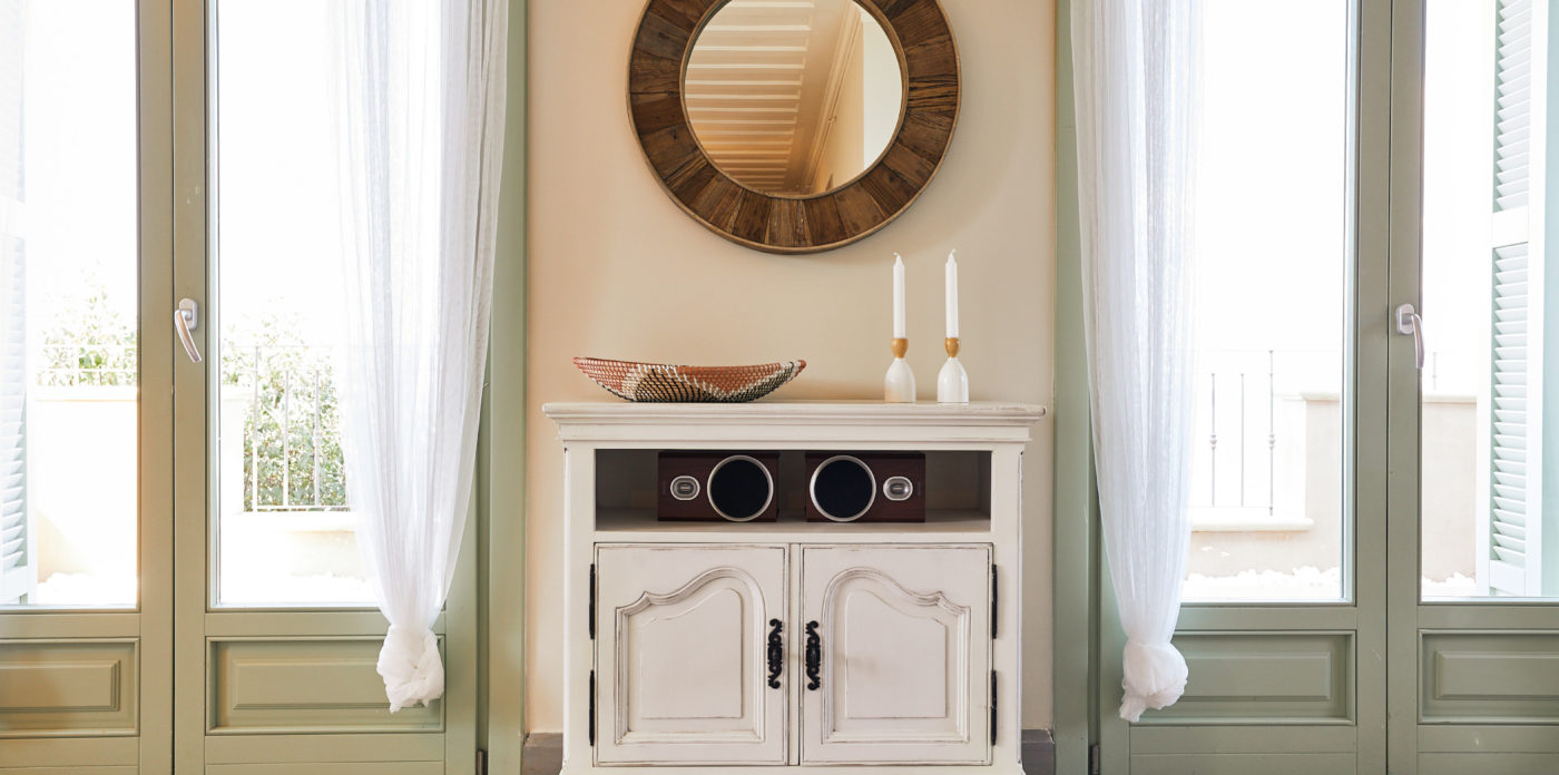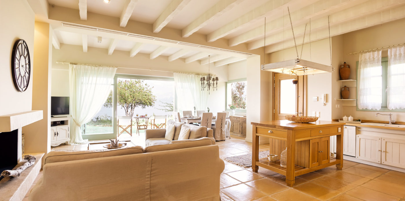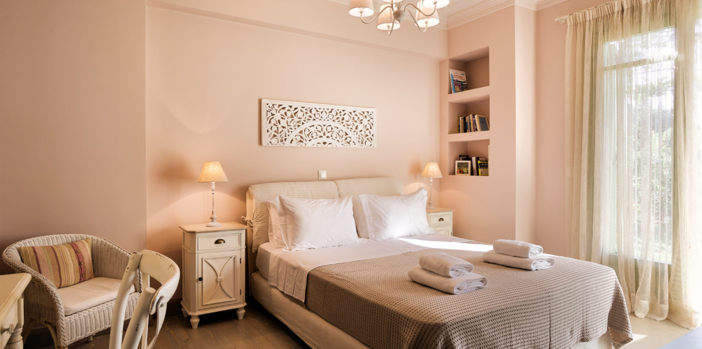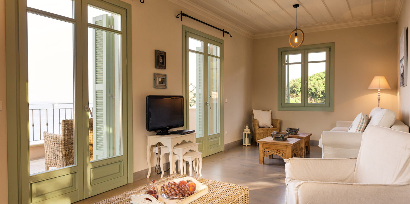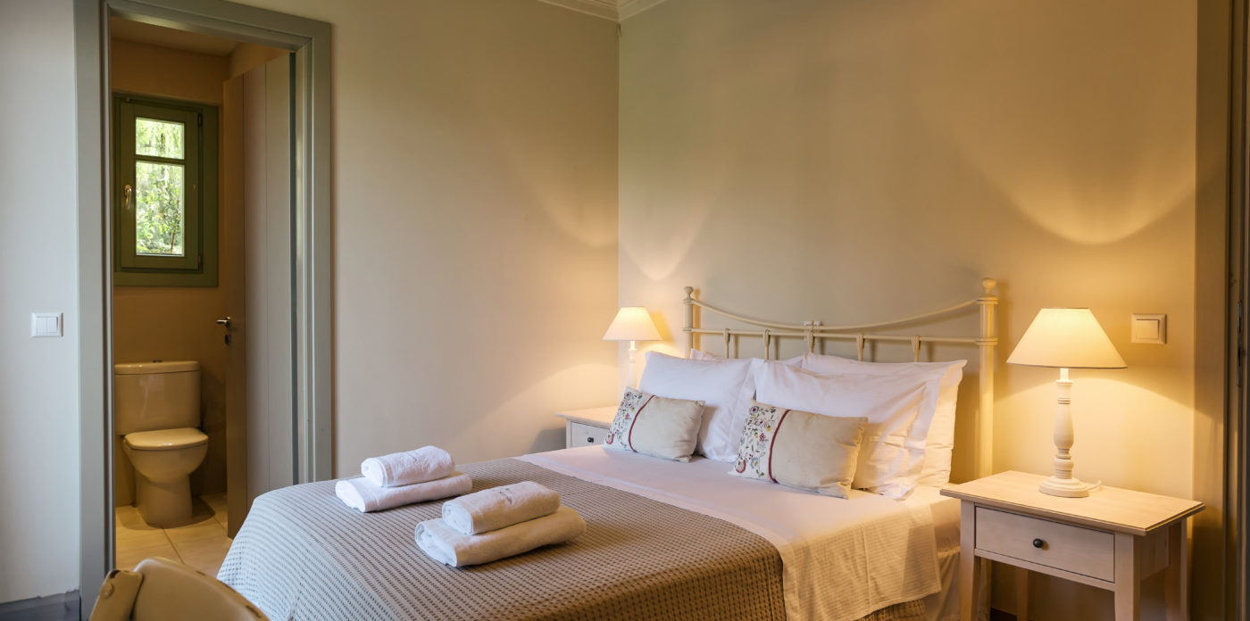 Adette has an open plan lounge–dining and kitchen area and is surrounded by large floor to ceiling windows allowing light and air to flood in. The fully equipped kitchen offers inspiration for the cooking fans and the dining area offers amazing views of Scorpios island. The living room is modern and comfortable with many openings that allow ample light and amazing views of the villa’s colourful garden.