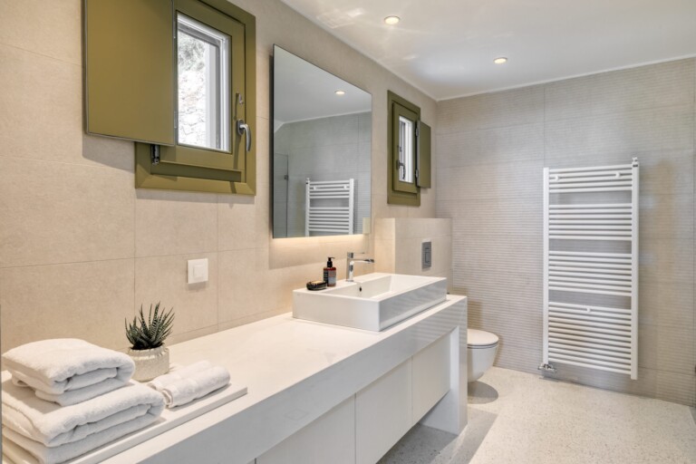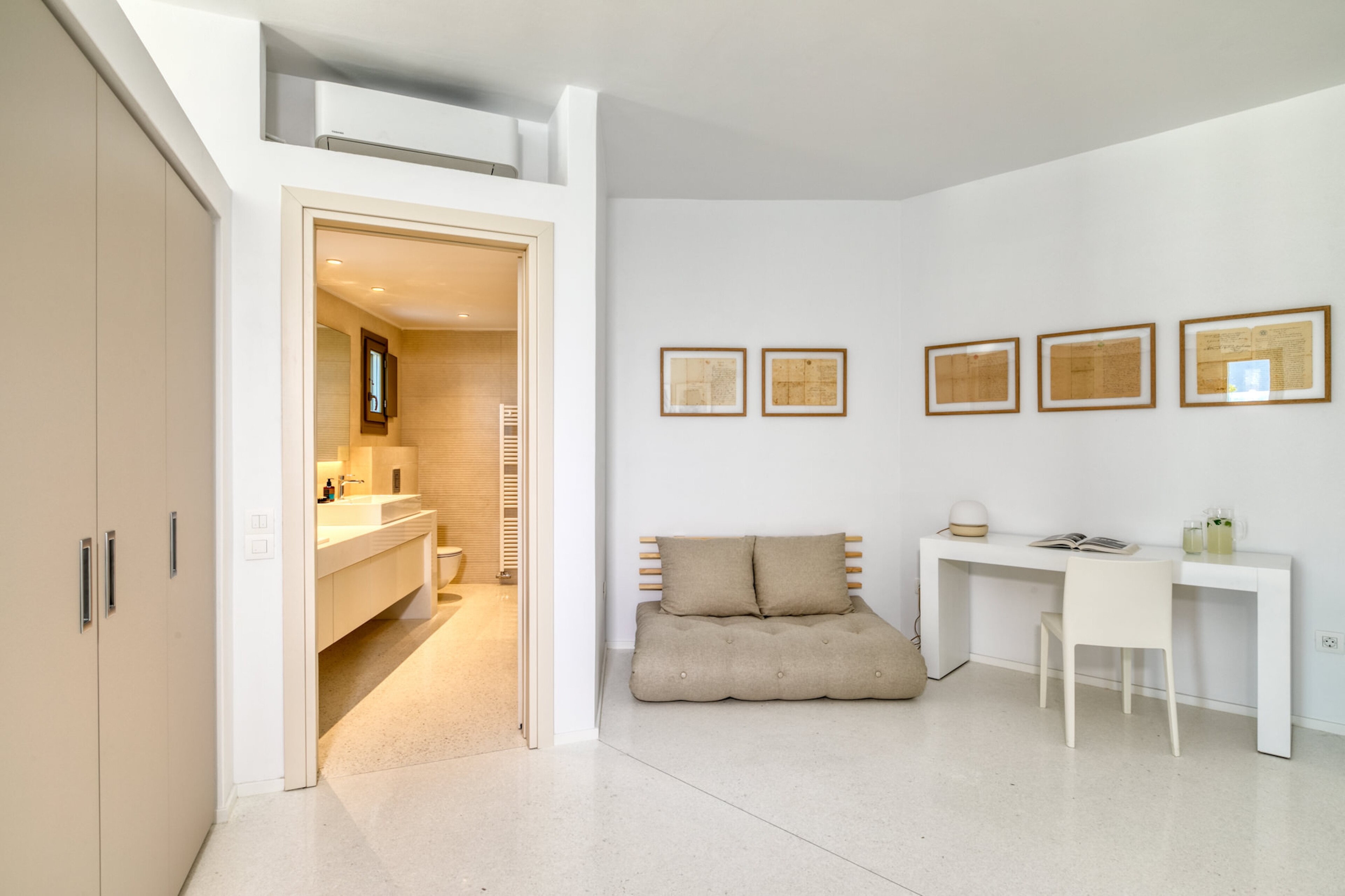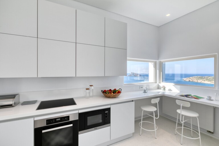 The villa spans 280 m² and accommodates up to eight guests, with four appointed bedrooms and five bathrooms. All bedrooms are located on the lower level for cool, restful nights, while the upper level features a bright, open-plan living and dining area framed by large windows and terraces that look out over the sea. The fully equipped kitchen includes modern appliances and a wine fridge, making it ideal for relaxed meals at home.