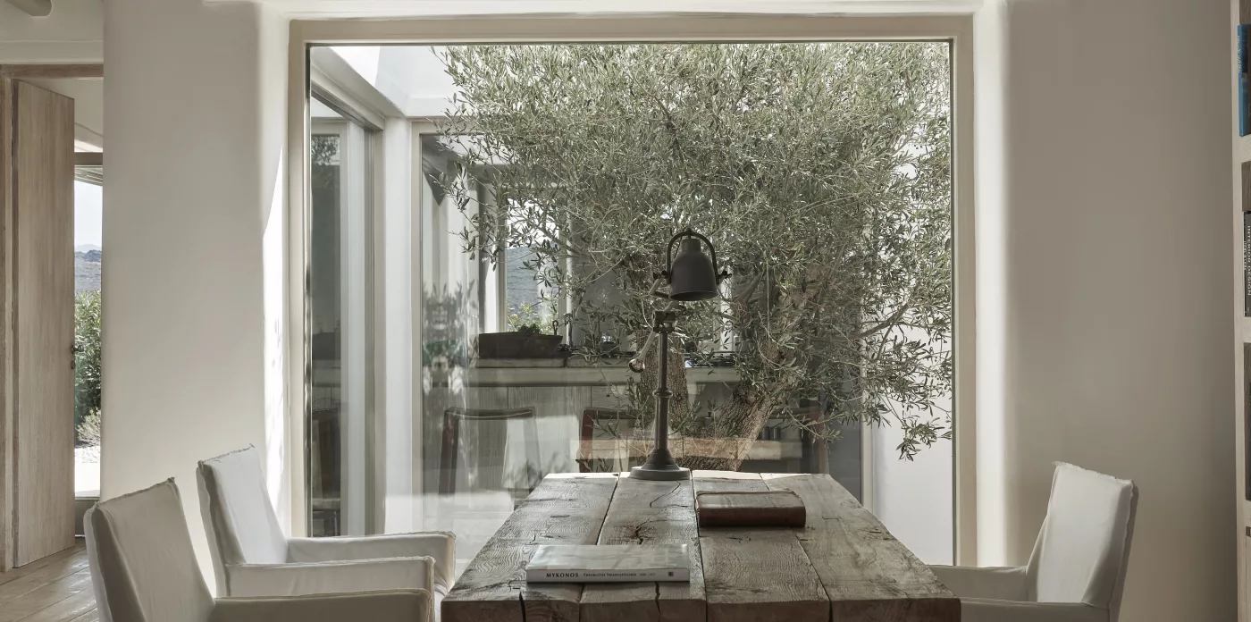 The entrance to the villa is via an impressive vestibule with a free standing wall beyond which the pool and terrace can be glimpsed at each side.The L-shaped living room runs the full length of the house, with so many french doors in a wall of folding doors to the terrace that it feels like an open- air pavilion rather than a room. One end of the L is a small sitting room with card table the other end is a large kitchen. In between are the living room, dining area and study area.