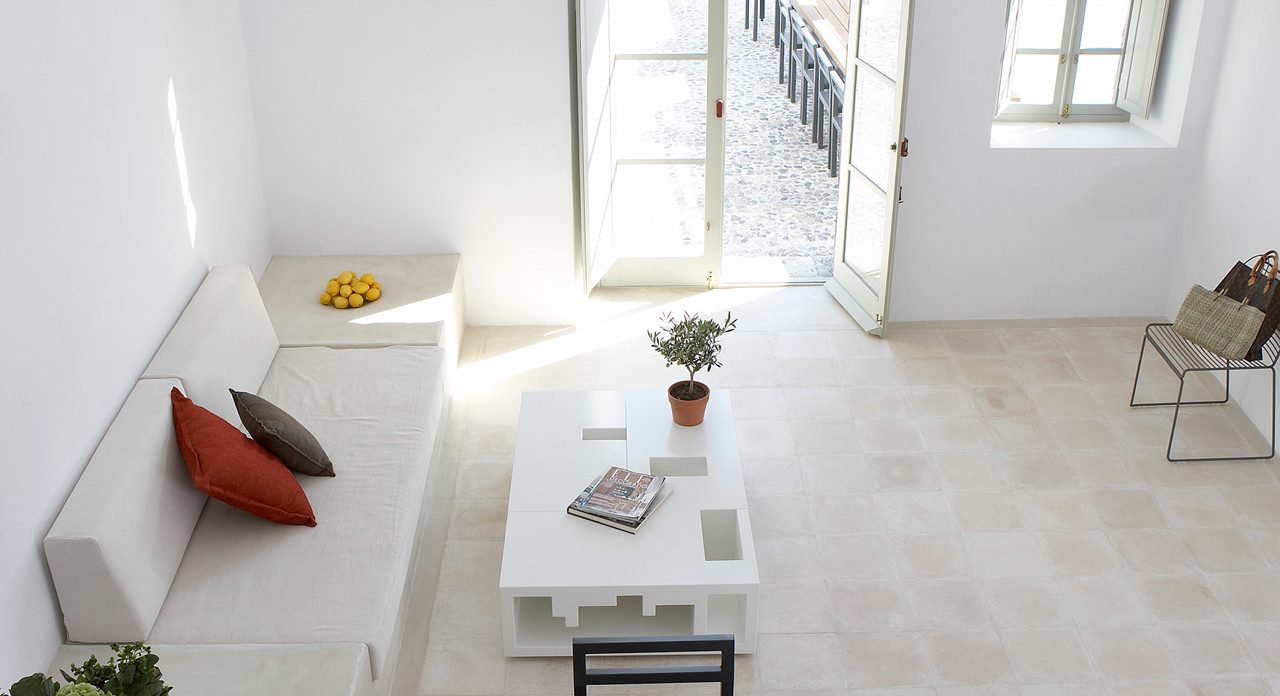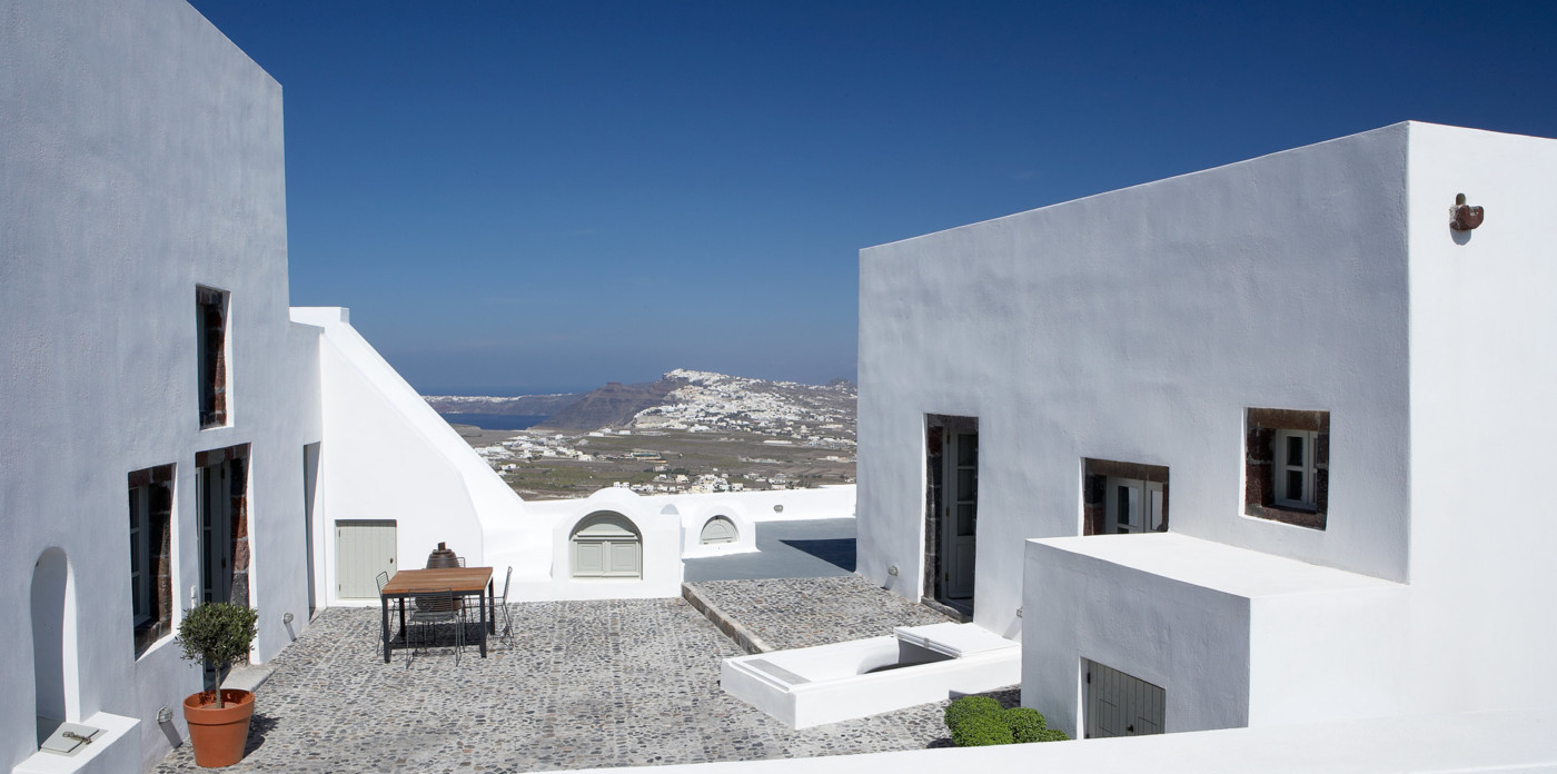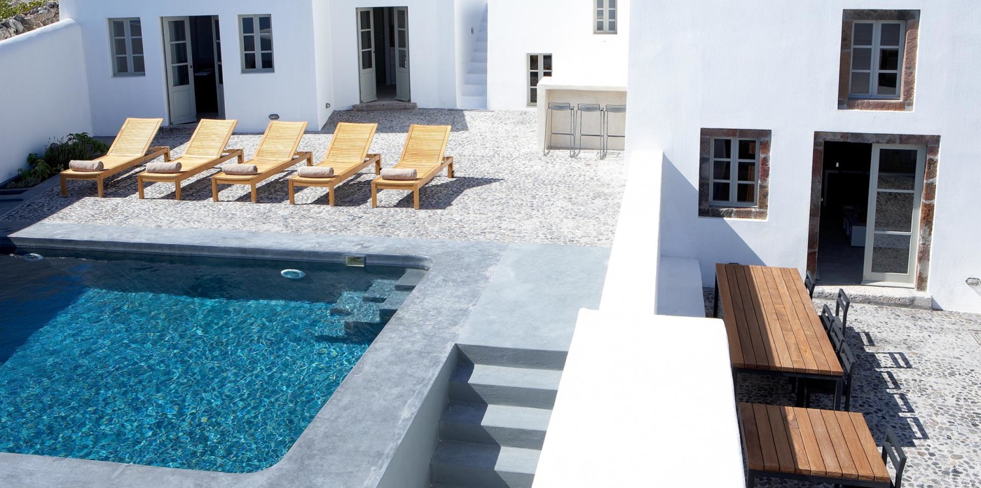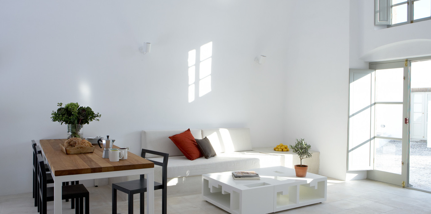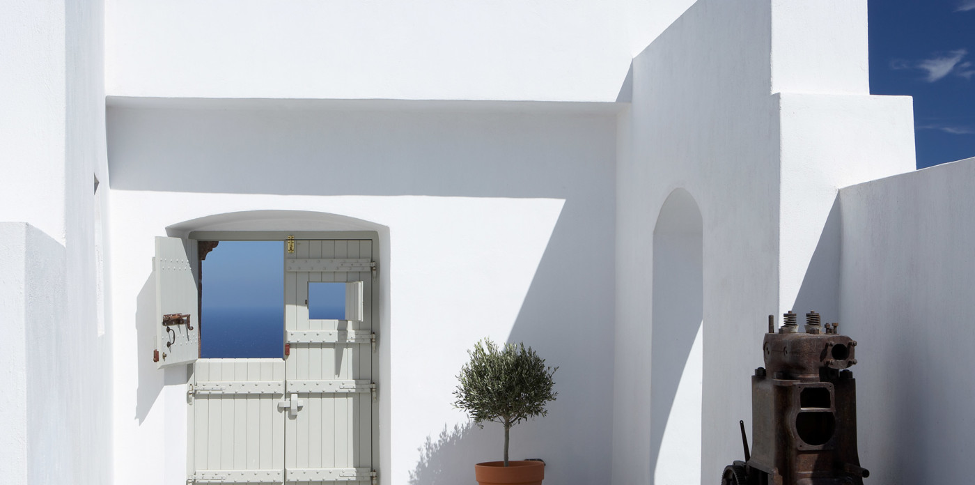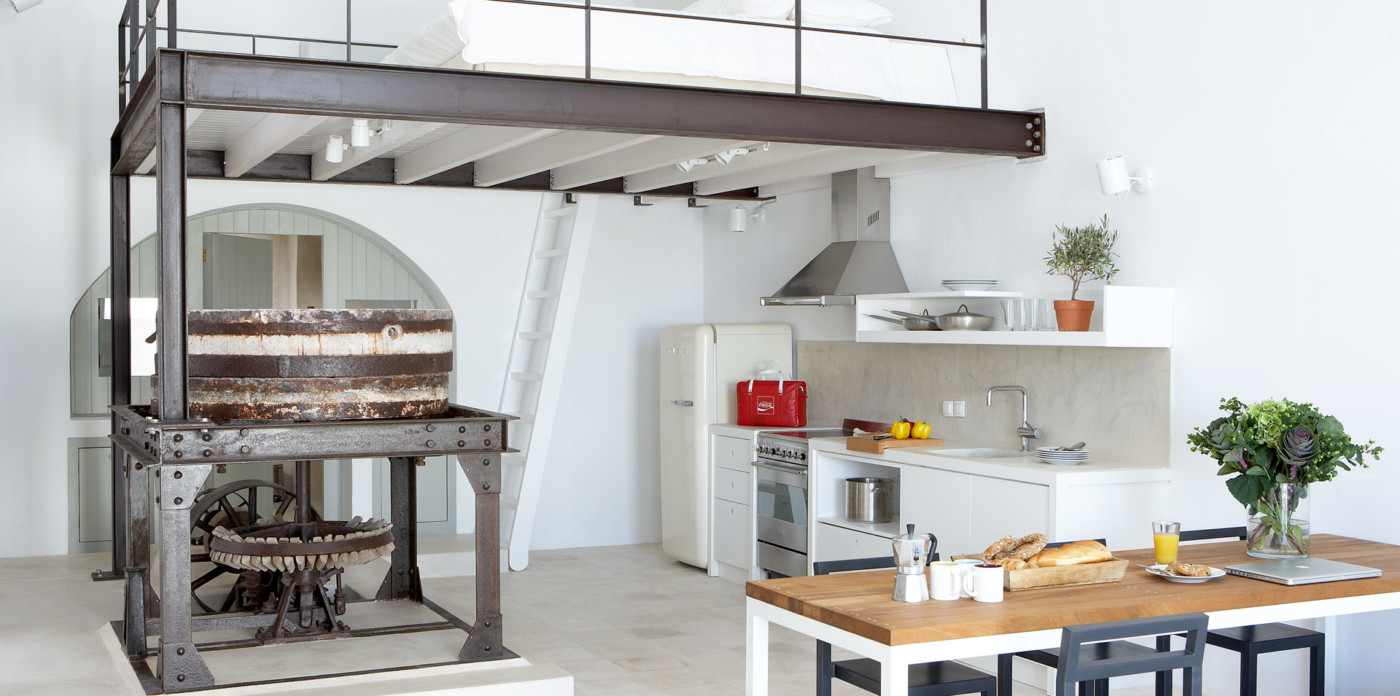Anais has a very sleek and minimal loft–style design, and has been restored with a deep understanding for its traditional Santorini architecture using the old style of polished cement and eco–friendly materials. Elements of the factory have been incorporated into the design, and a huge piece of machinery stands like a magnificent sculpture as the centerpiece of one of the numerous living spaces.