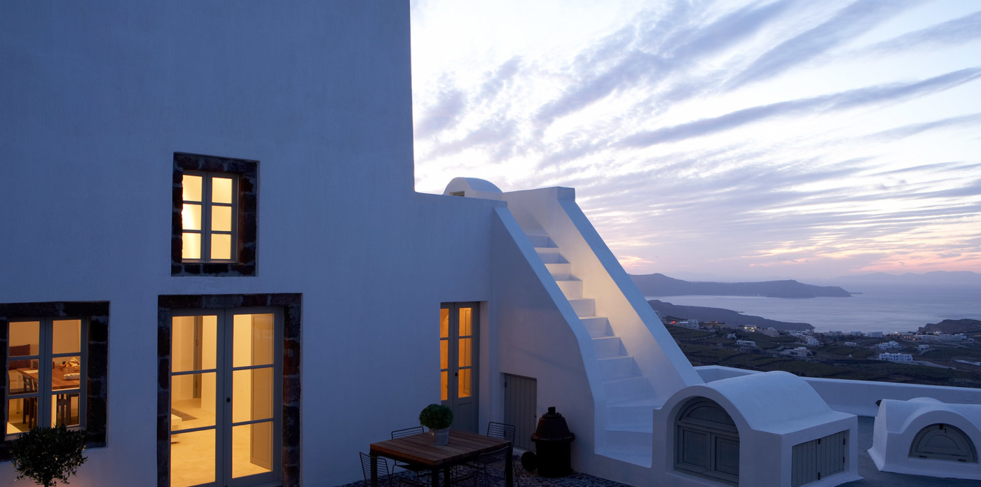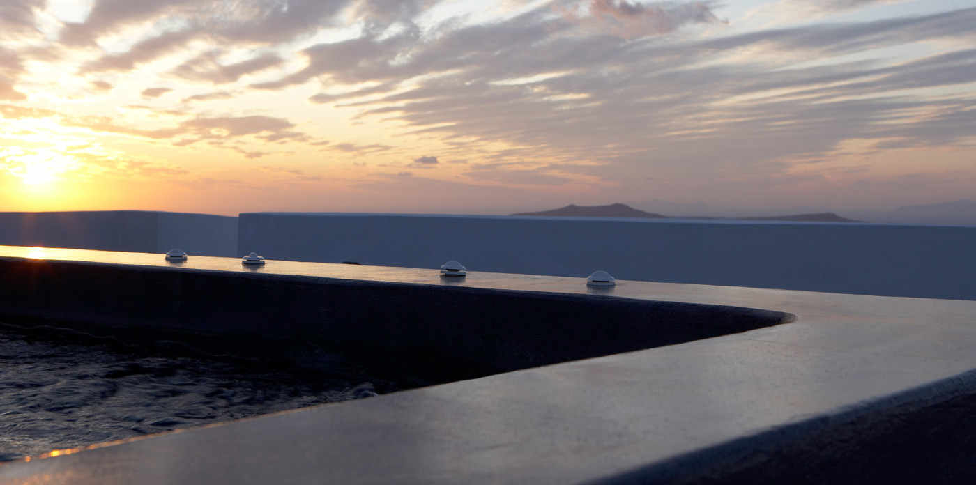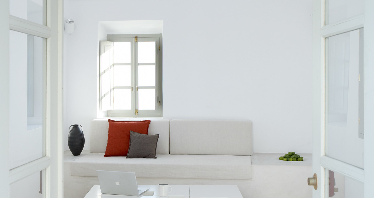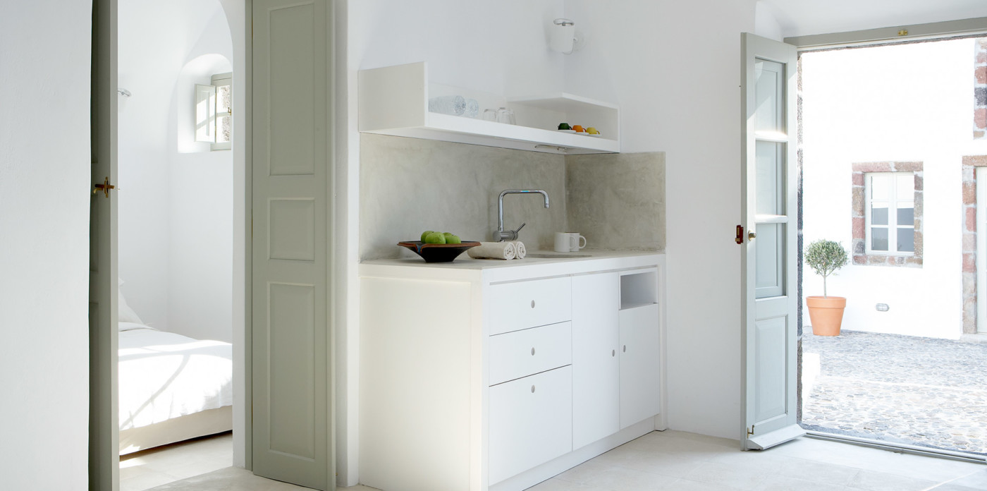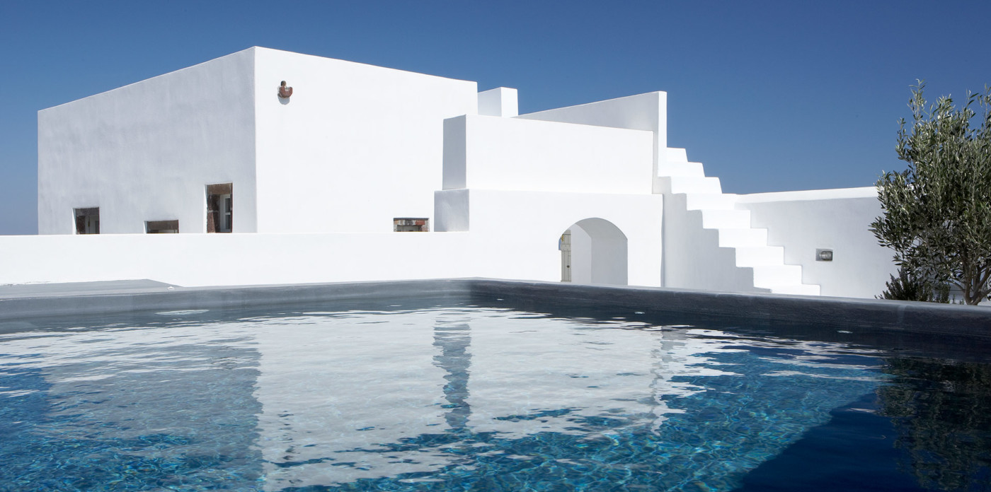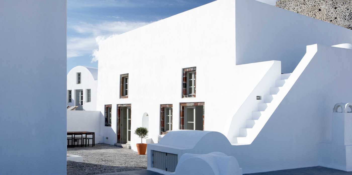 Anais has a very sleek and minimal loft–style design, and has been restored with a deep understanding for its traditional Santorini architecture using the old style of polished cement and eco–friendly materials. Elements of the factory have been incorporated into the design, and a huge piece of machinery stands like a magnificent sculpture as the centerpiece of one of the numerous living spaces.