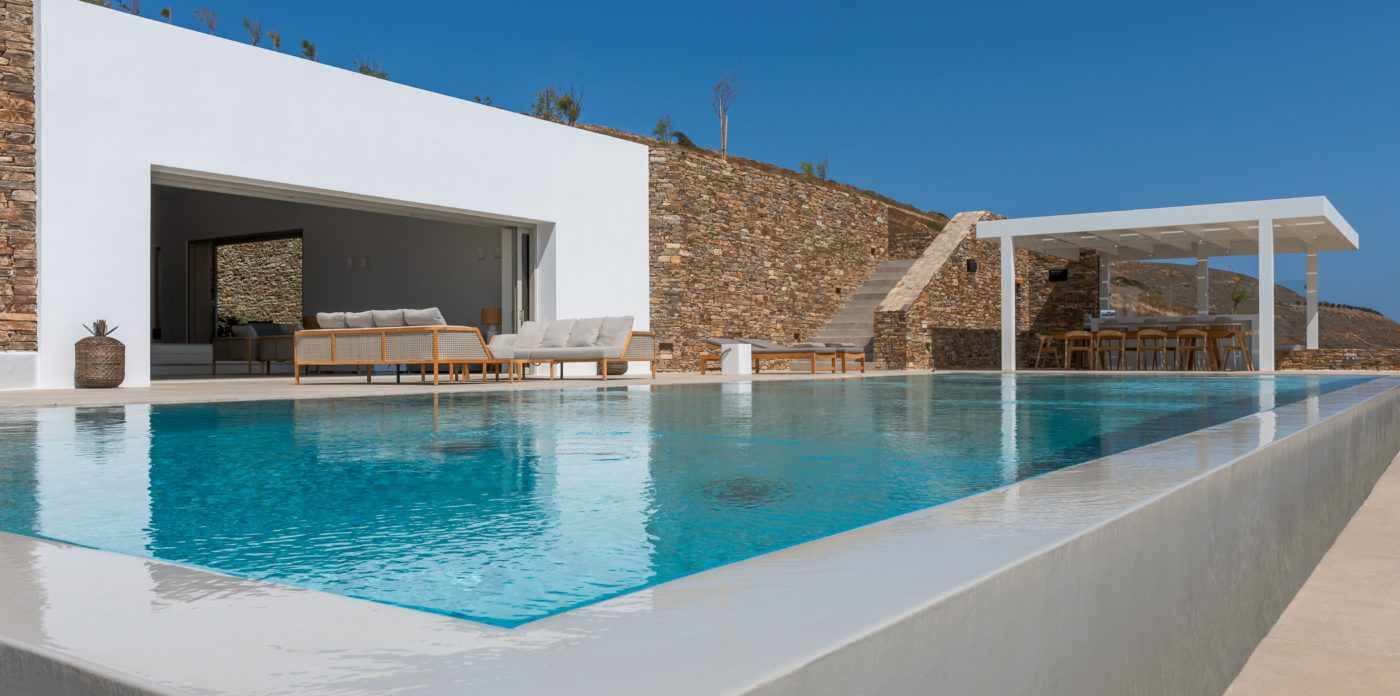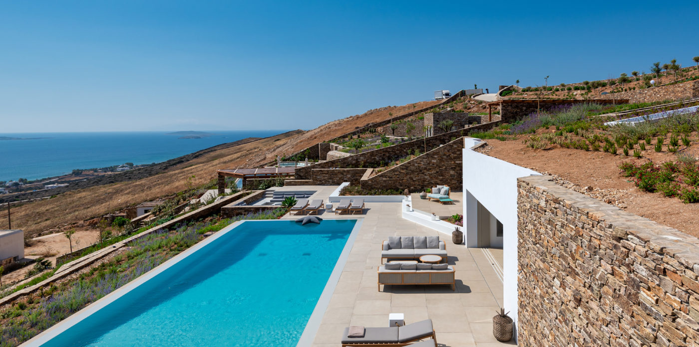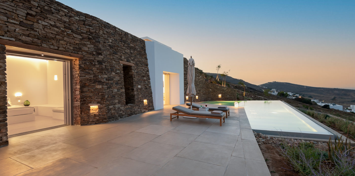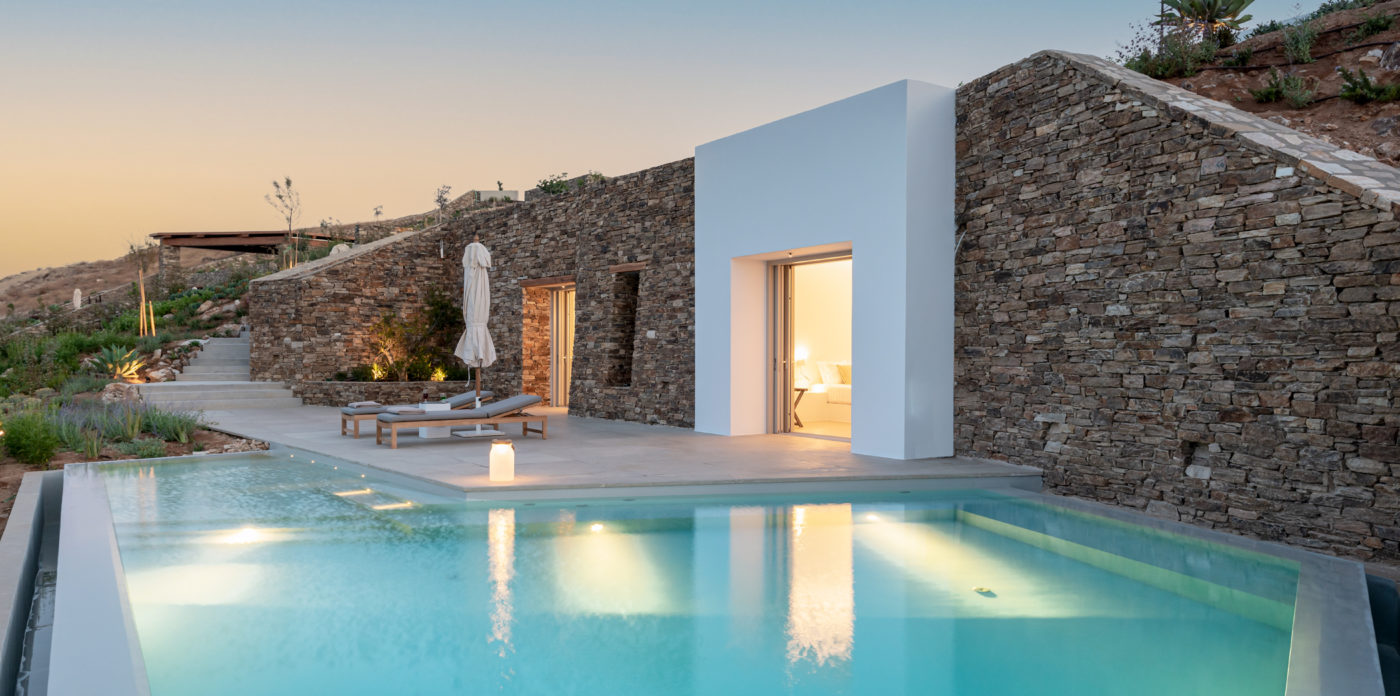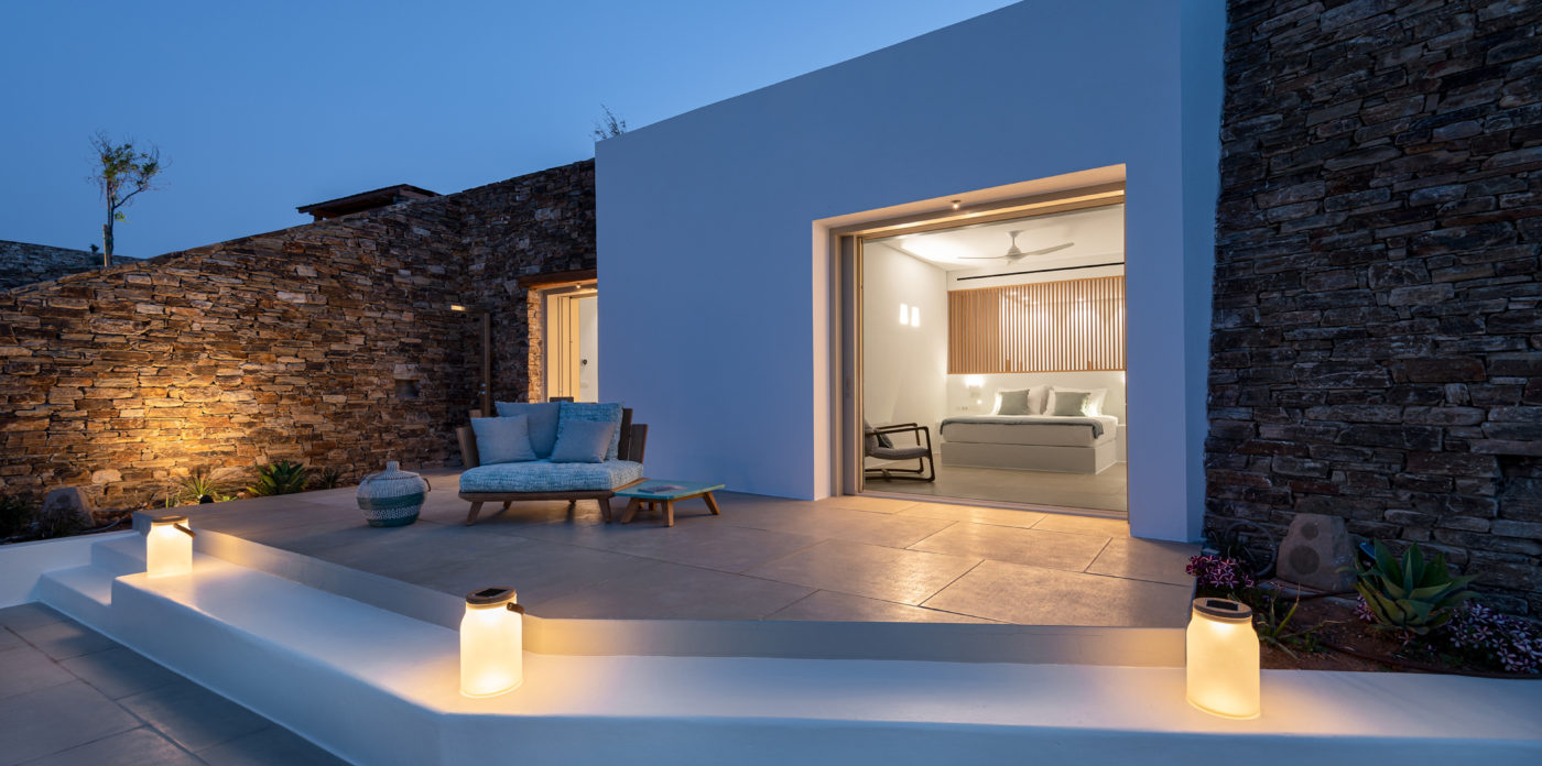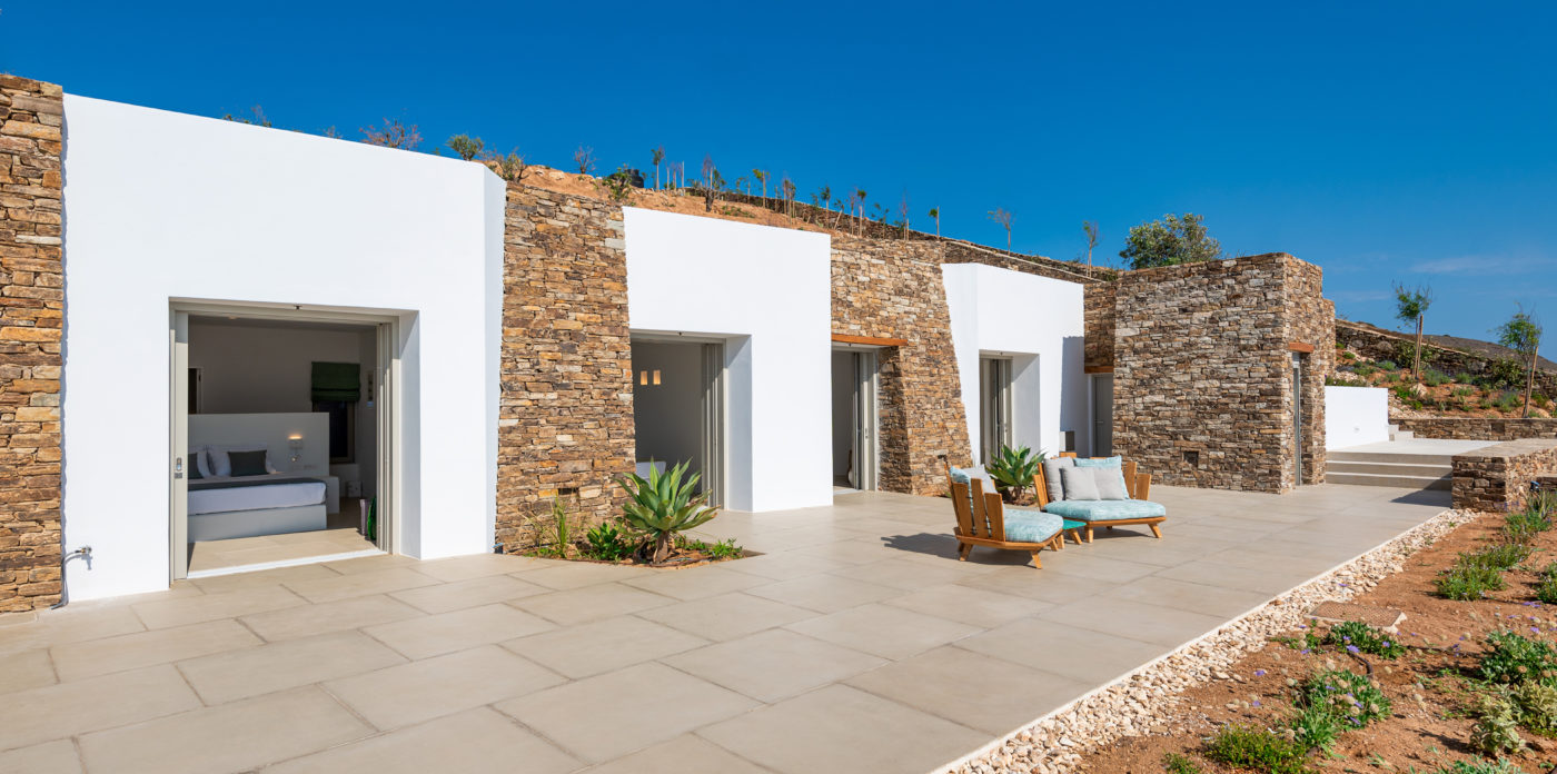 Anima’s architectural design intends to integrate the building into the natural environment with the use of local stone and the design of white volumes, as found in the traditional architecture of Cyclades.