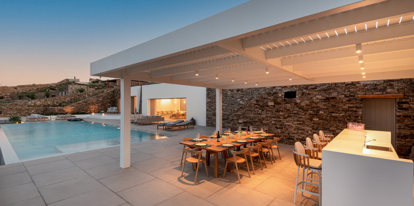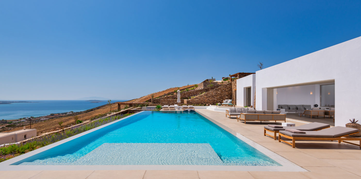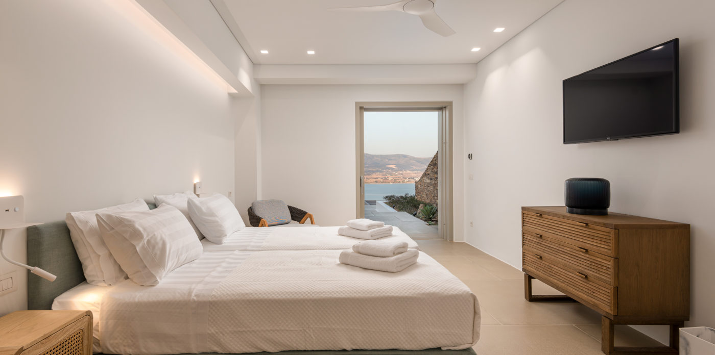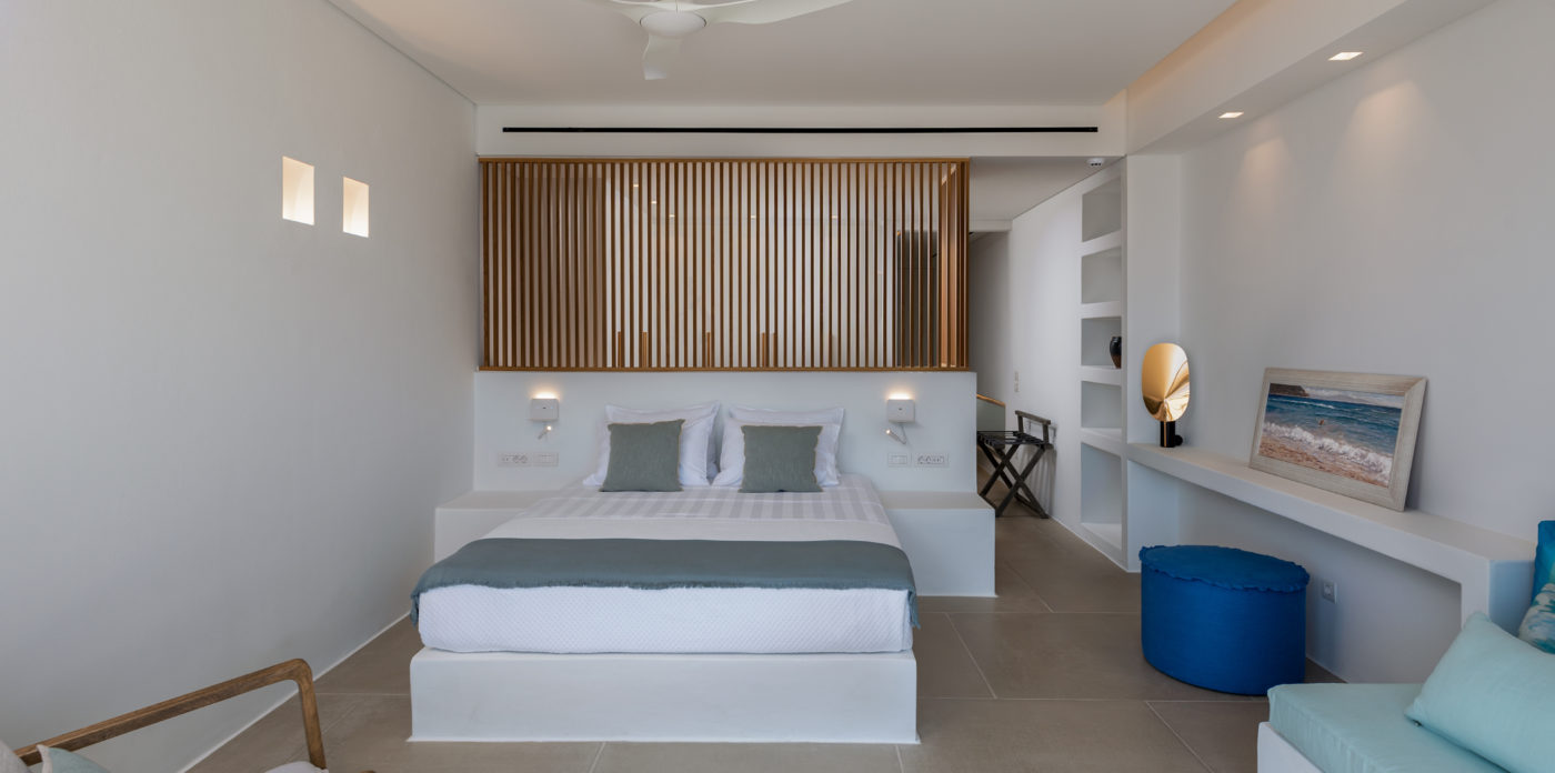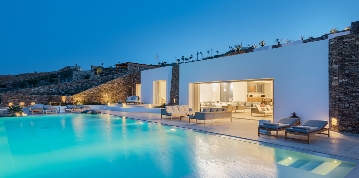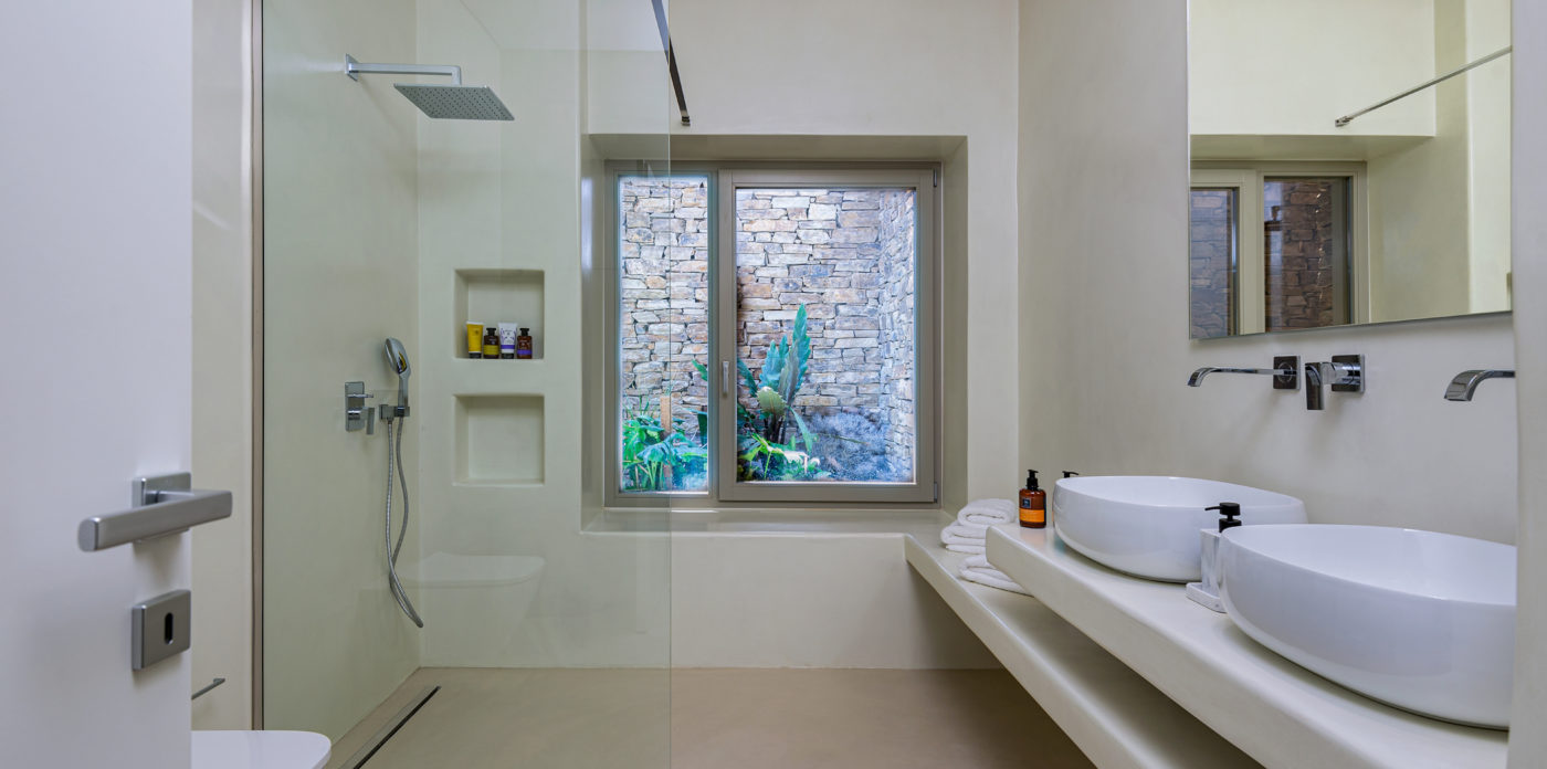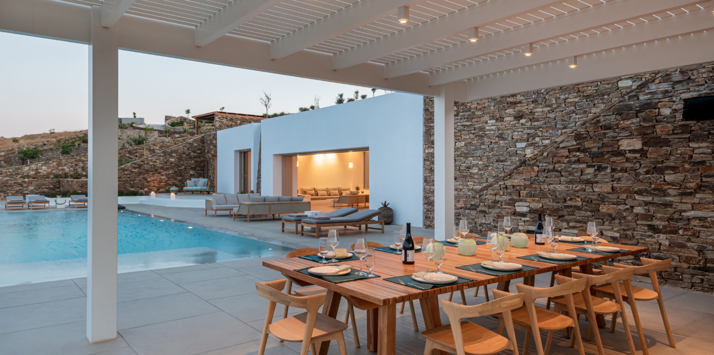 Anima’s architectural design intends to integrate the building into the natural environment with the use of local stone and the design of white volumes, as found in the traditional architecture of Cyclades.