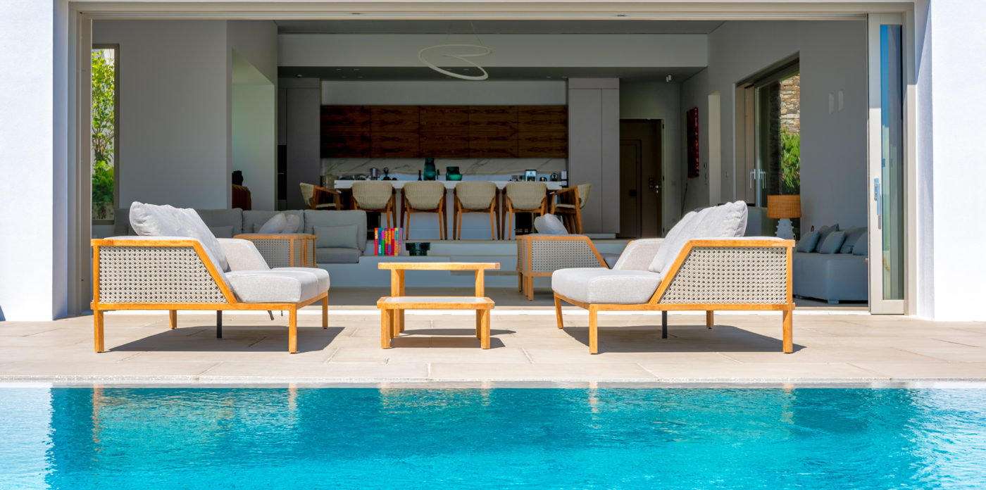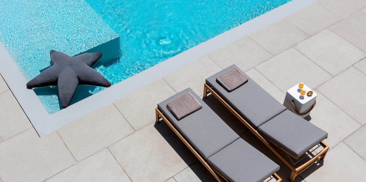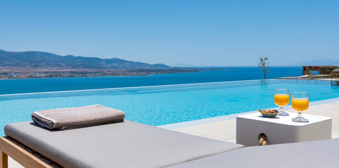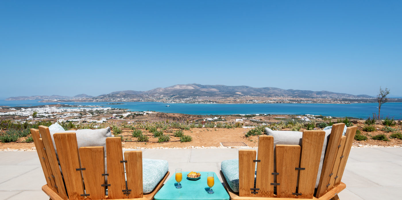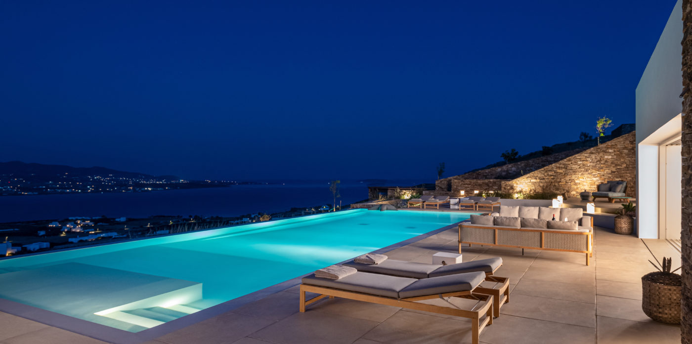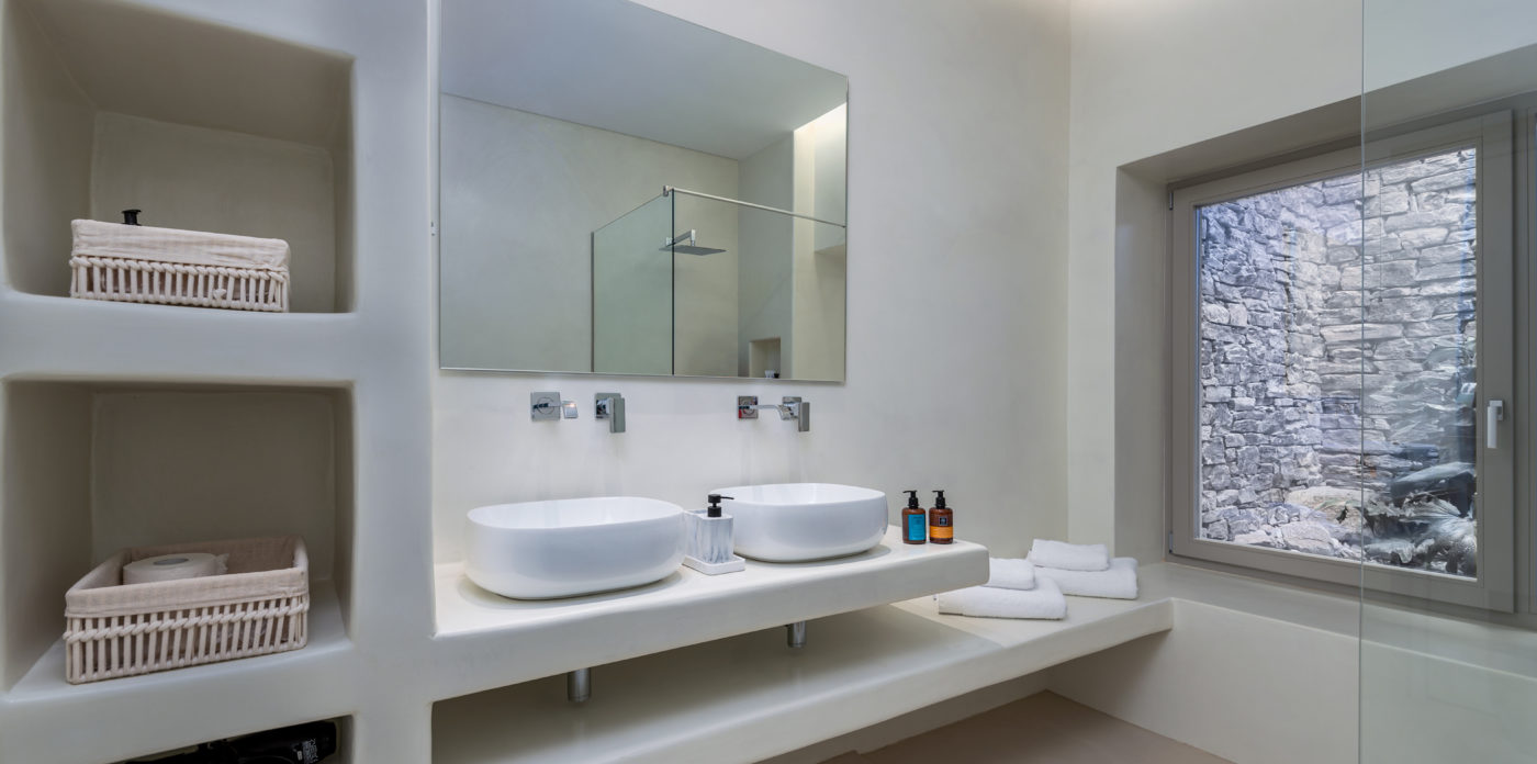 Anima’s architectural design intends to integrate the building into the natural environment with the use of local stone and the design of white volumes, as found in the traditional architecture of Cyclades.