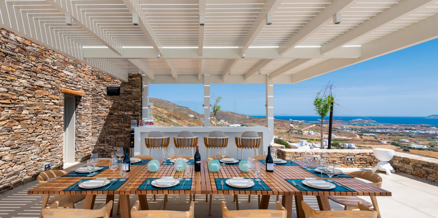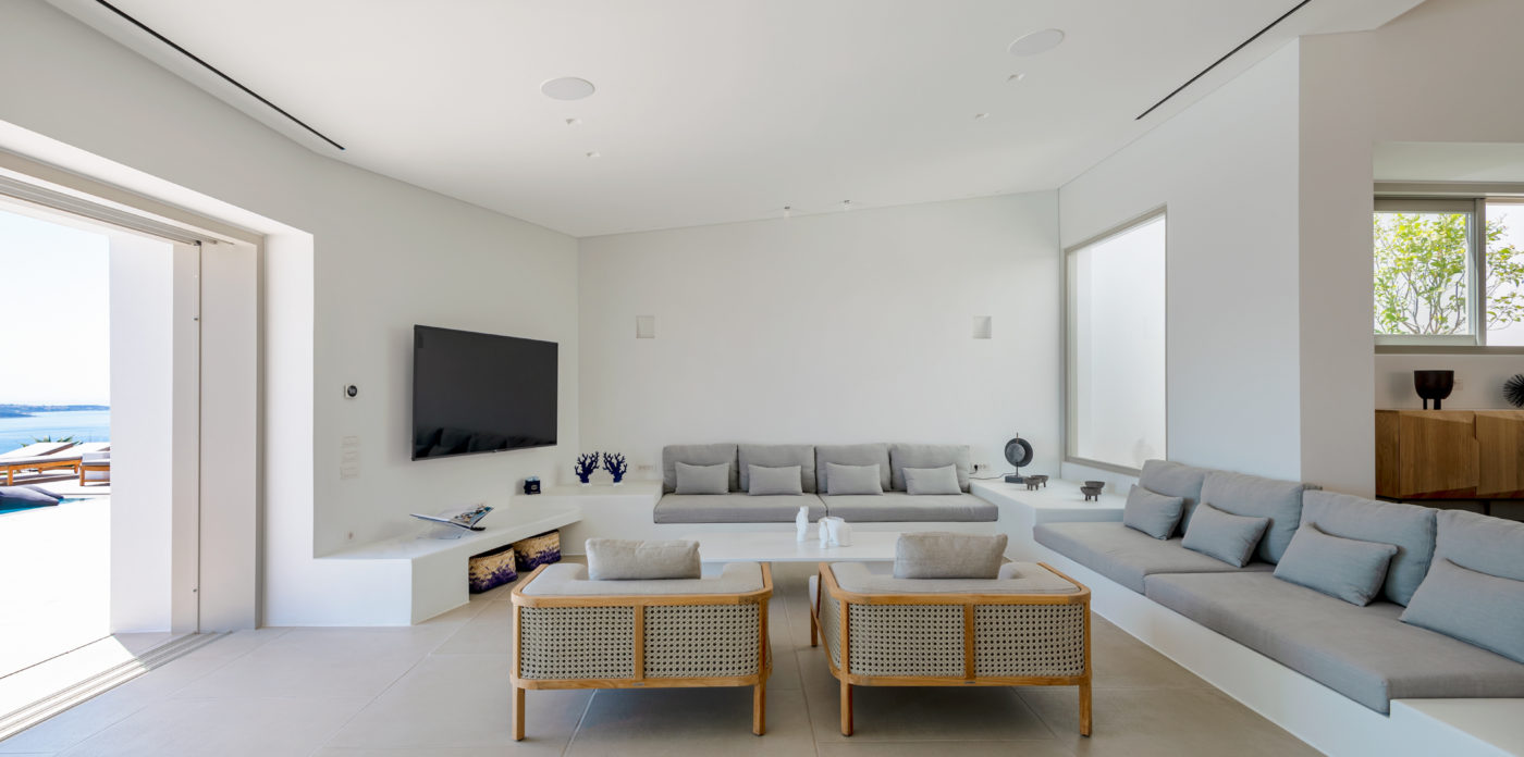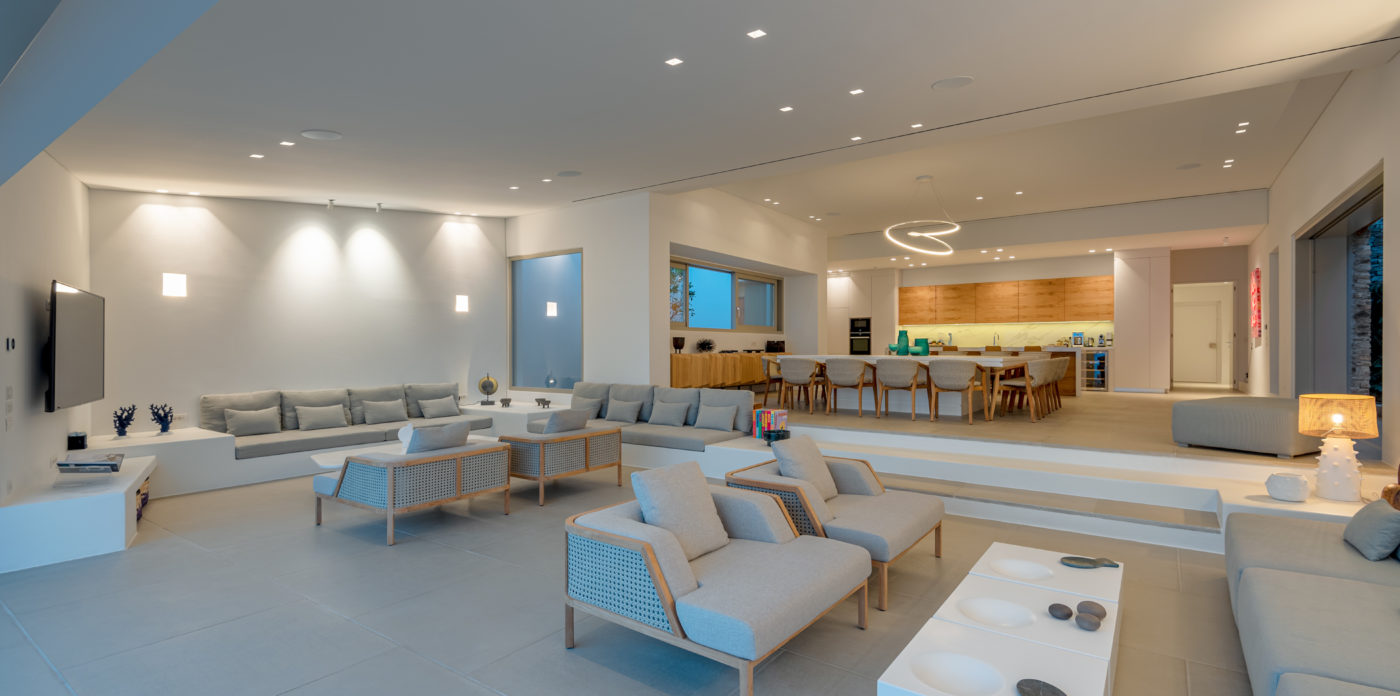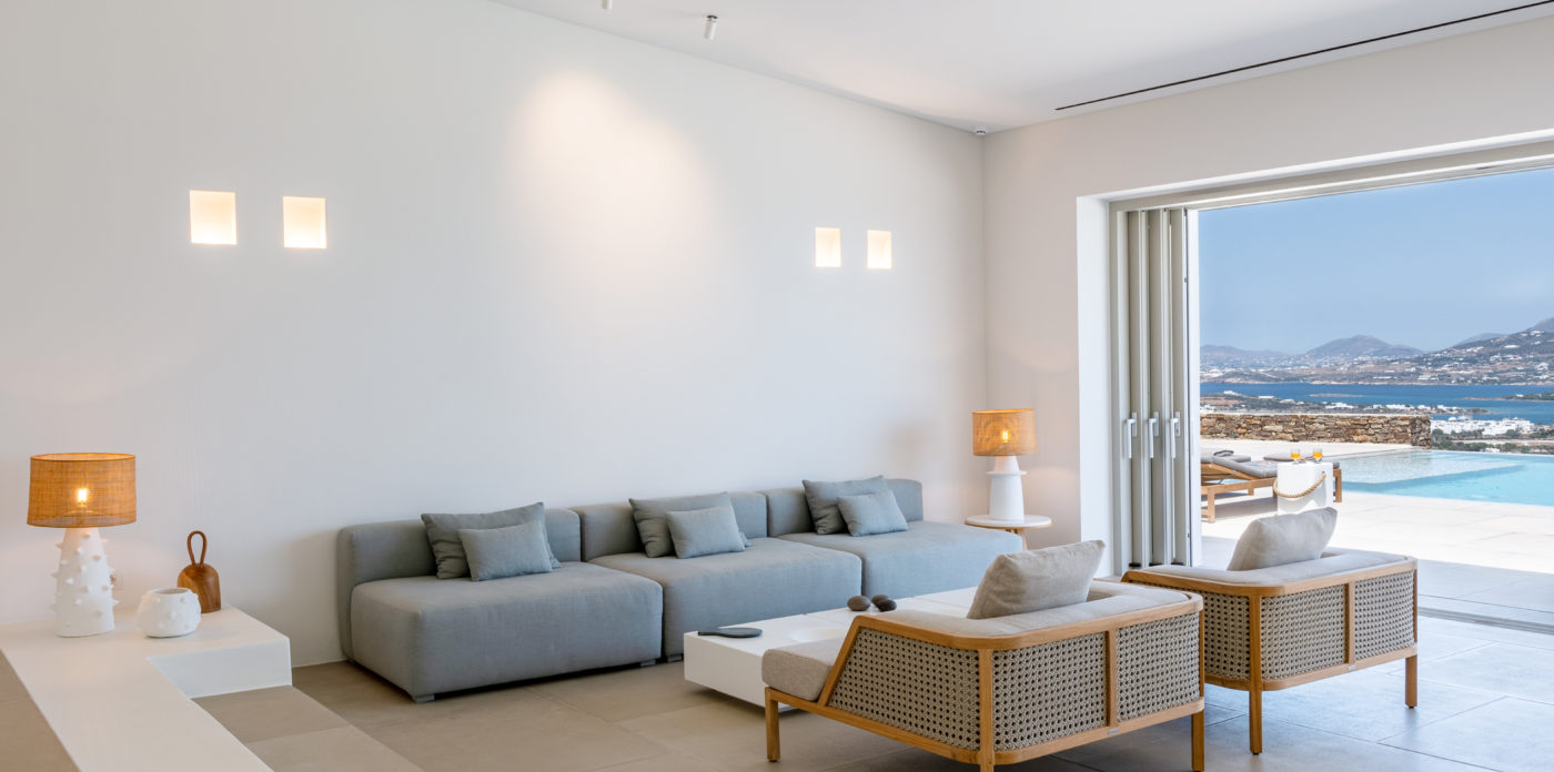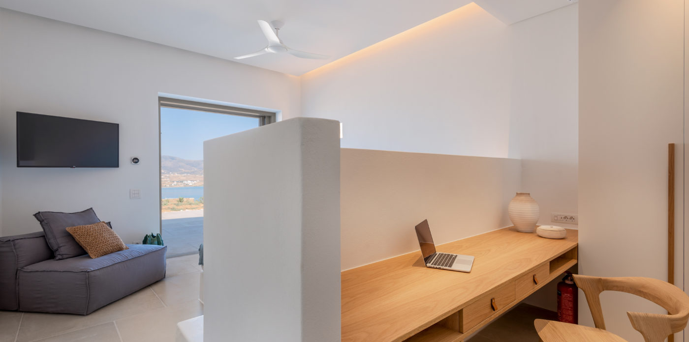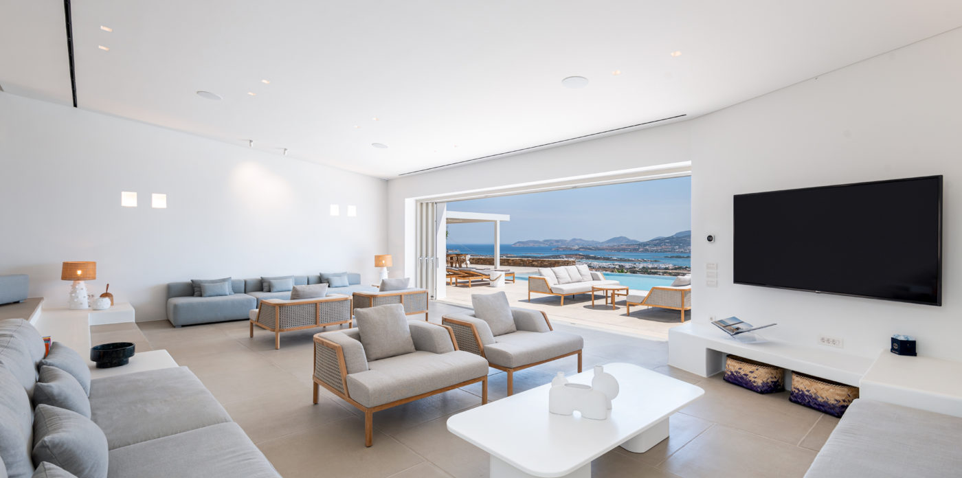The living room of 150sqm boasts a fully unobstructed view of the sea and the island of Paros. It consists of the living area, dining area, the main open layout kitchen, one secondary kitchen and guest WC. Anima is spread on three levels featuring different common areas, facilities and number of bedrooms as below;