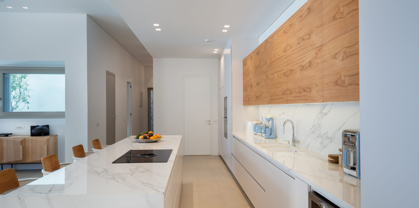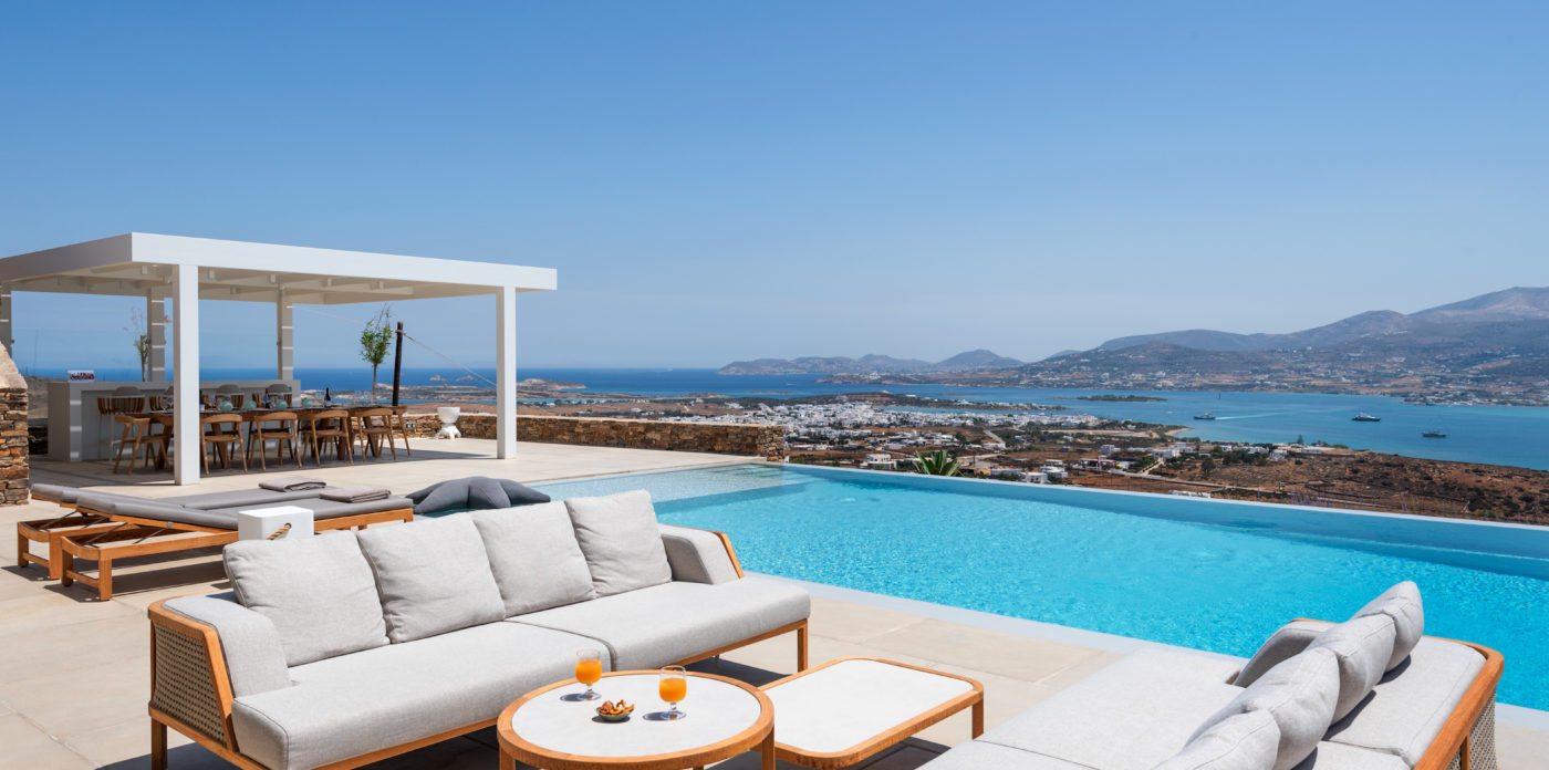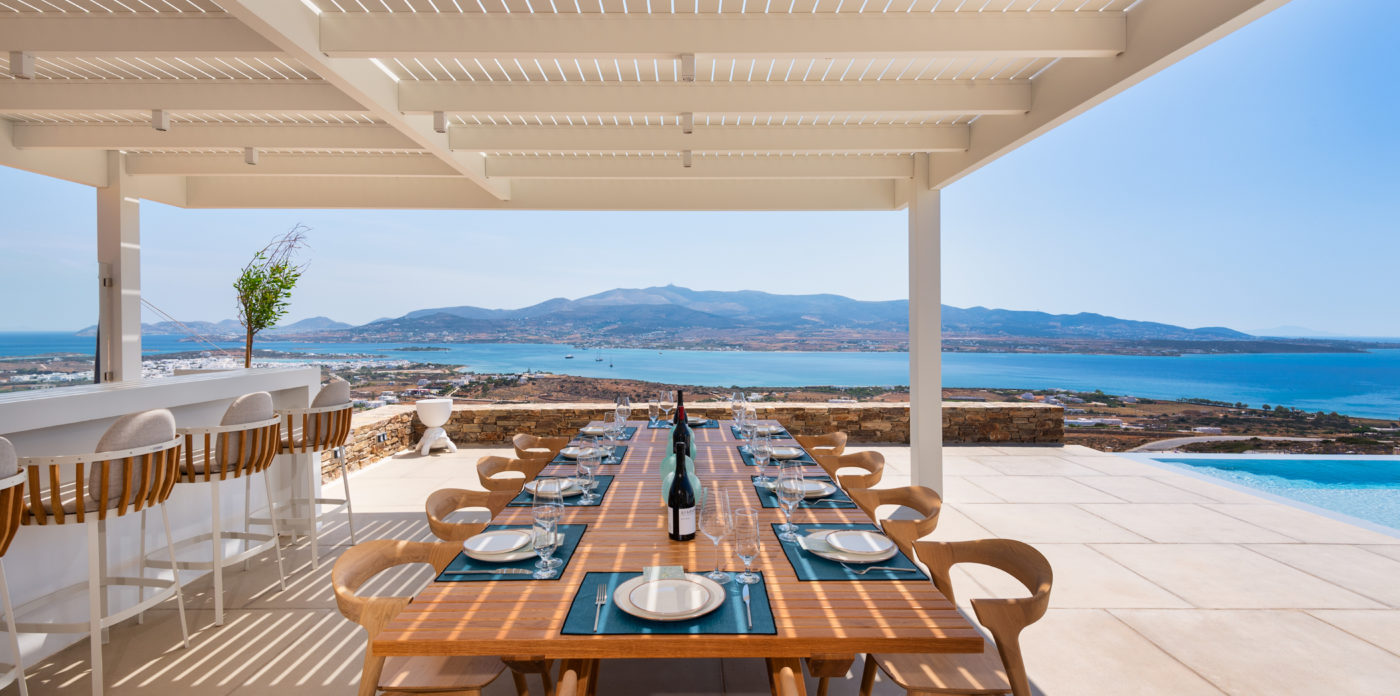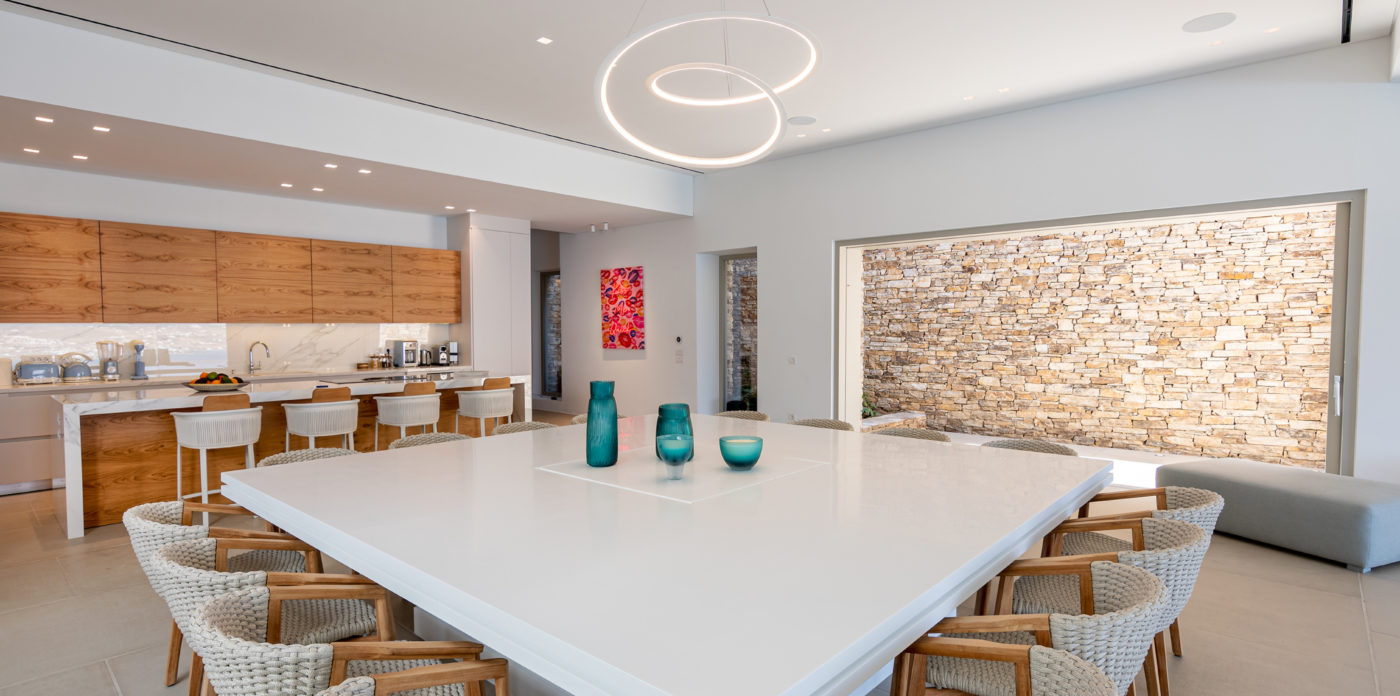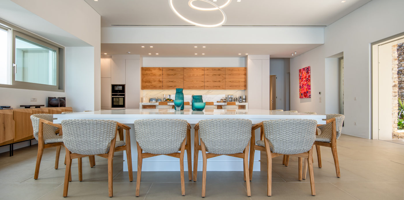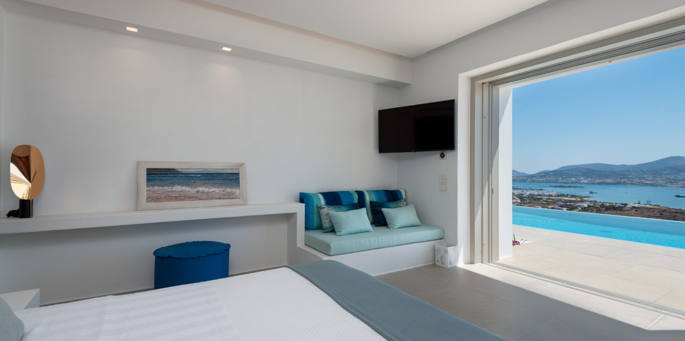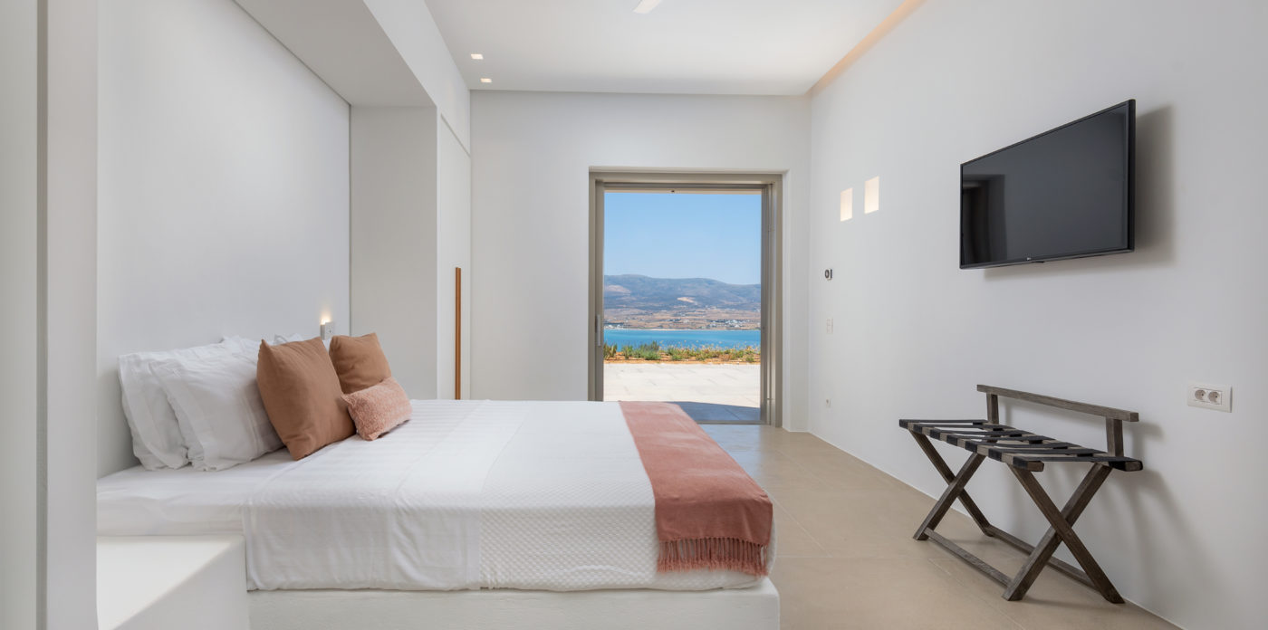The living room of 150sqm boasts a fully unobstructed view of the sea and the island of Paros. It consists of the living area, dining area, the main open layout kitchen, one secondary kitchen and guest WC. Anima is spread on three levels featuring different common areas, facilities and number of bedrooms as below;