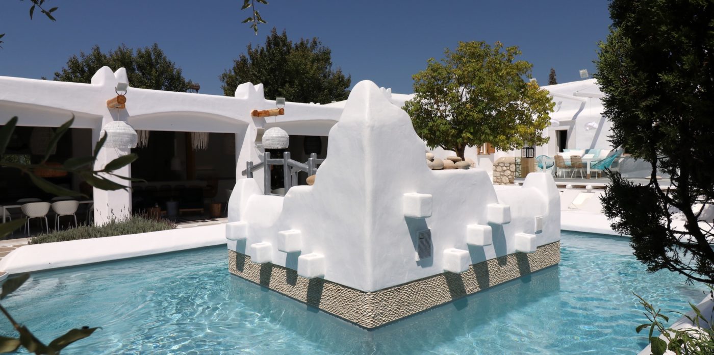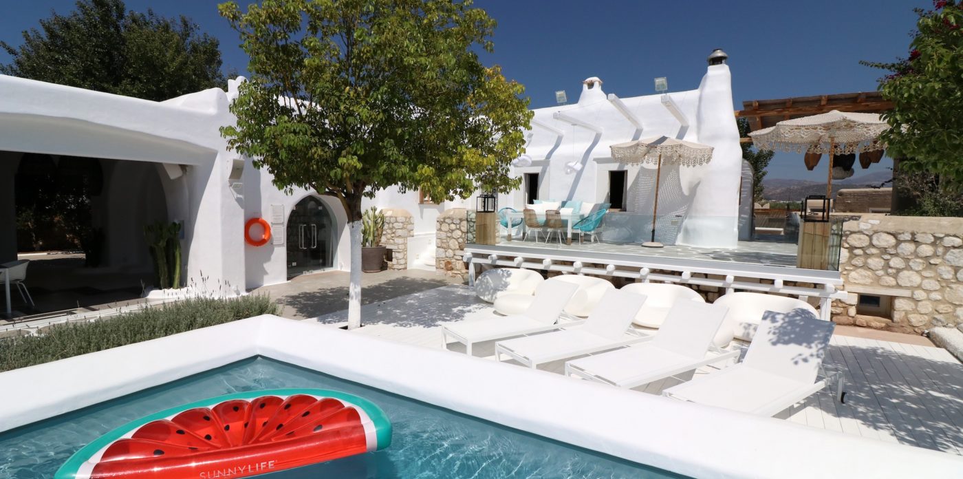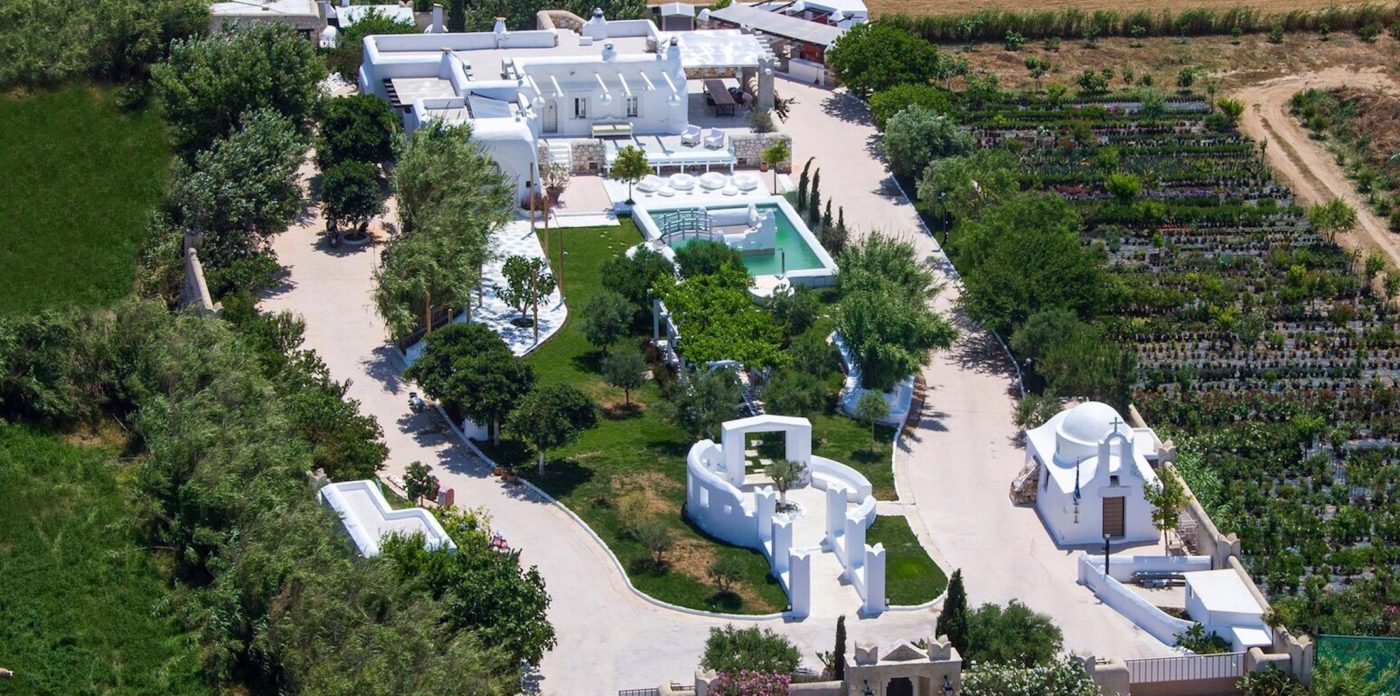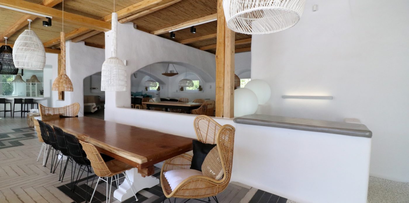 The exclusive 4000 sq.m private paradise may accommodate up to 16 guests and was constructed with respects to the Cycladic architecture. The interior’s design boasts touches of luxurious and famous labels and features traditional Naxian furniture and natural island materials. Everything is white washed style celebrating island living.